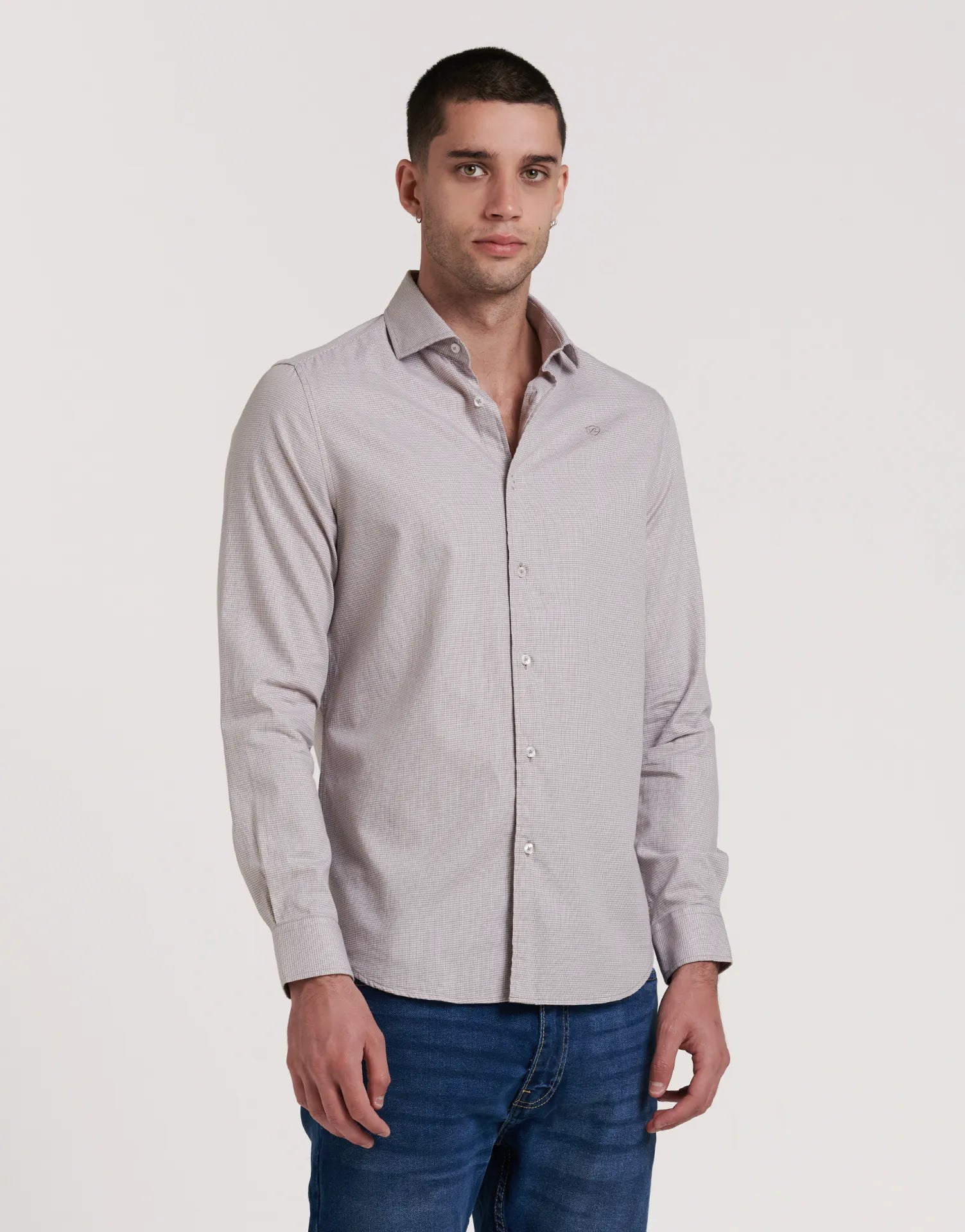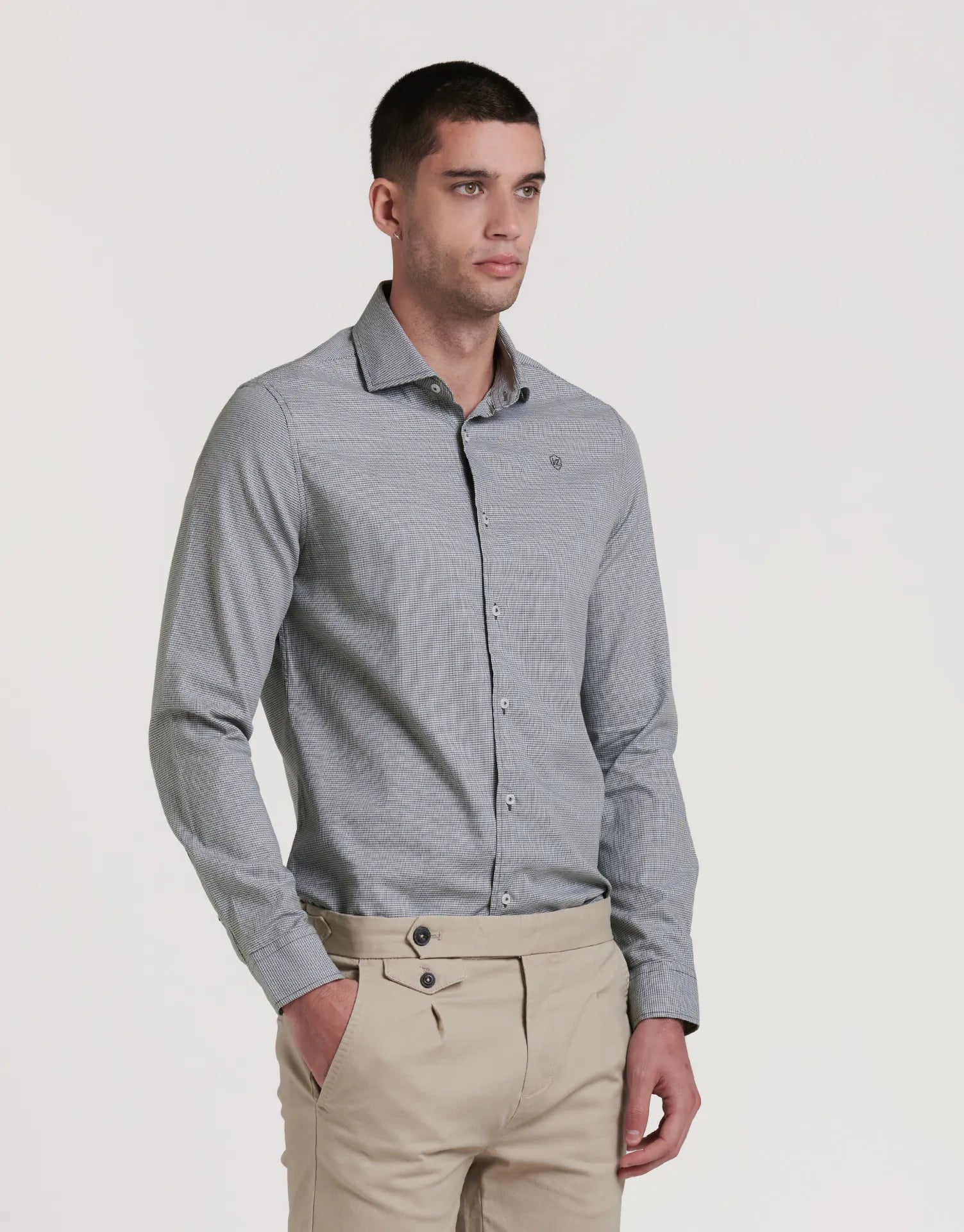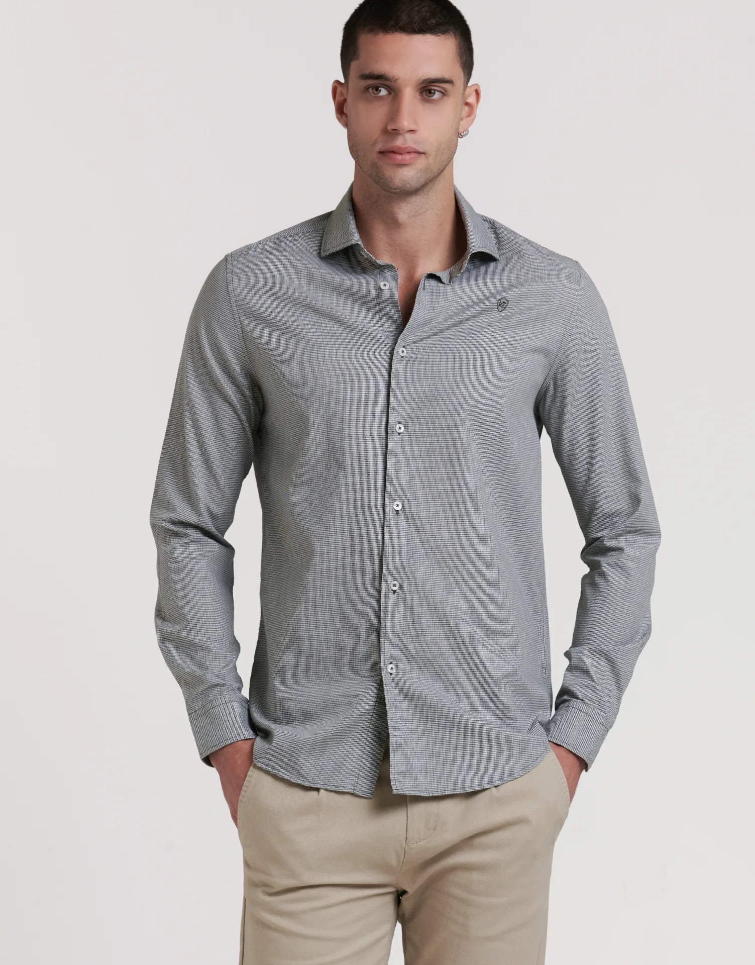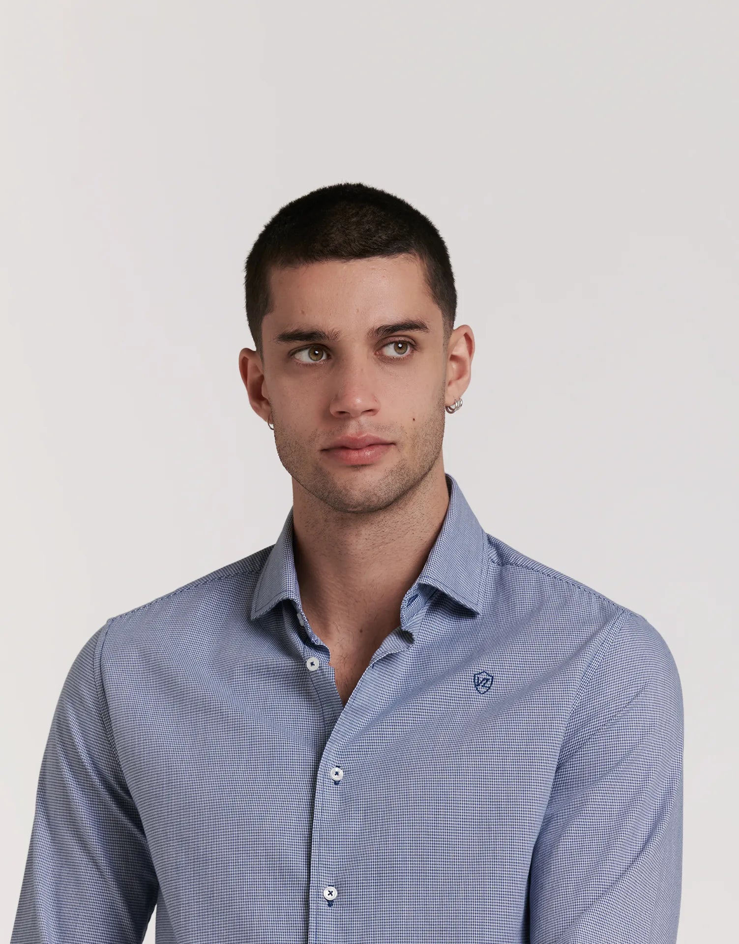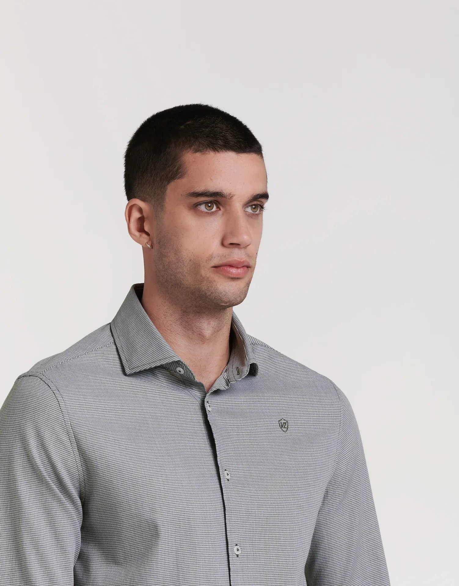La camisa micro pata de gallo slim fit de JVZ combina elegancia contemporánea y un diseño discreto pero sofisticado. Su microtextura aporta profundidad visual y un acabado distinguido, ideal tanto para looks de oficina como para estilo casual arreglado.