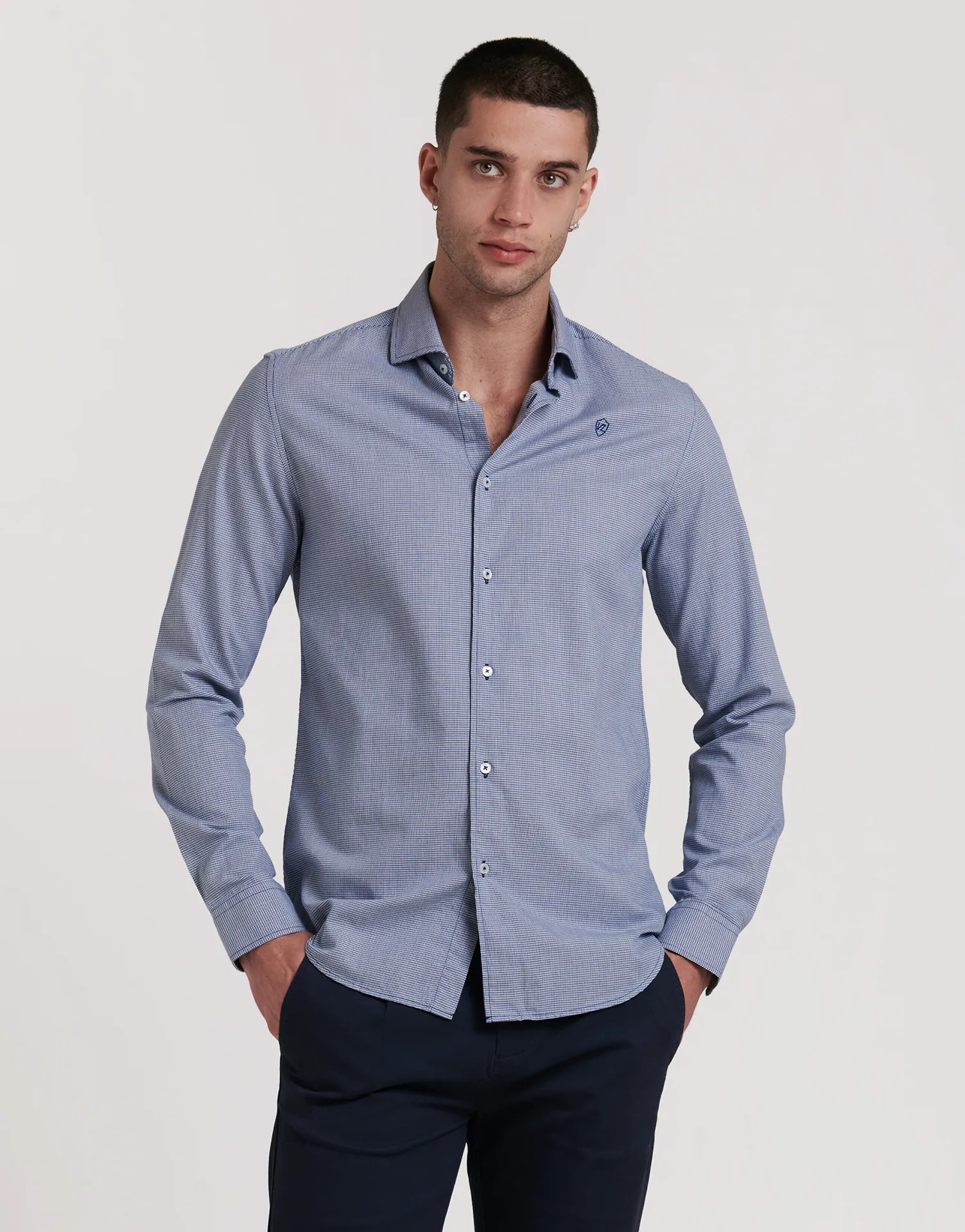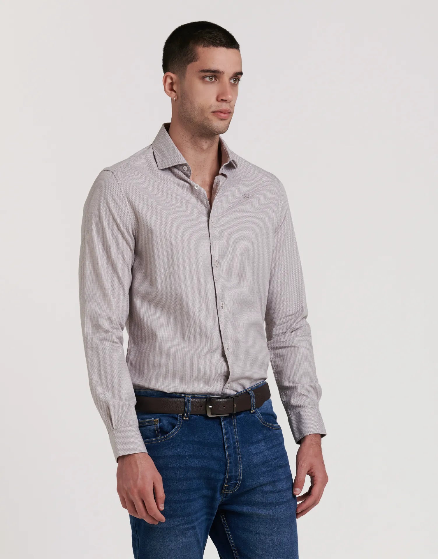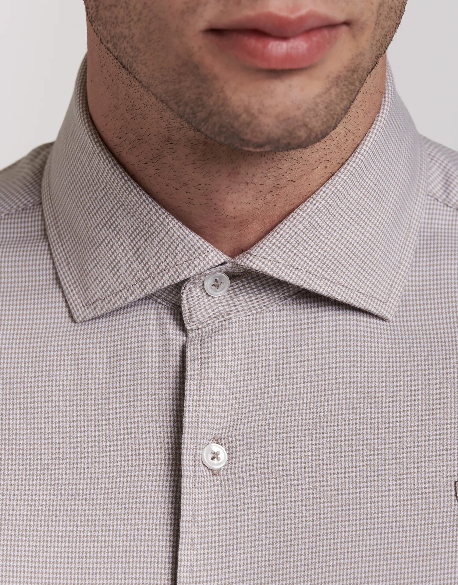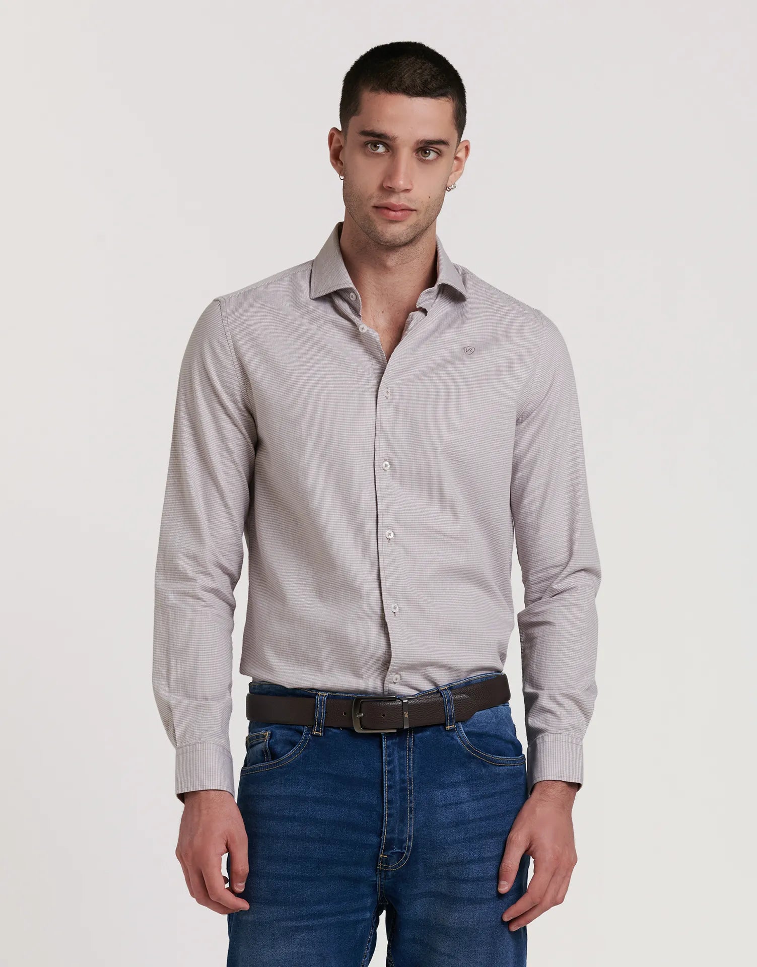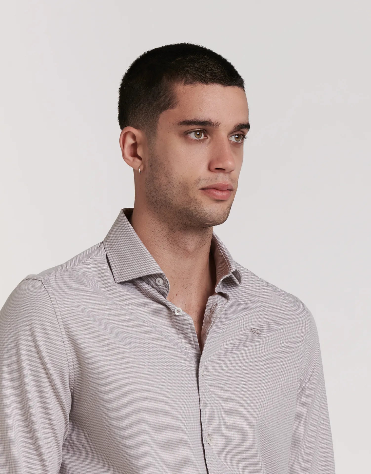 La camisa micro pata de gallo slim fit de JVZ combina elegancia contemporánea y un diseño discreto pero sofisticado. Su microtextura aporta profundidad visual y un acabado distinguido, ideal tanto para looks de oficina como para estilo casual arreglado.