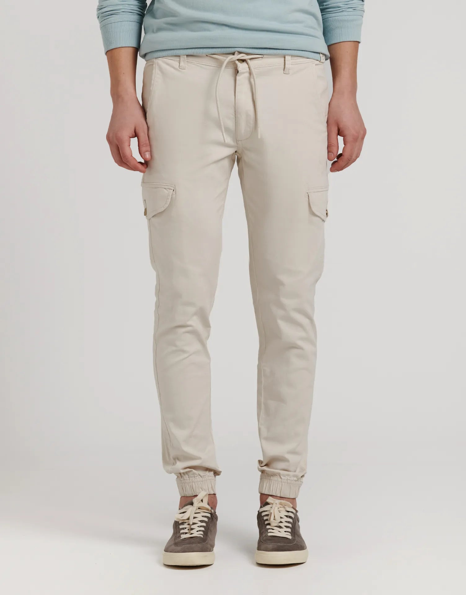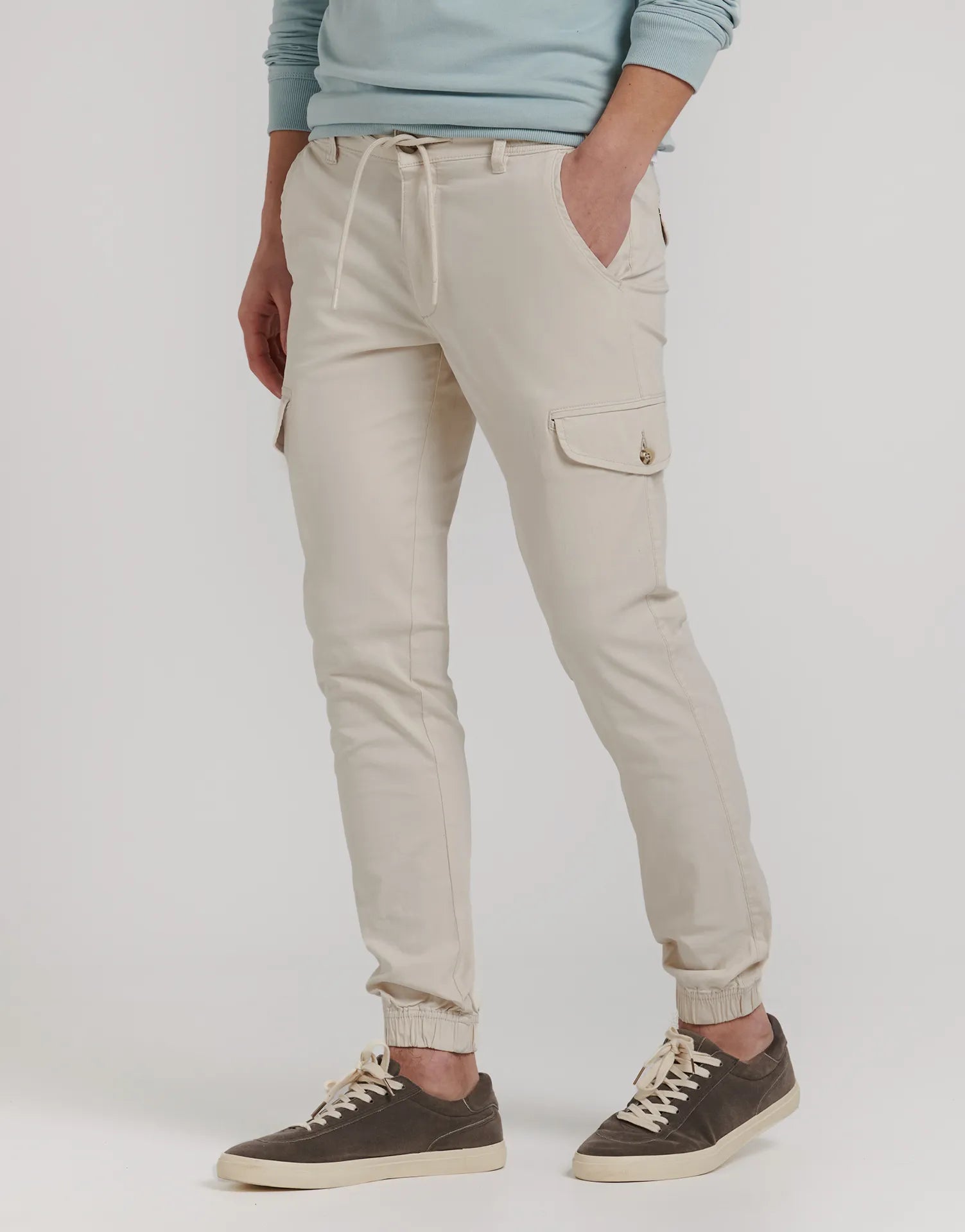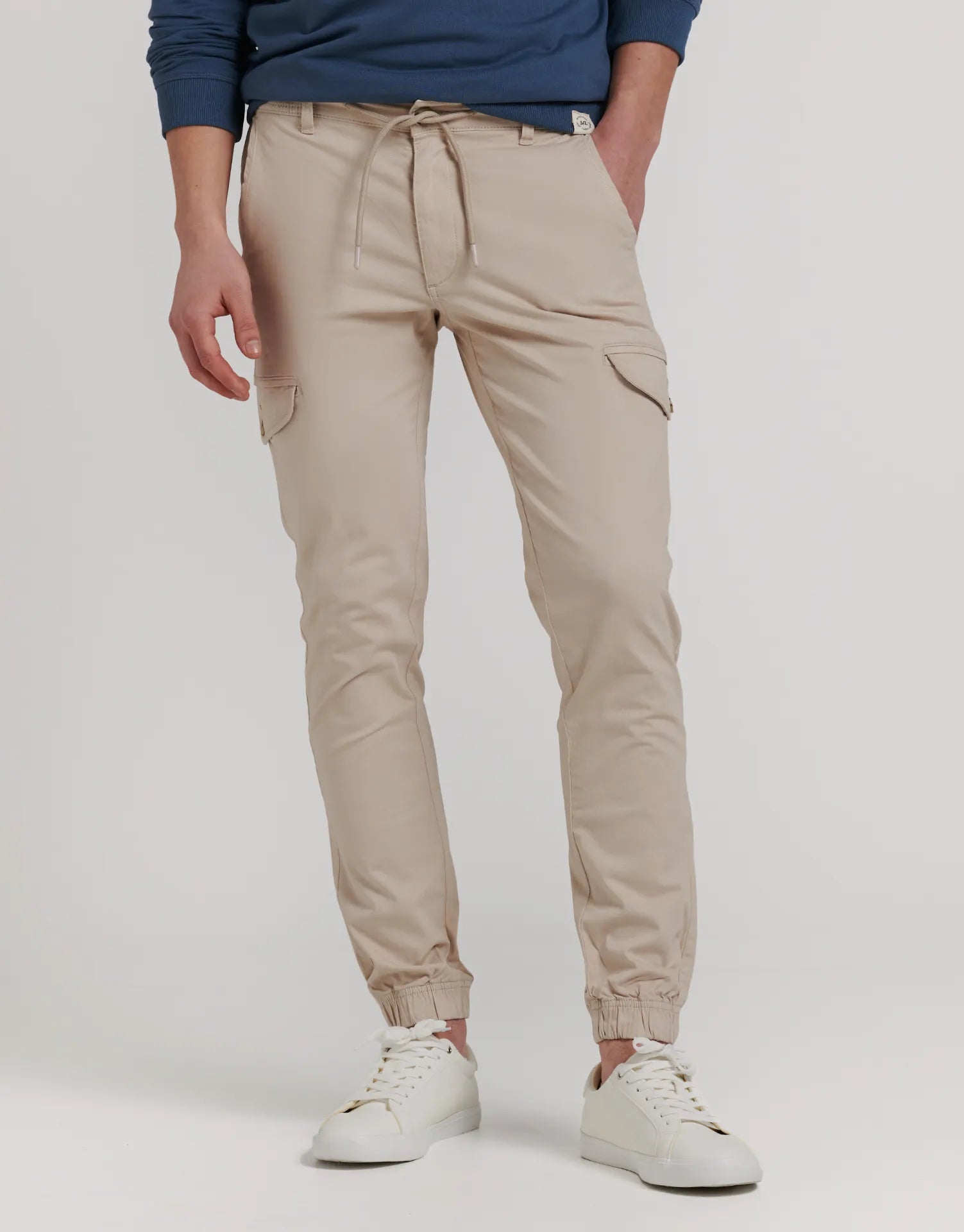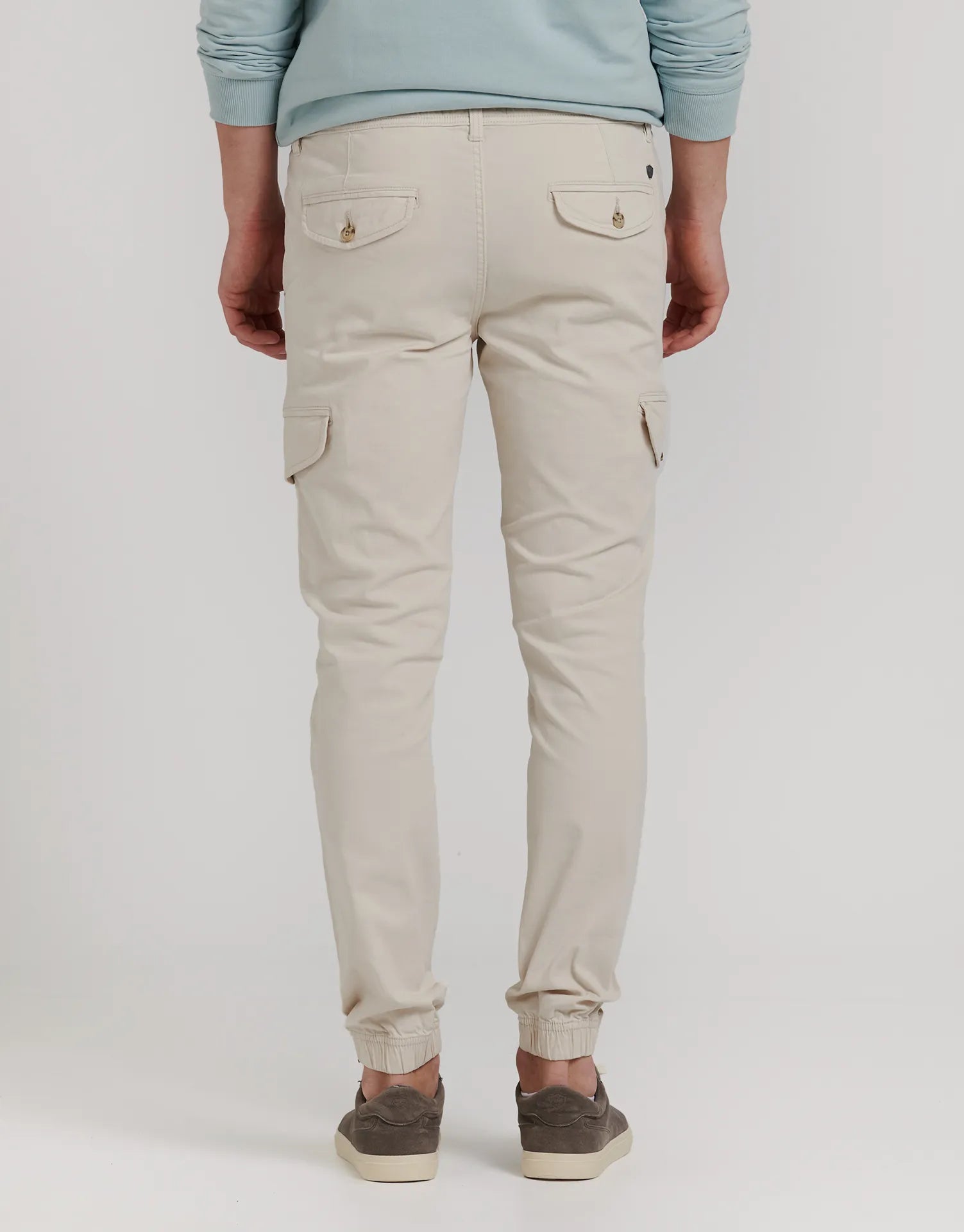 Chino joggers. Slim fit. Side pockets with flap and button closure. Button and zip closure. Back welt pockets with button closure. Elastic cuffs at the hems.