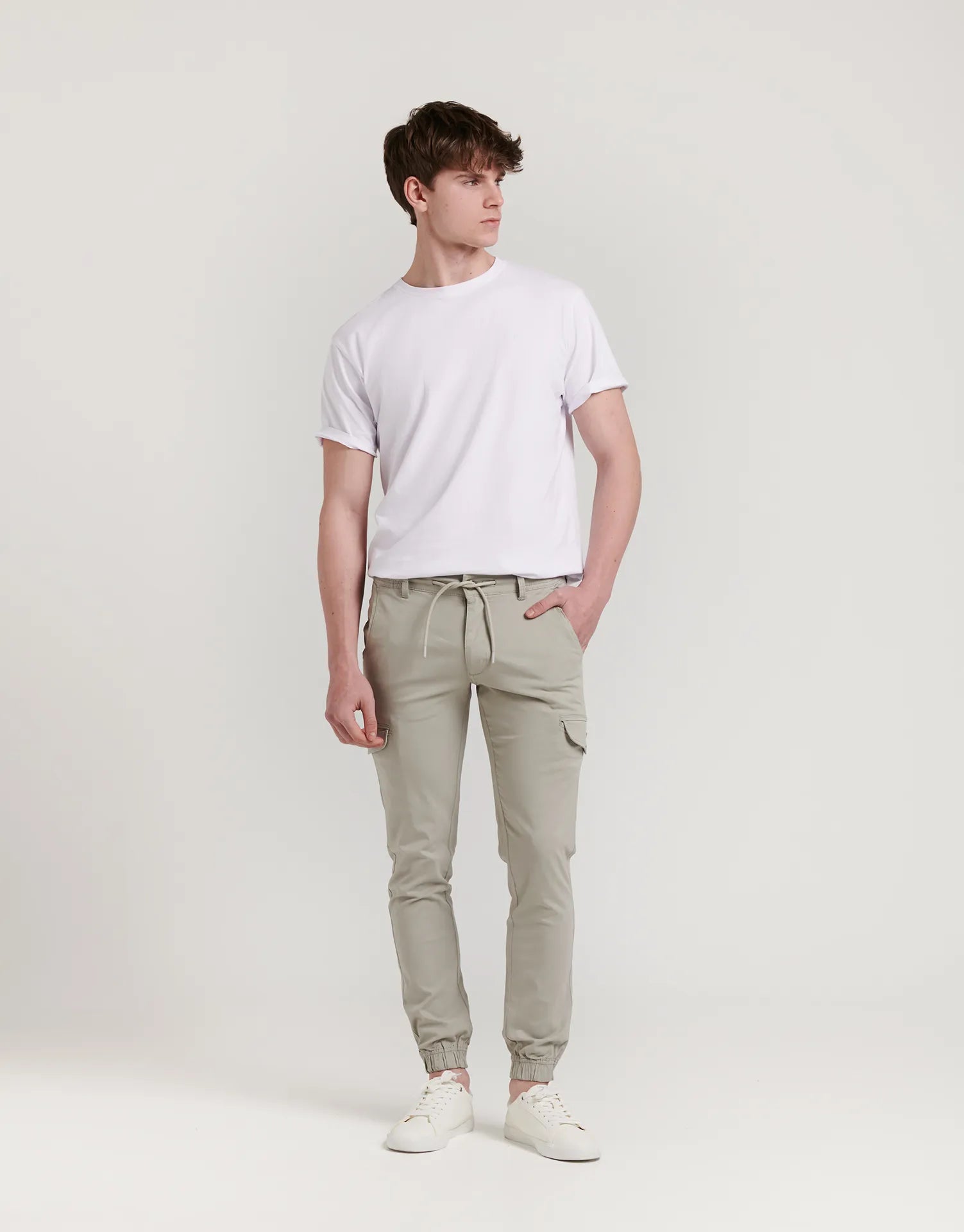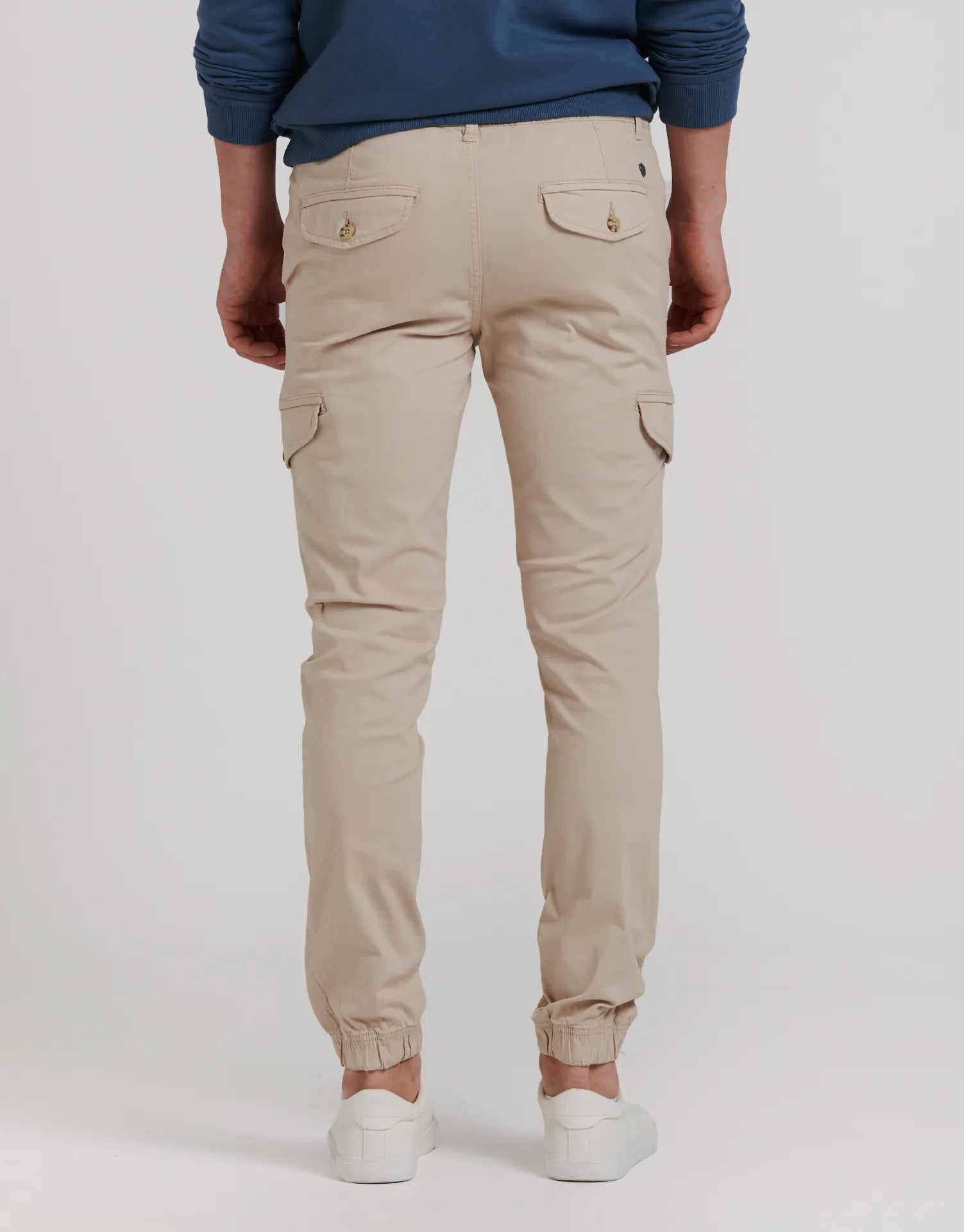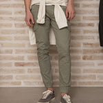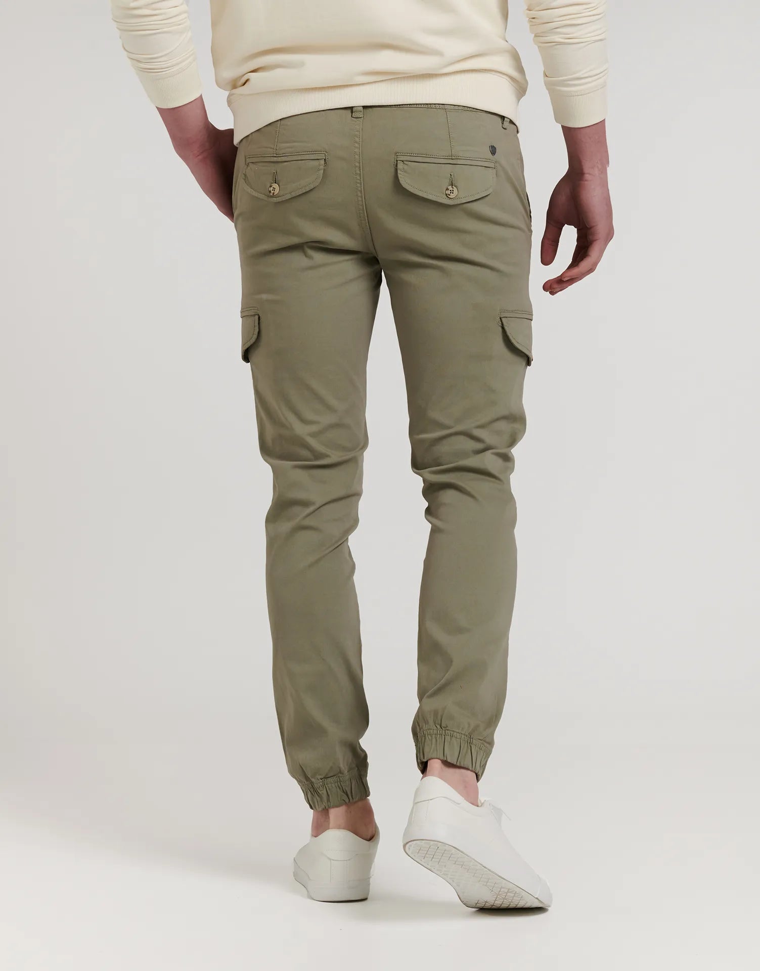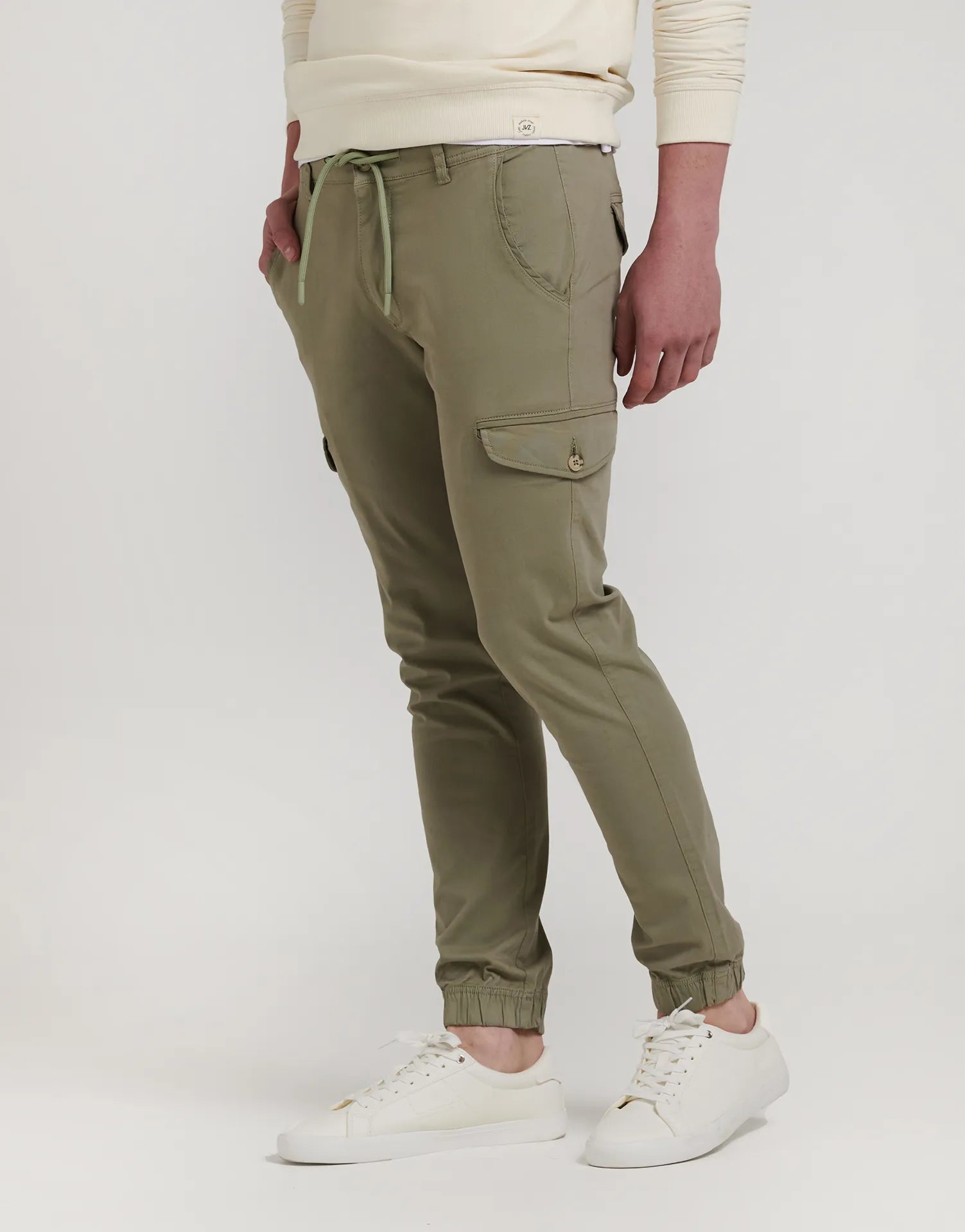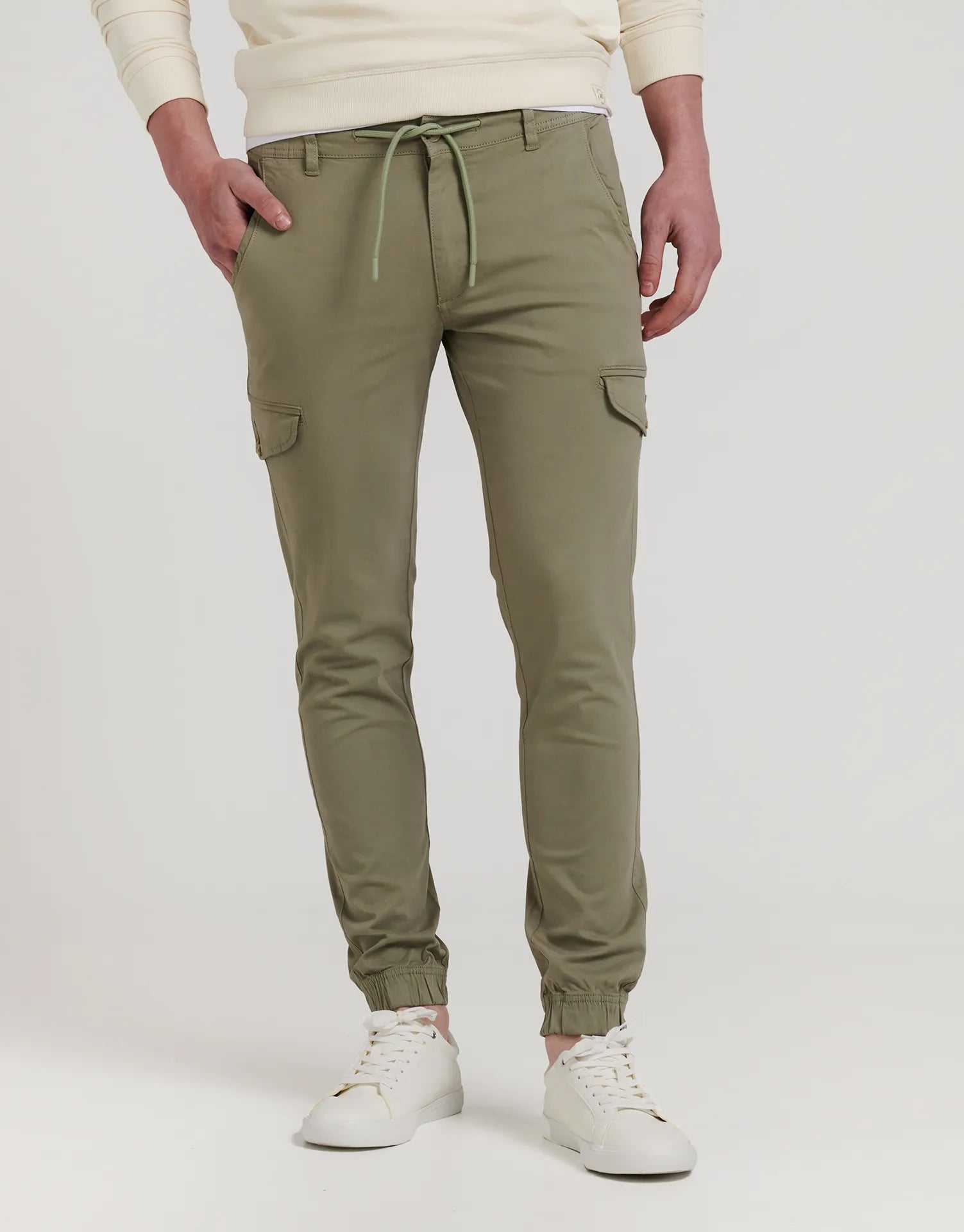 Chino joggers. Slim fit. Side pockets with flap and button closure. Button and zip closure. Back welt pockets with button closure. Elastic cuffs at the hems.