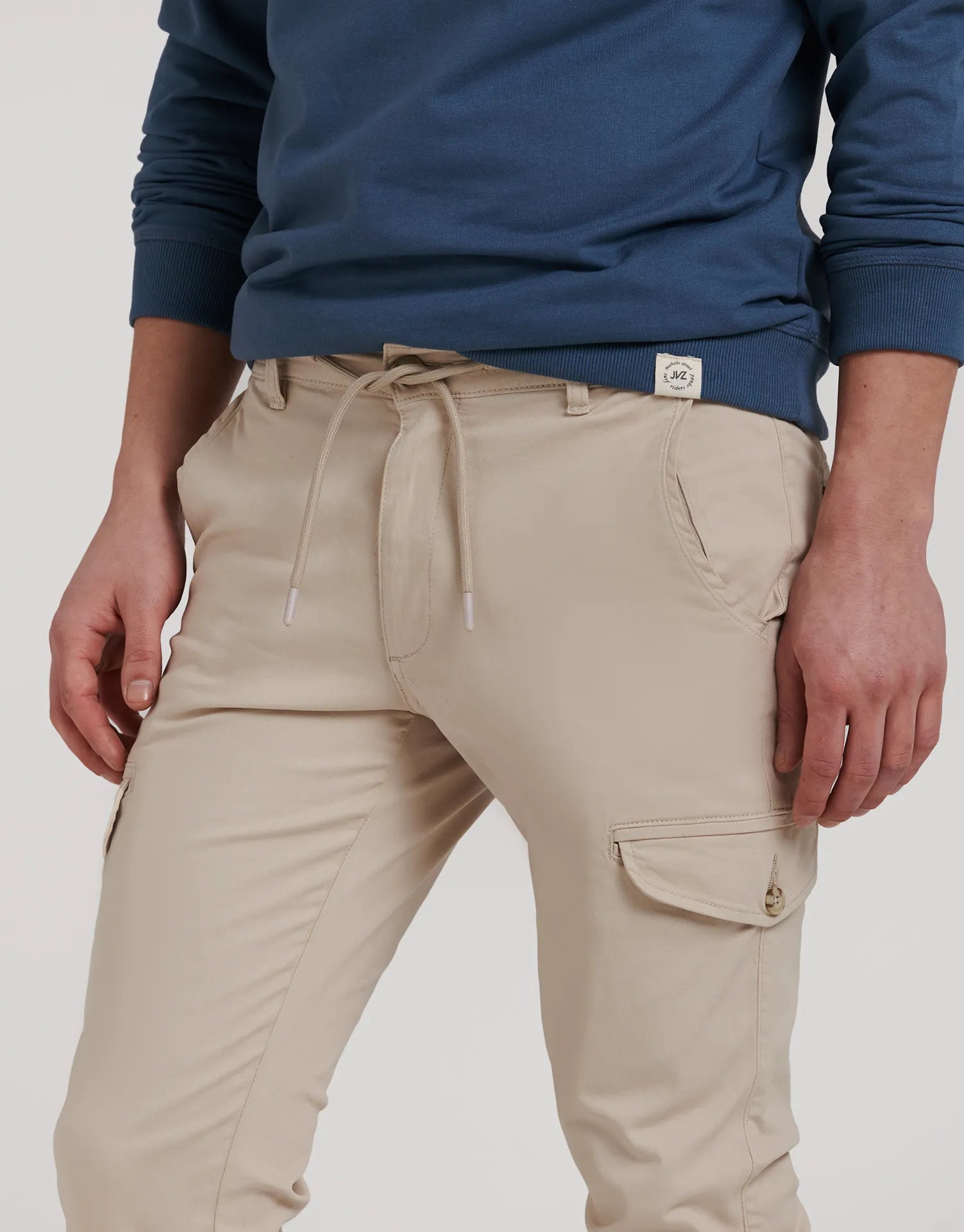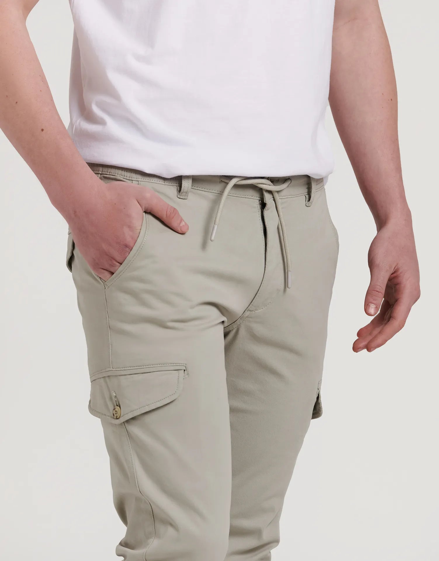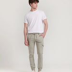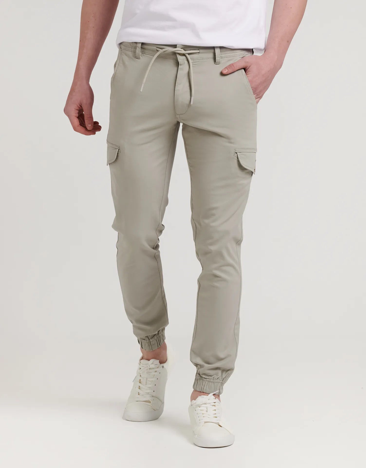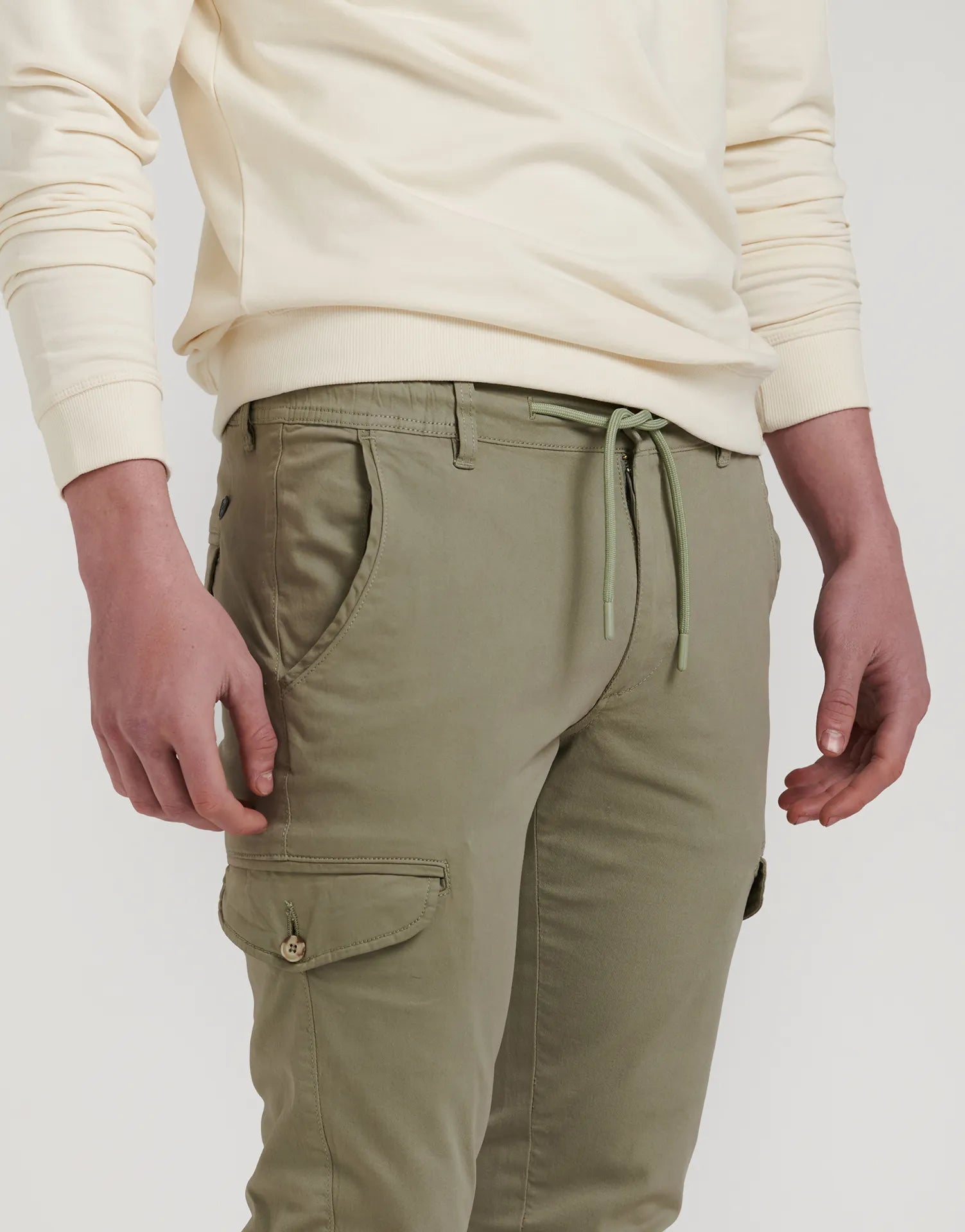 Chino joggers. Slim fit. Side pockets with flap and button closure. Button and zip closure. Back welt pockets with button closure. Elastic cuffs at the hems.