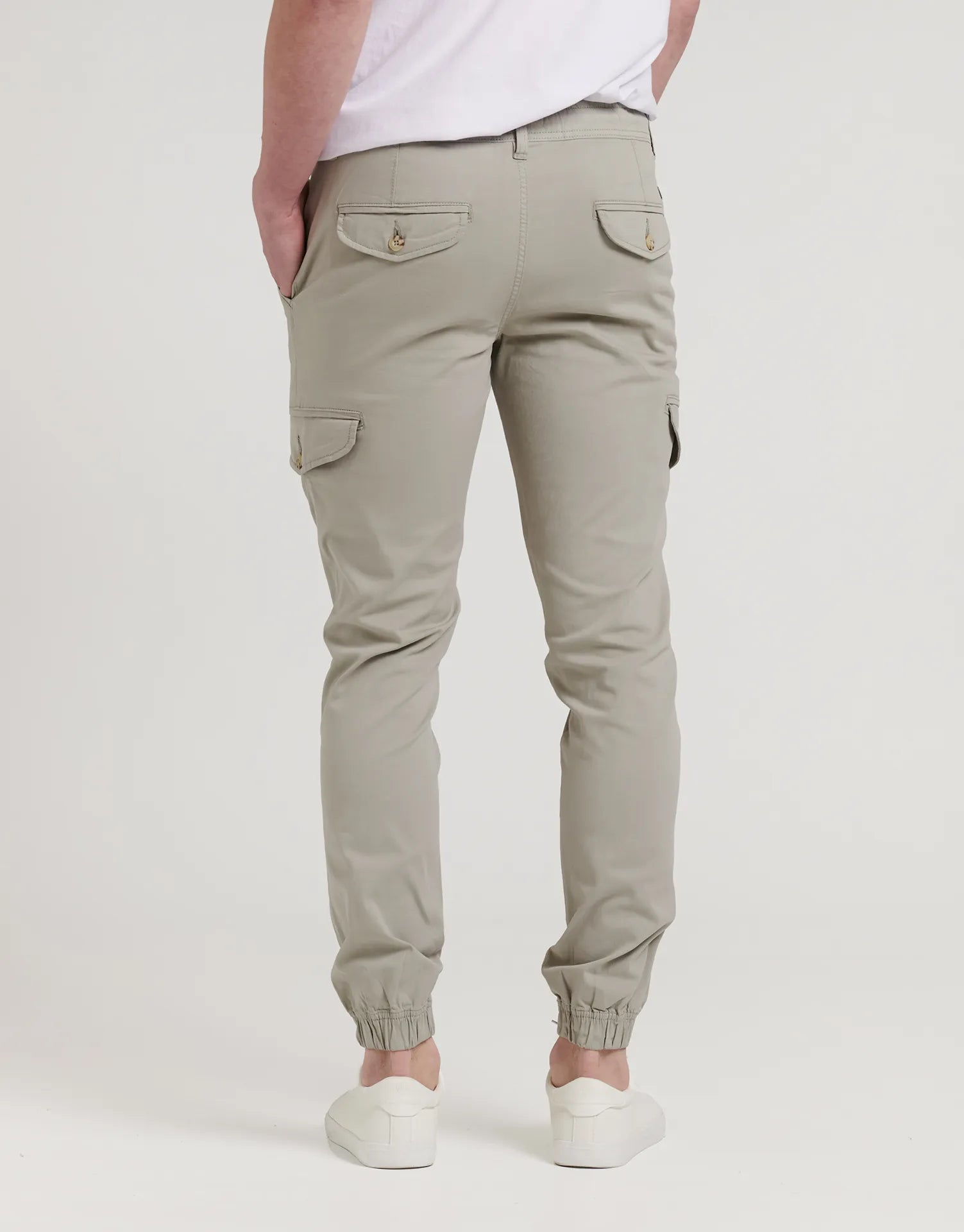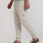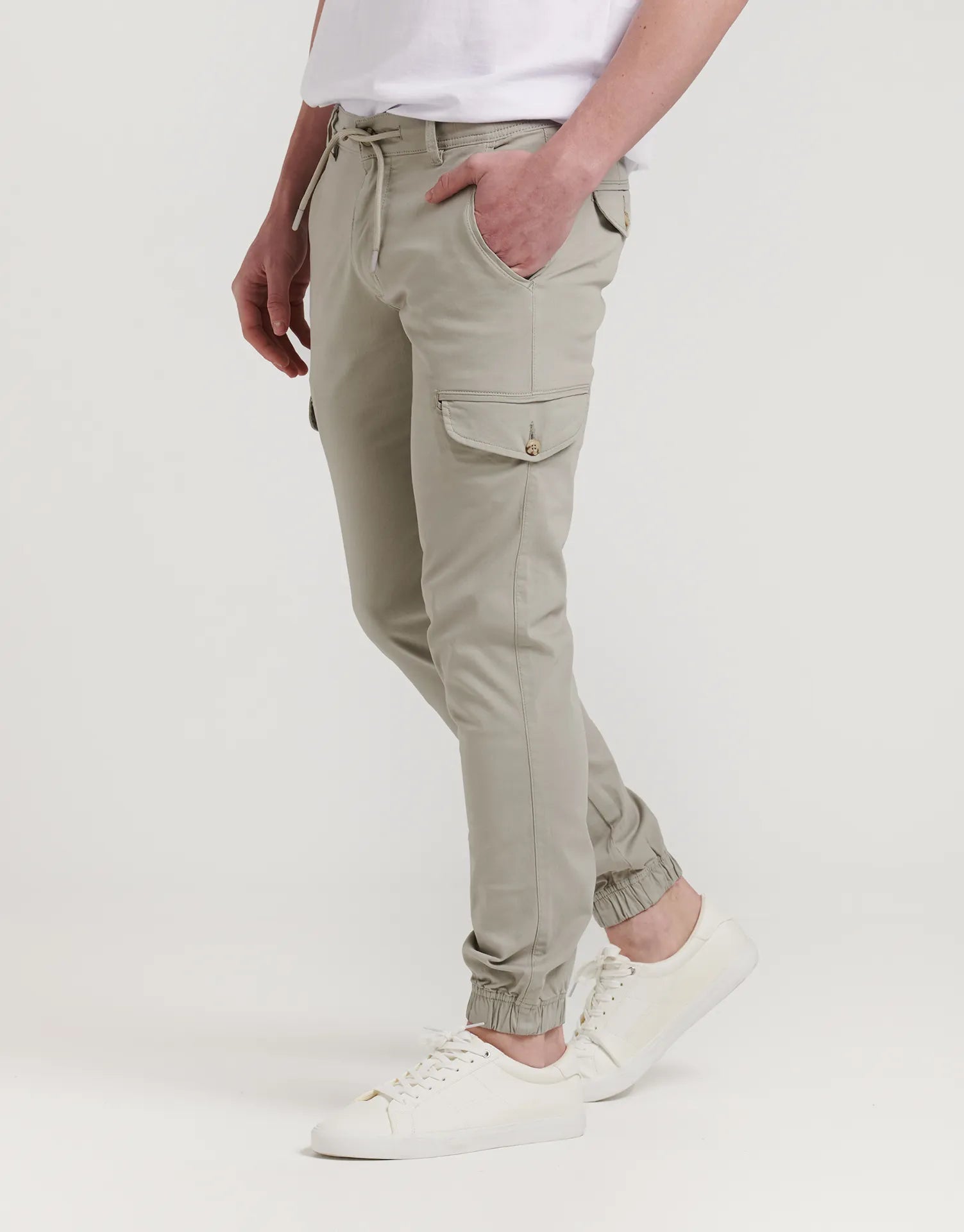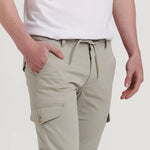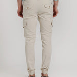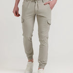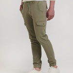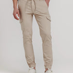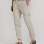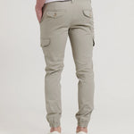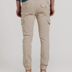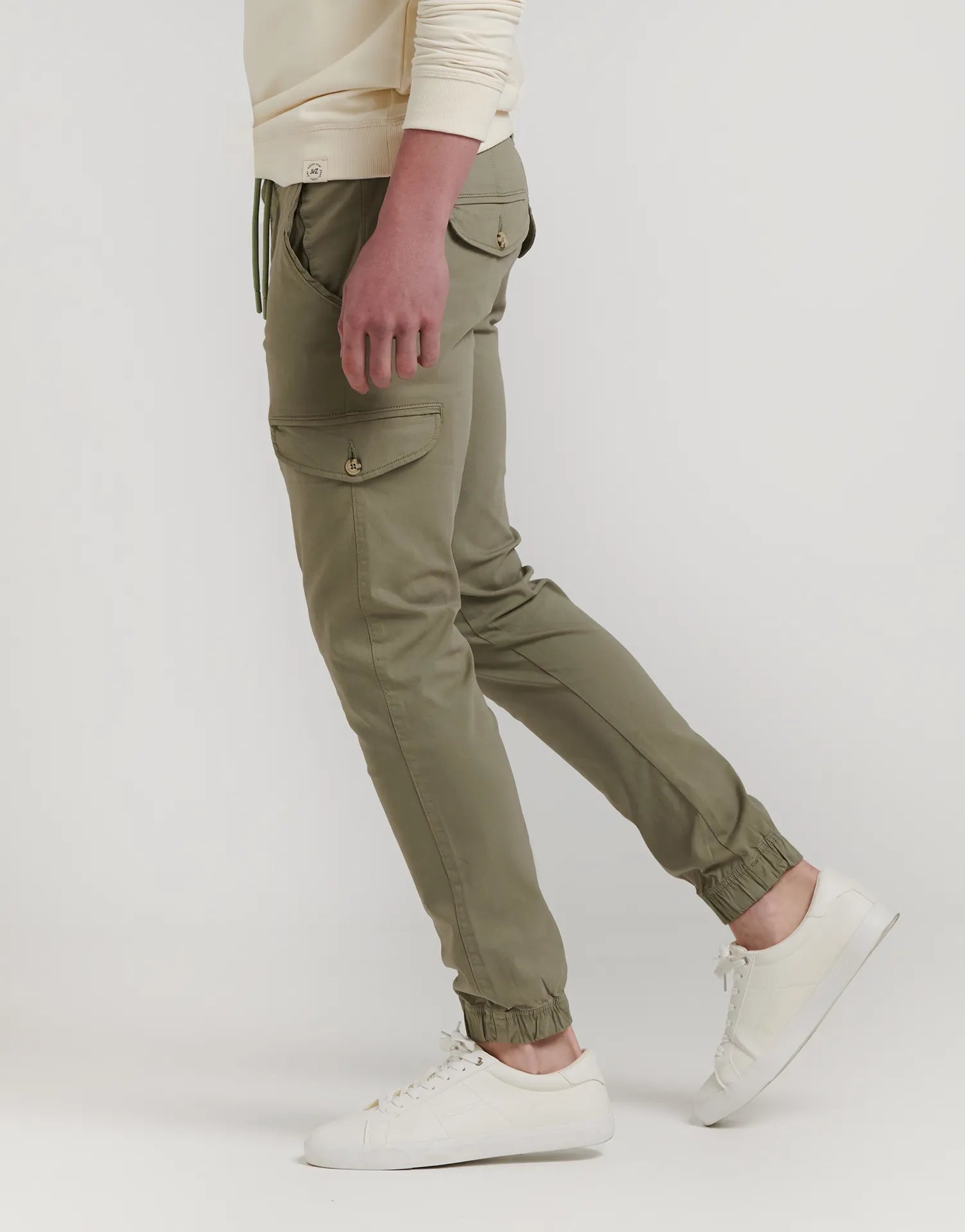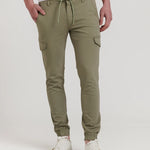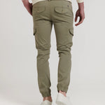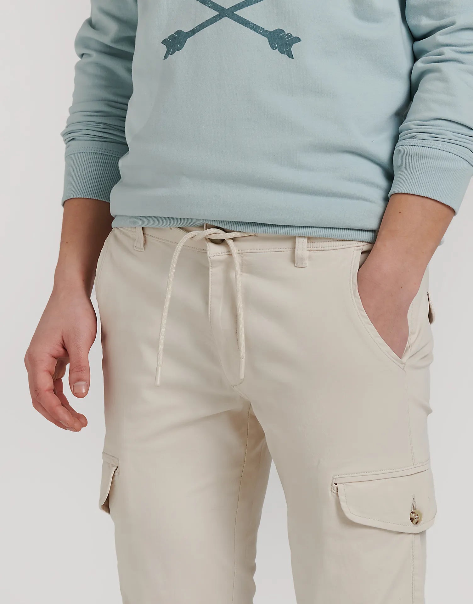 Chino joggers. Slim fit. Side pockets with flap and button closure. Button and zip closure. Back welt pockets with button closure. Elastic cuffs at the hems.