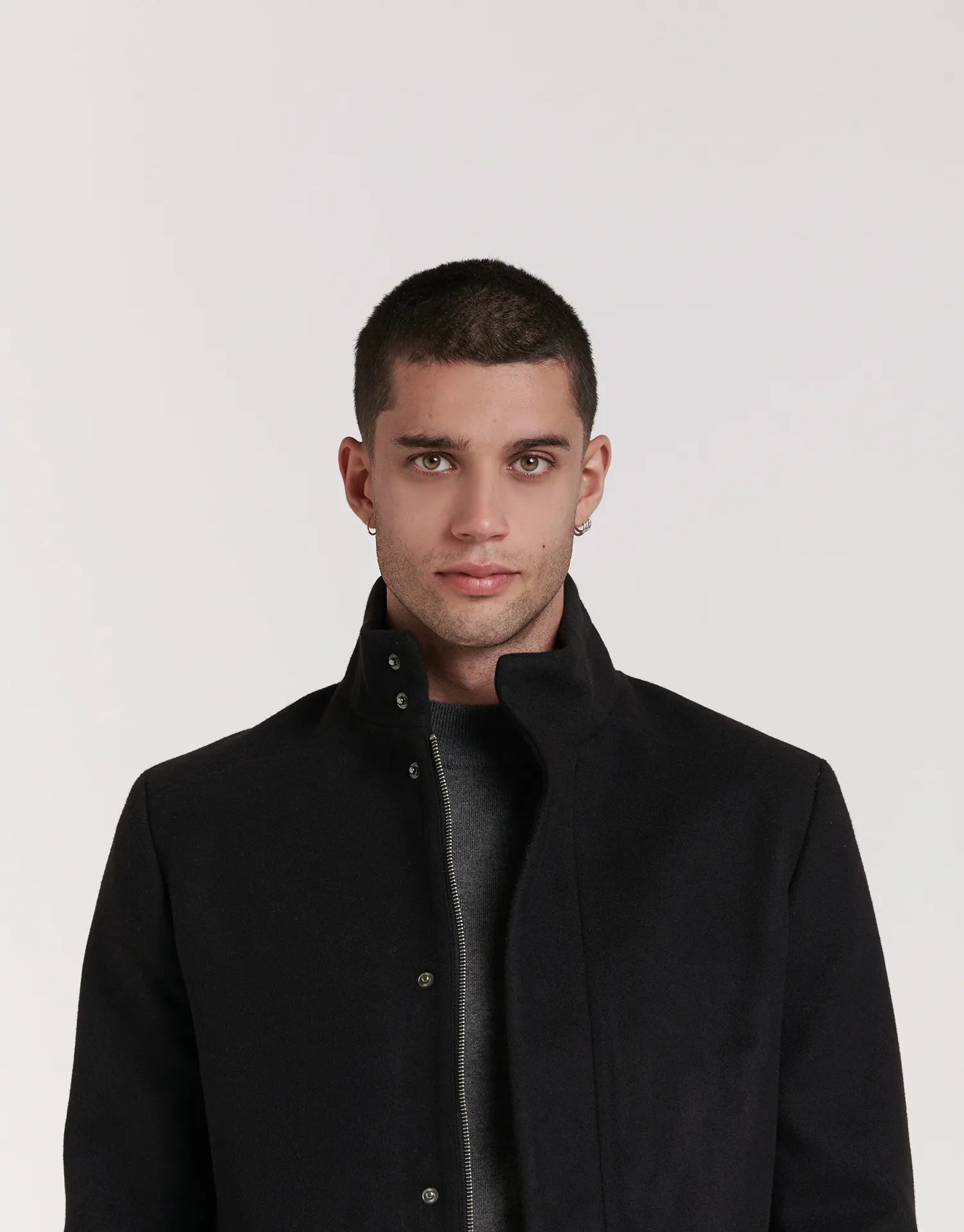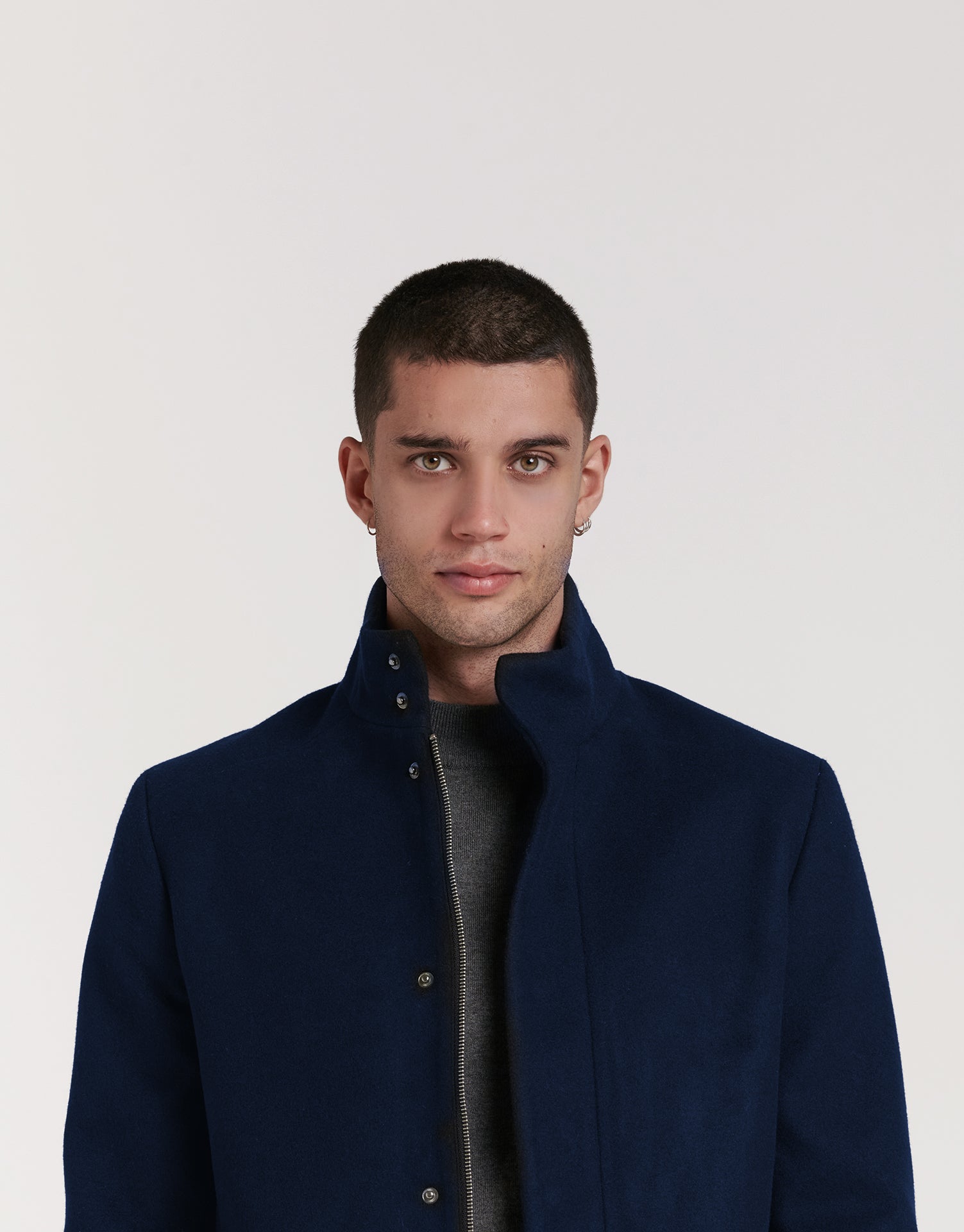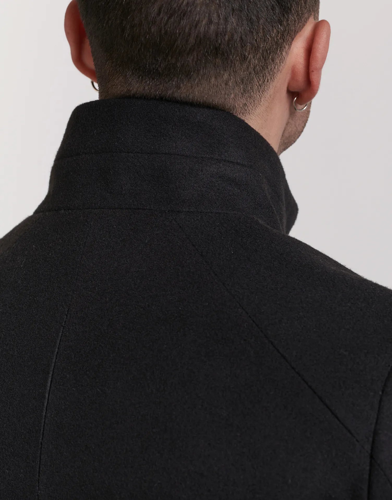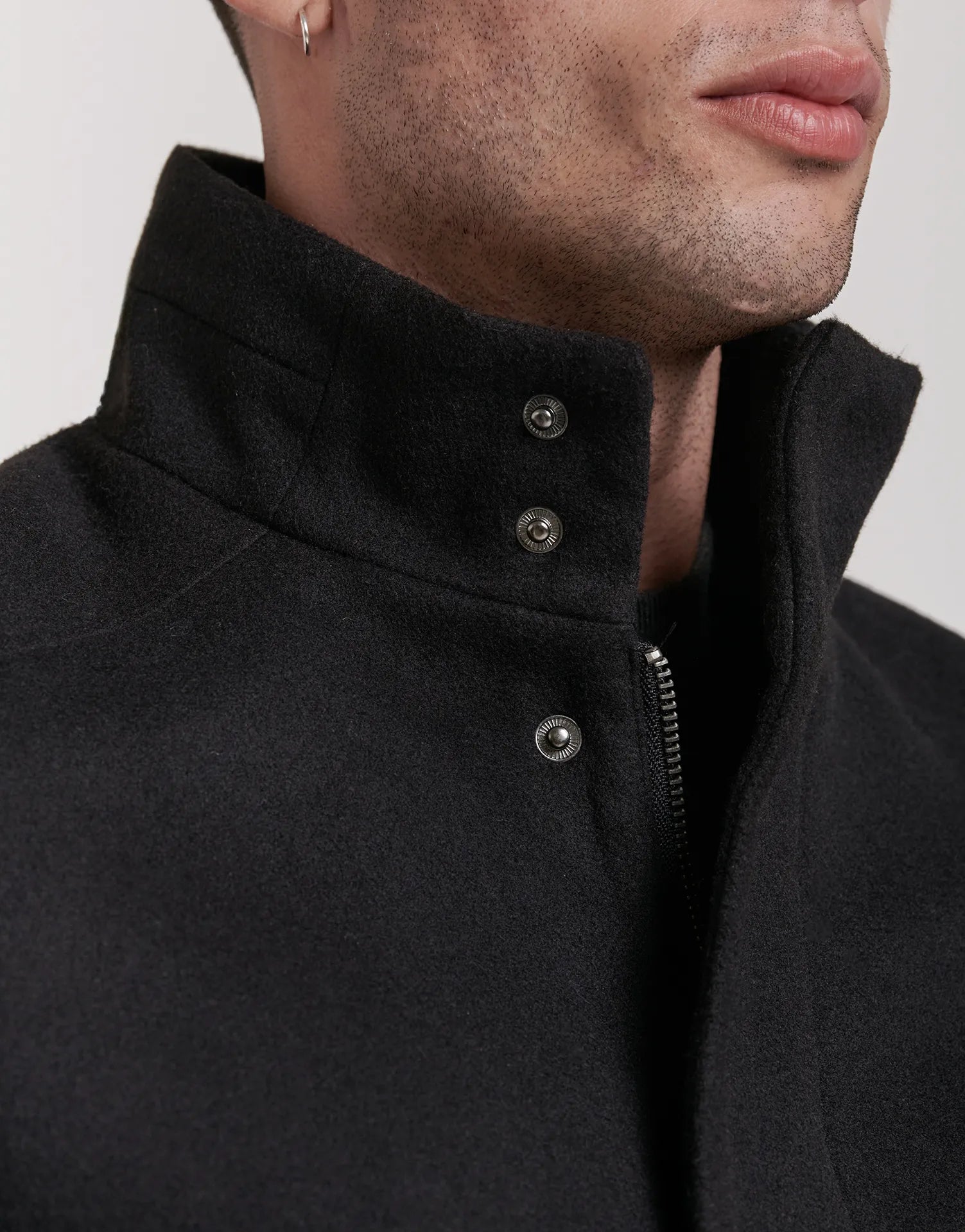 - Cuello alto con doble cierre que protege del viento y añade un toque contemporáneo.