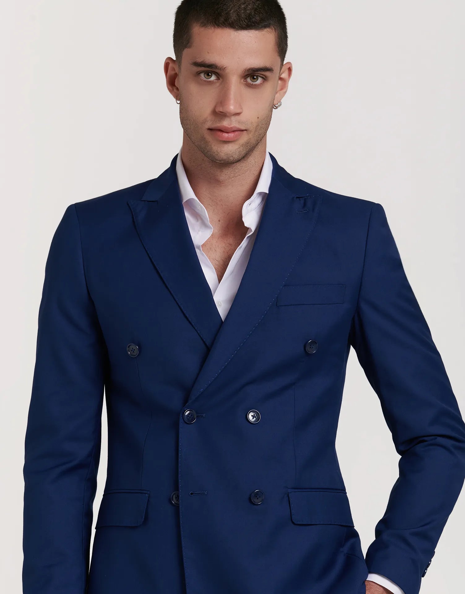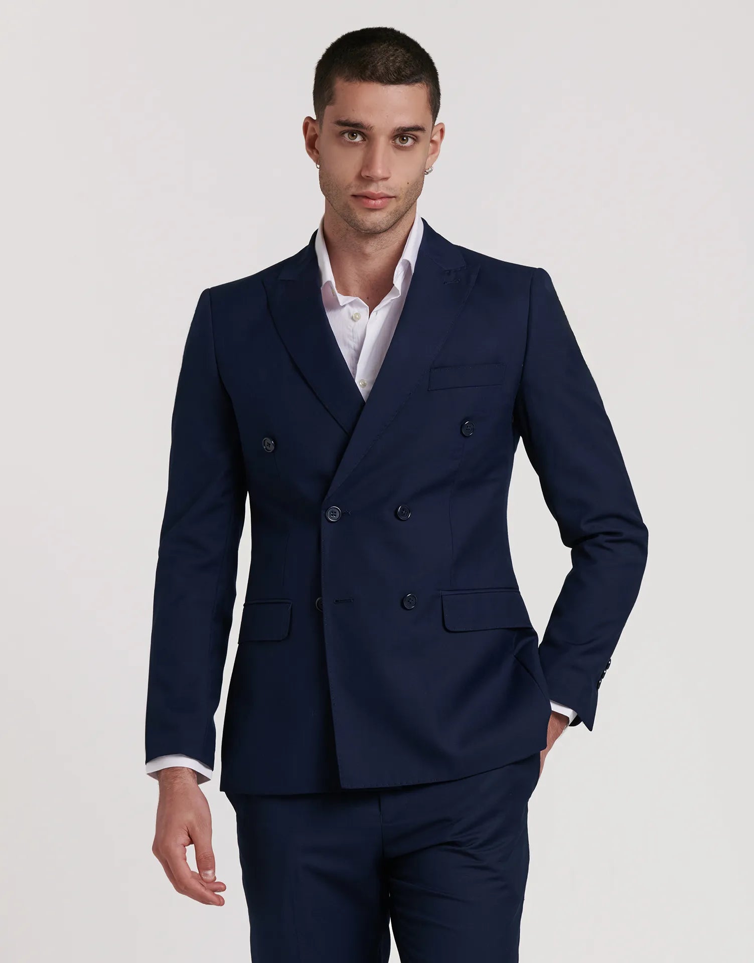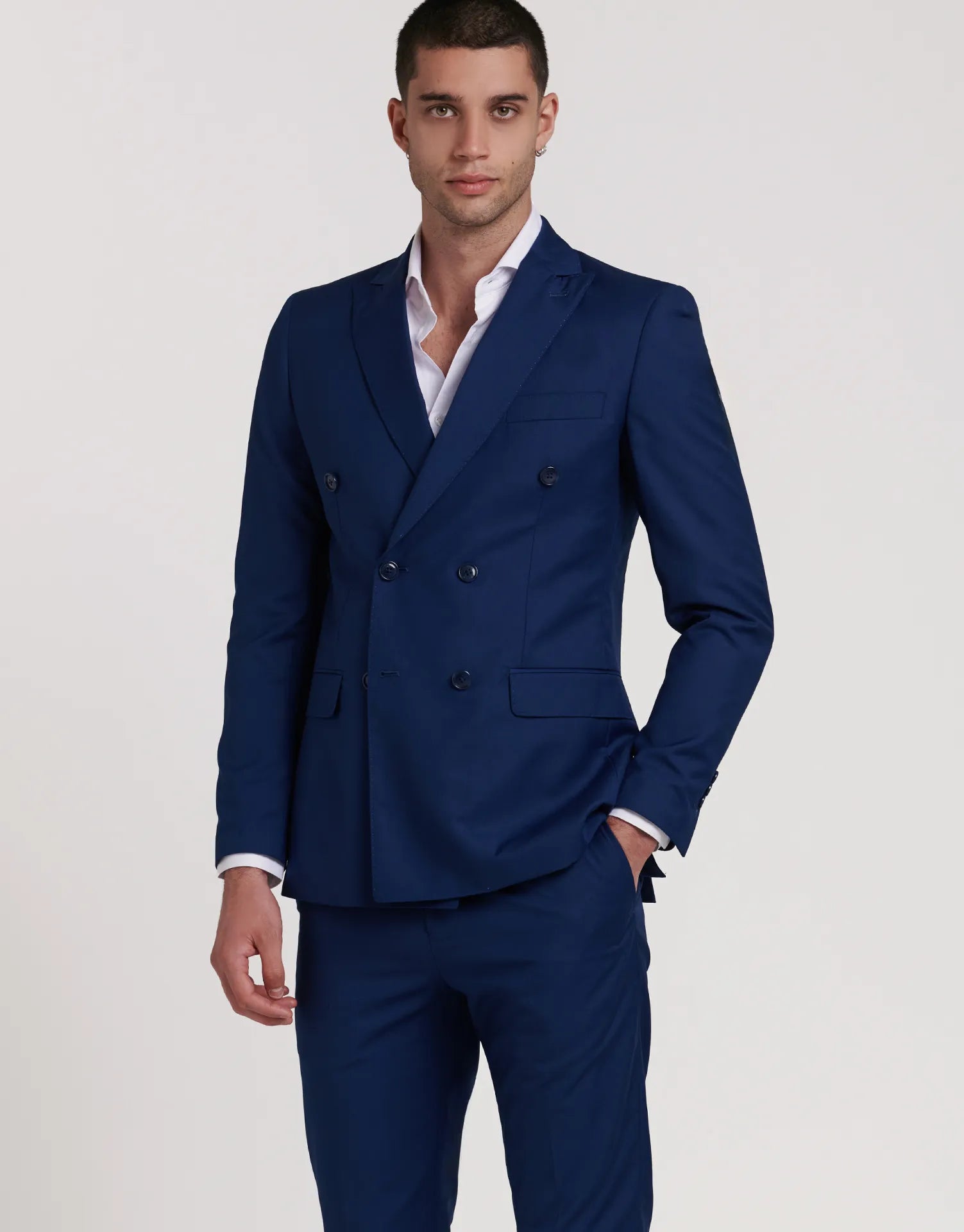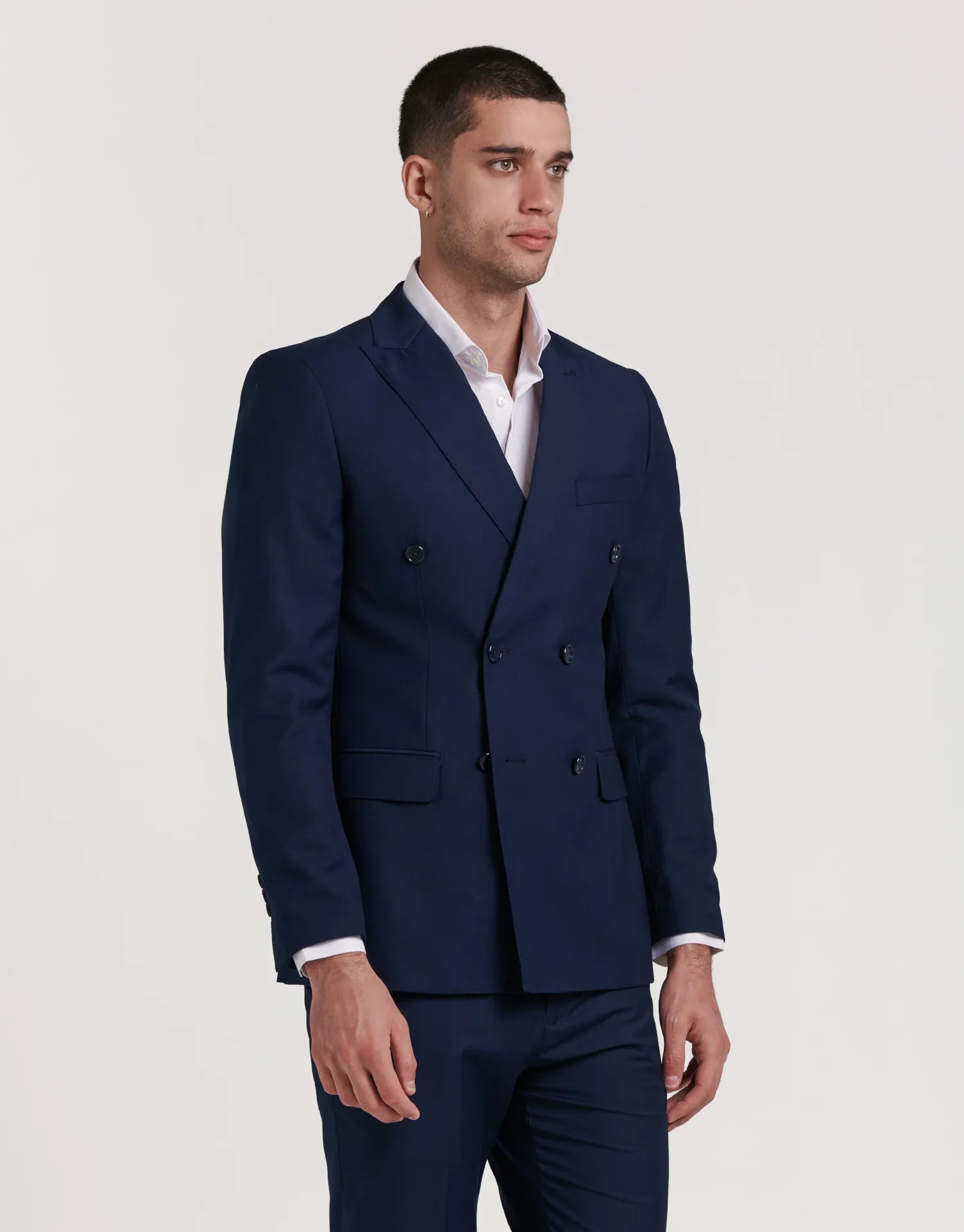*CHAQUETA Y PANTALÓN SE VENDEN POR SEPARADO | Chaqueta de traje de corte cruzado con cierre de seis botones. Corte Slim fit, ligeramente ceñido. Solapa de pico, puños con botones en su terminación, dos bolsillos en la cintura y uno en el pecho. Interior forrado con bolsillos.