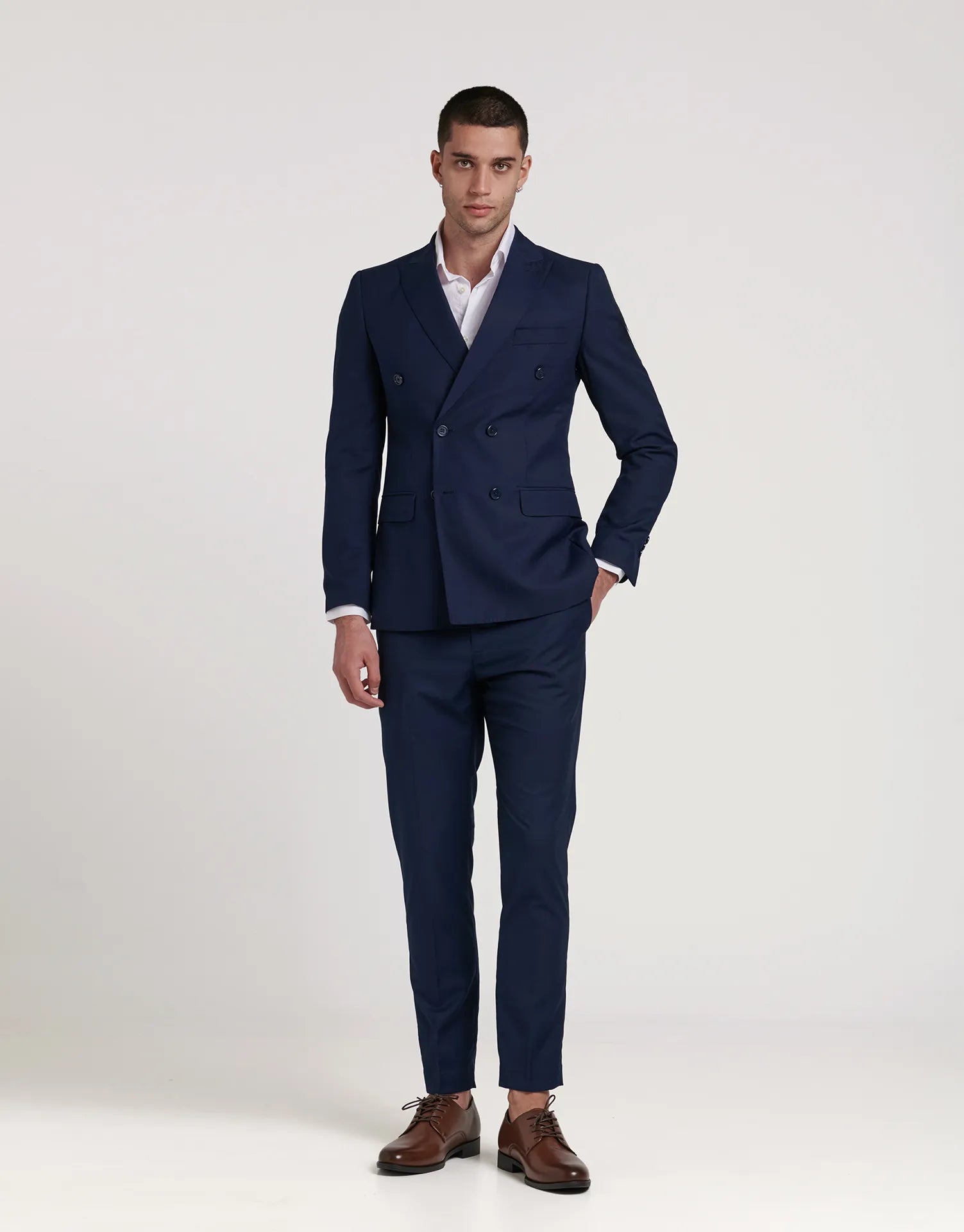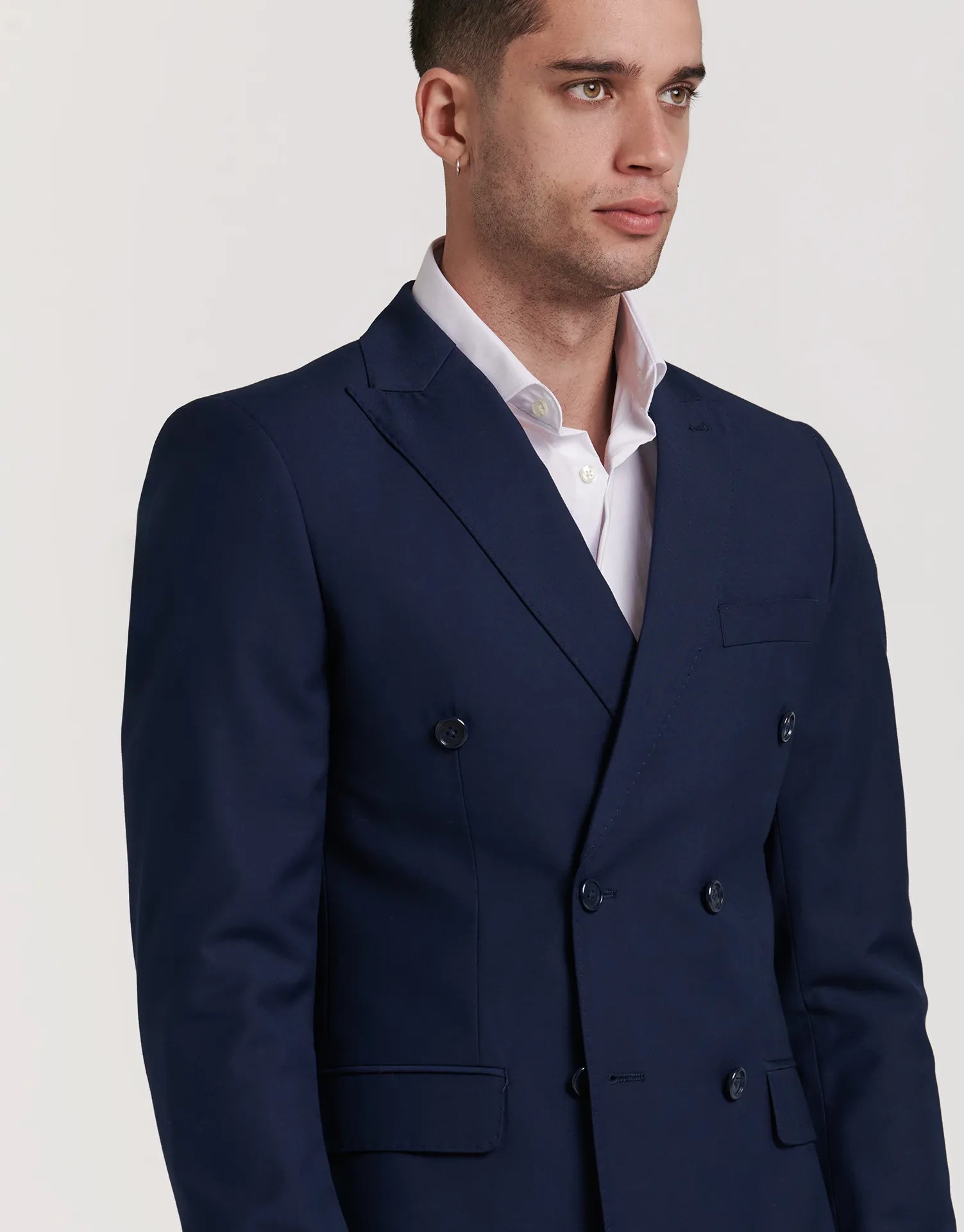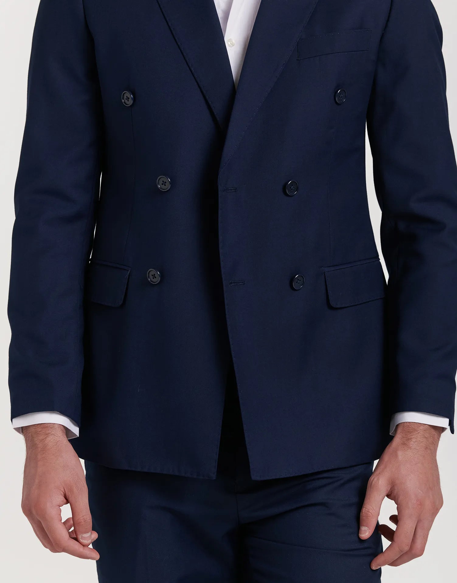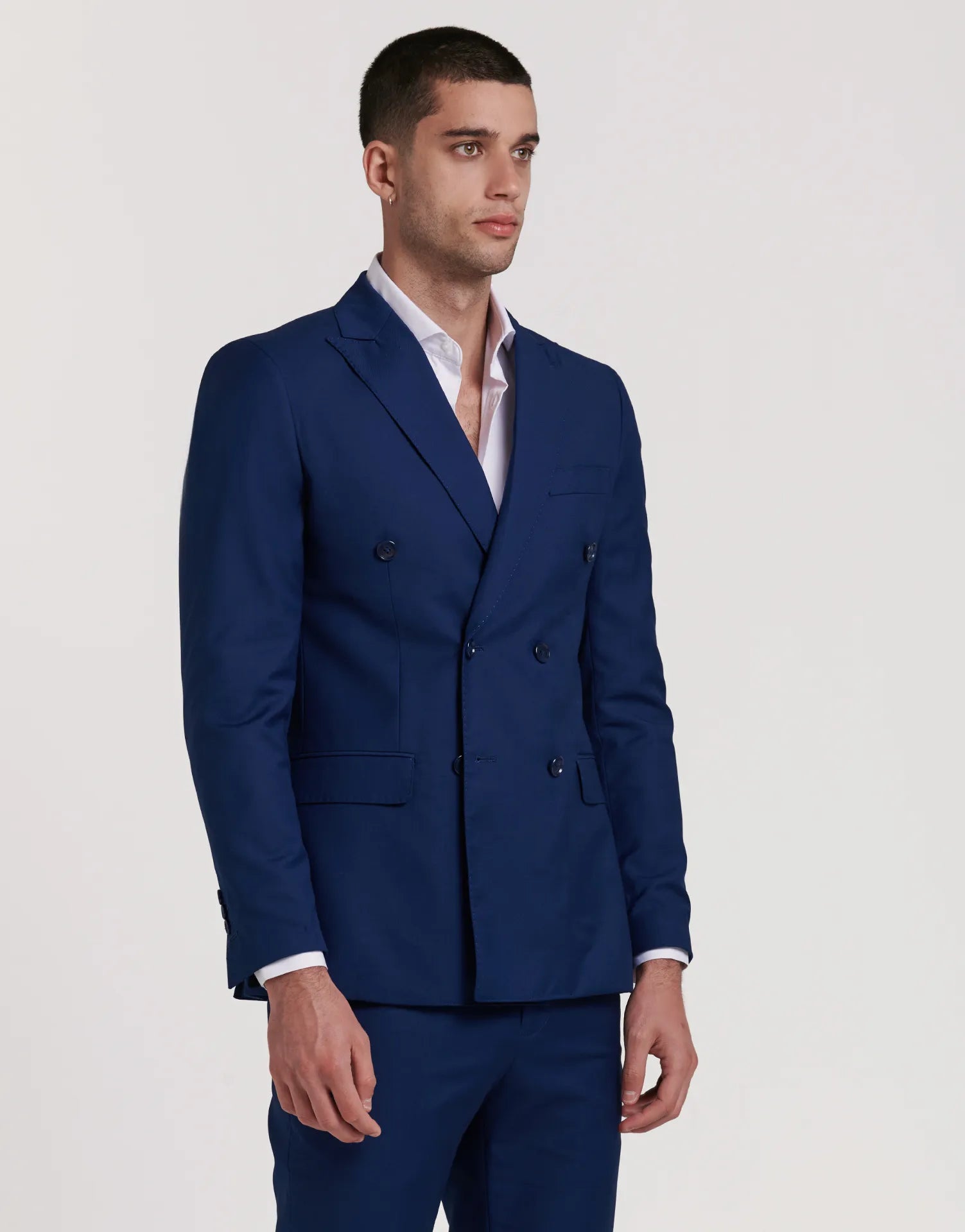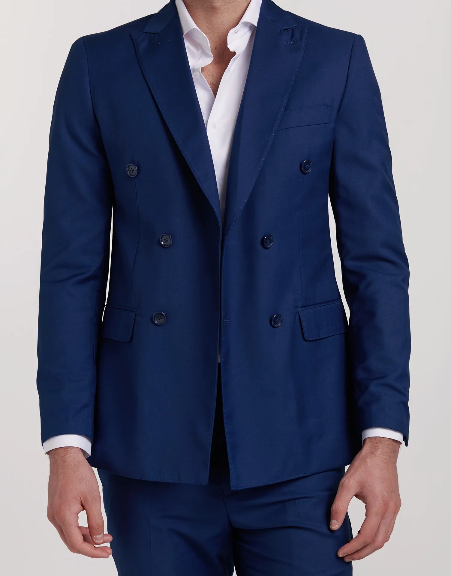 *CHAQUETA Y PANTALÓN SE VENDEN POR SEPARADO | Chaqueta de traje de corte cruzado con cierre de seis botones. Corte Slim fit, ligeramente ceñido. Solapa de pico, puños con botones en su terminación, dos bolsillos en la cintura y uno en el pecho. Interior forrado con bolsillos.