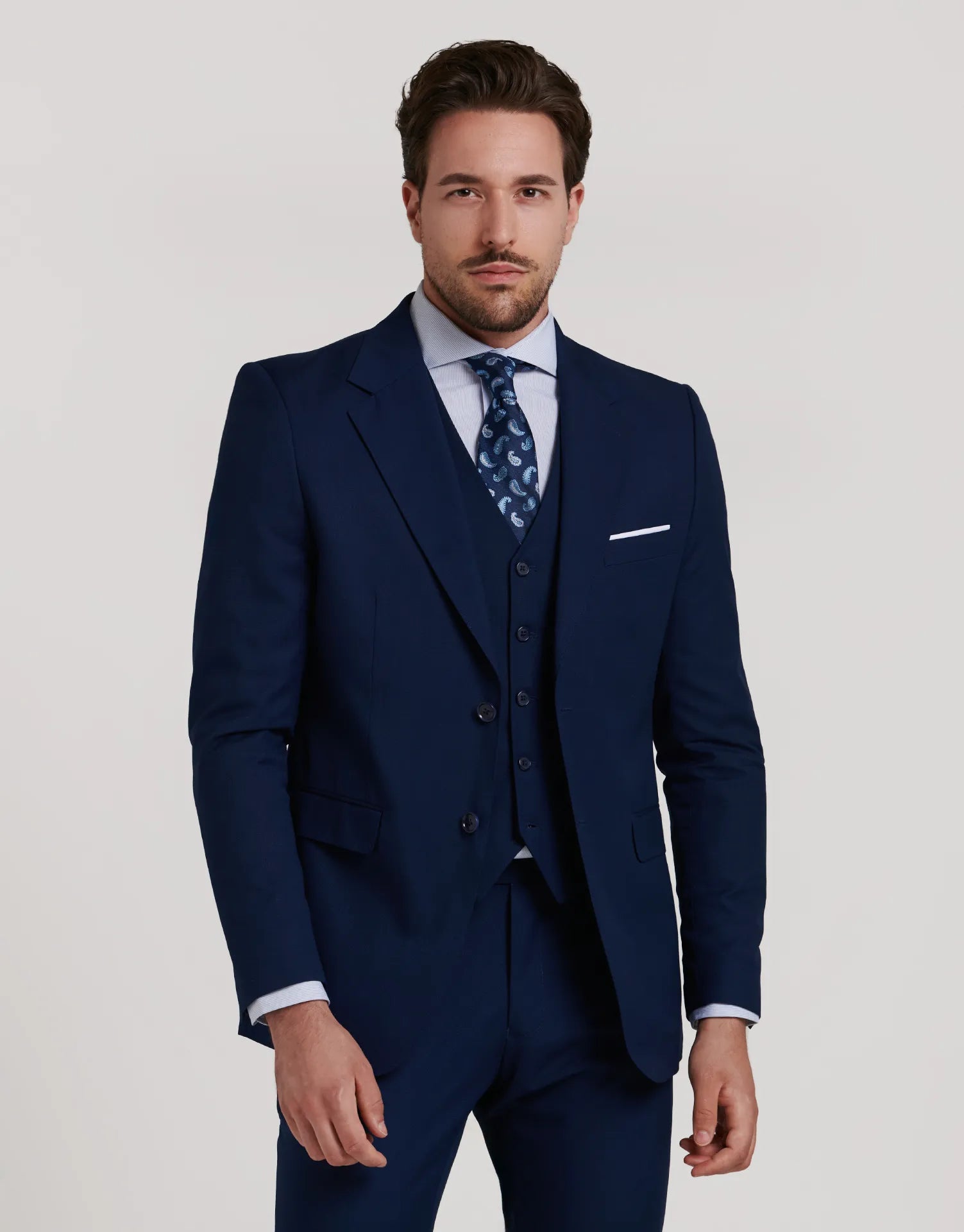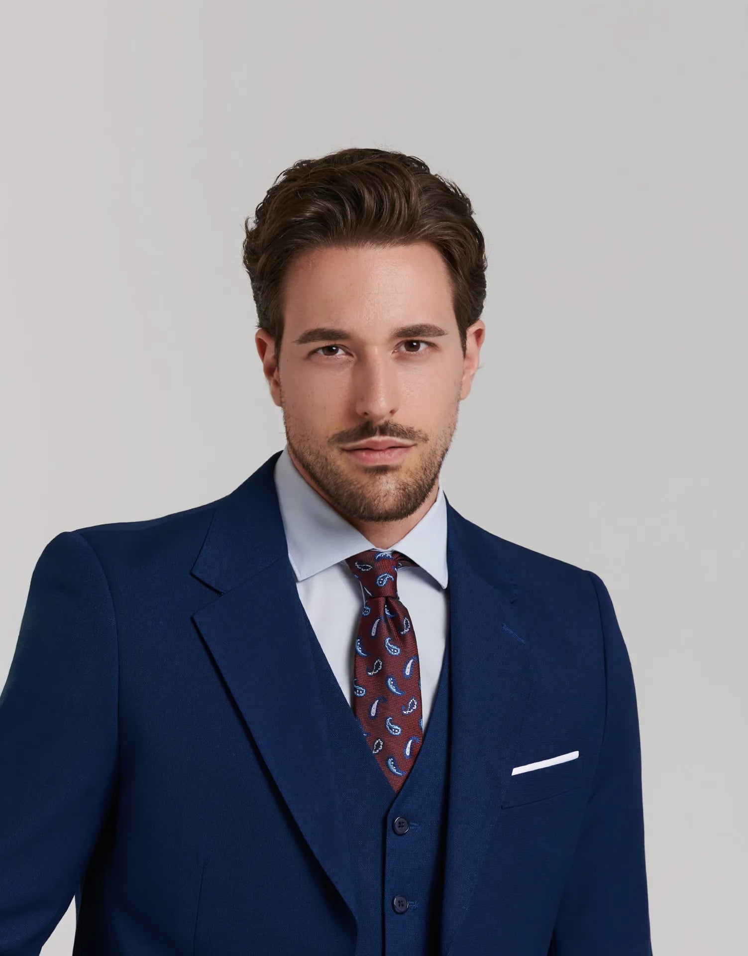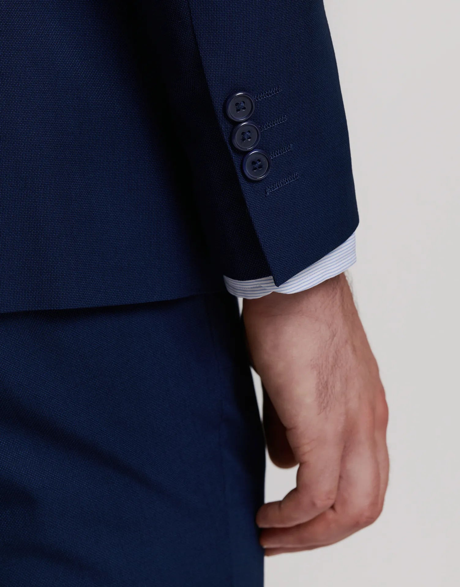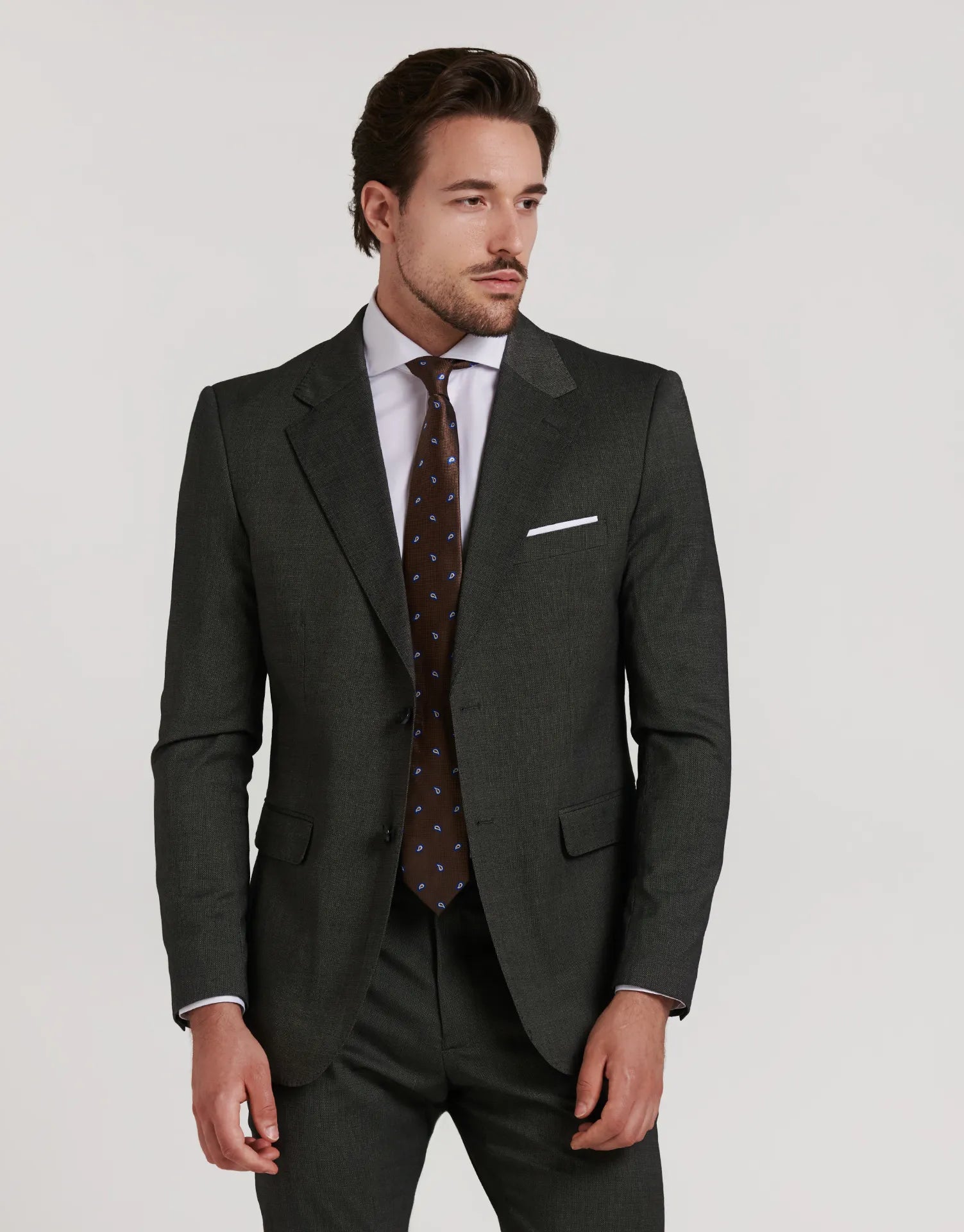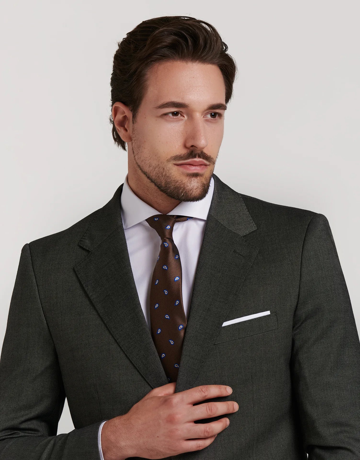 Americana de corte entallado confeccionada en tejido ojo de perdiz, un acabado sutil que aporta textura y profundidad al diseño. Presenta un cierre de dos botones, solapa clásica, bolsillos con solapa y un pañuelo incluido en el bolsillo superior que eleva el look con un toque distintivo. Diseñada para ofrecer una silueta limpia y actual, esta prenda es ideal tanto para eventos formales como para un estilo business impecable.