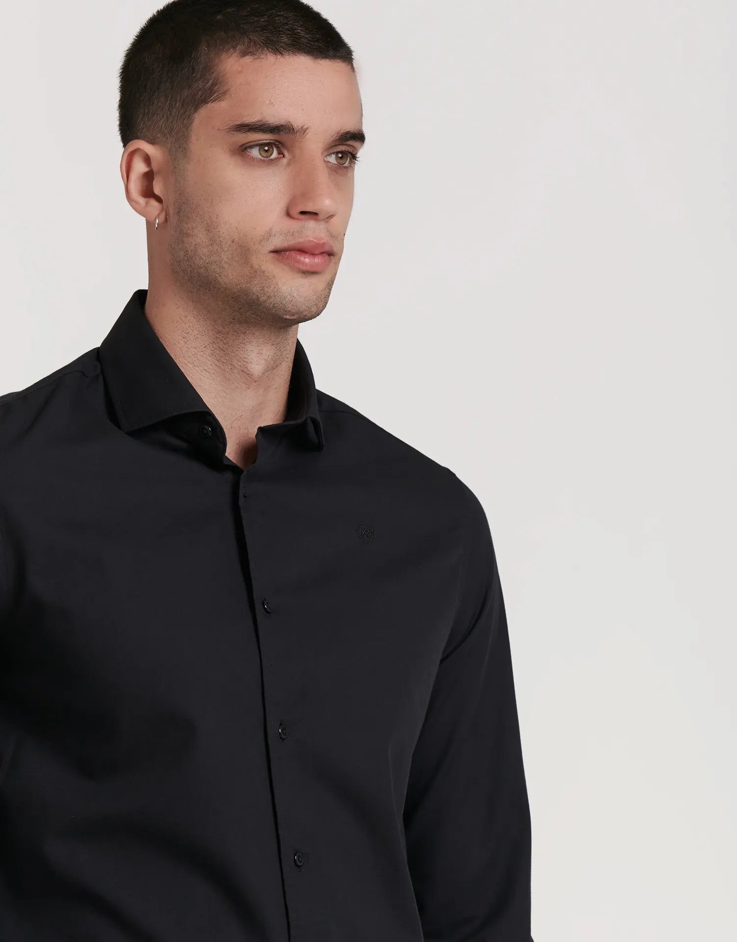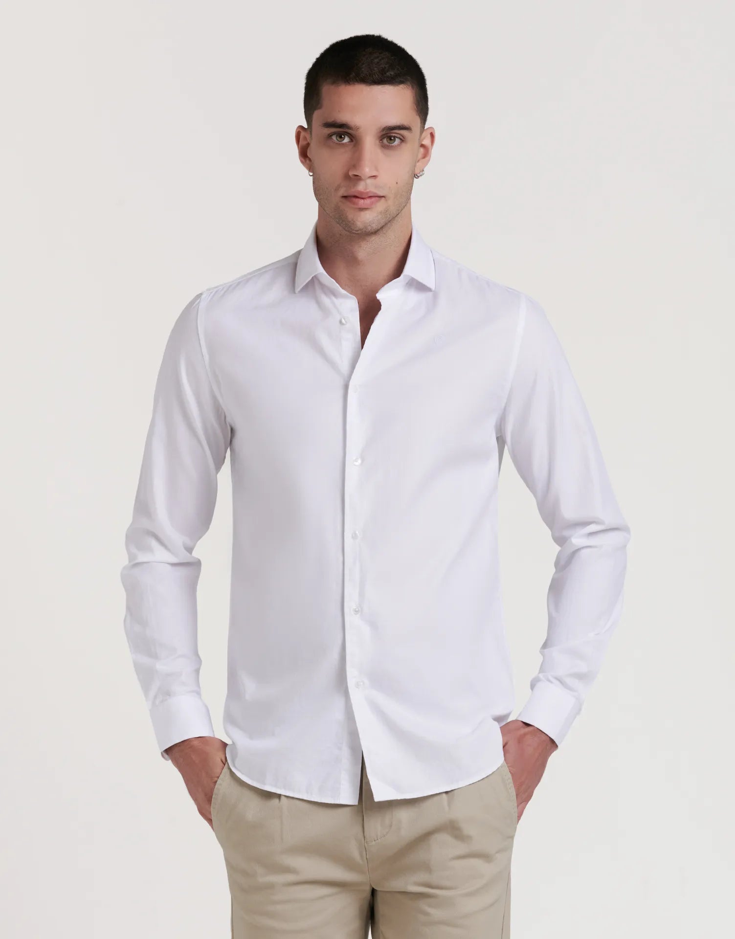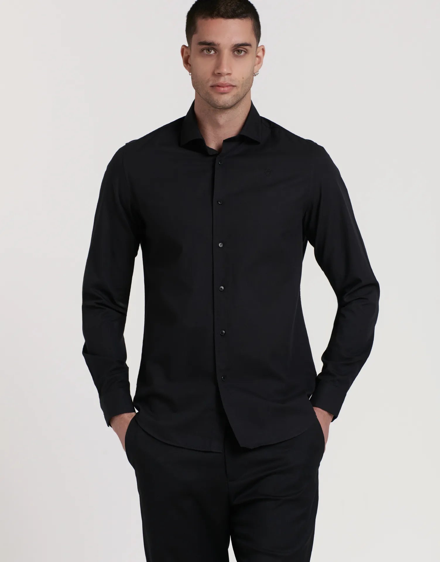 La camisa estructura slim fit cuello alto de JVZ está pensada para quienes buscan un look pulido y actual sin renunciar a la comodidad. Su tejido con ligera estructura y el patrón entallado estilizan la figura, mientras que el cuello alto aporta un plus de presencia ideal para ocasiones formales o para elevar tus looks de oficina.