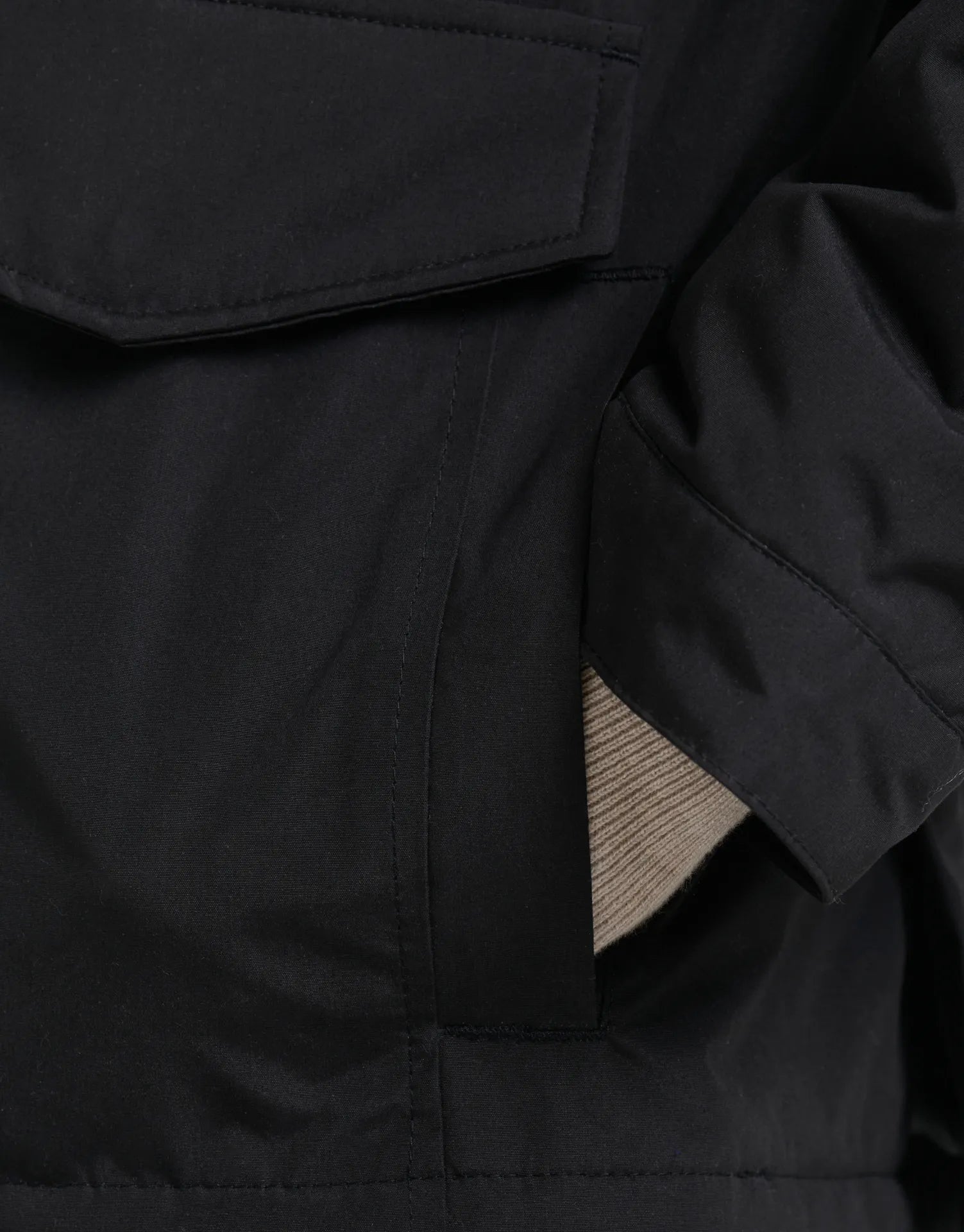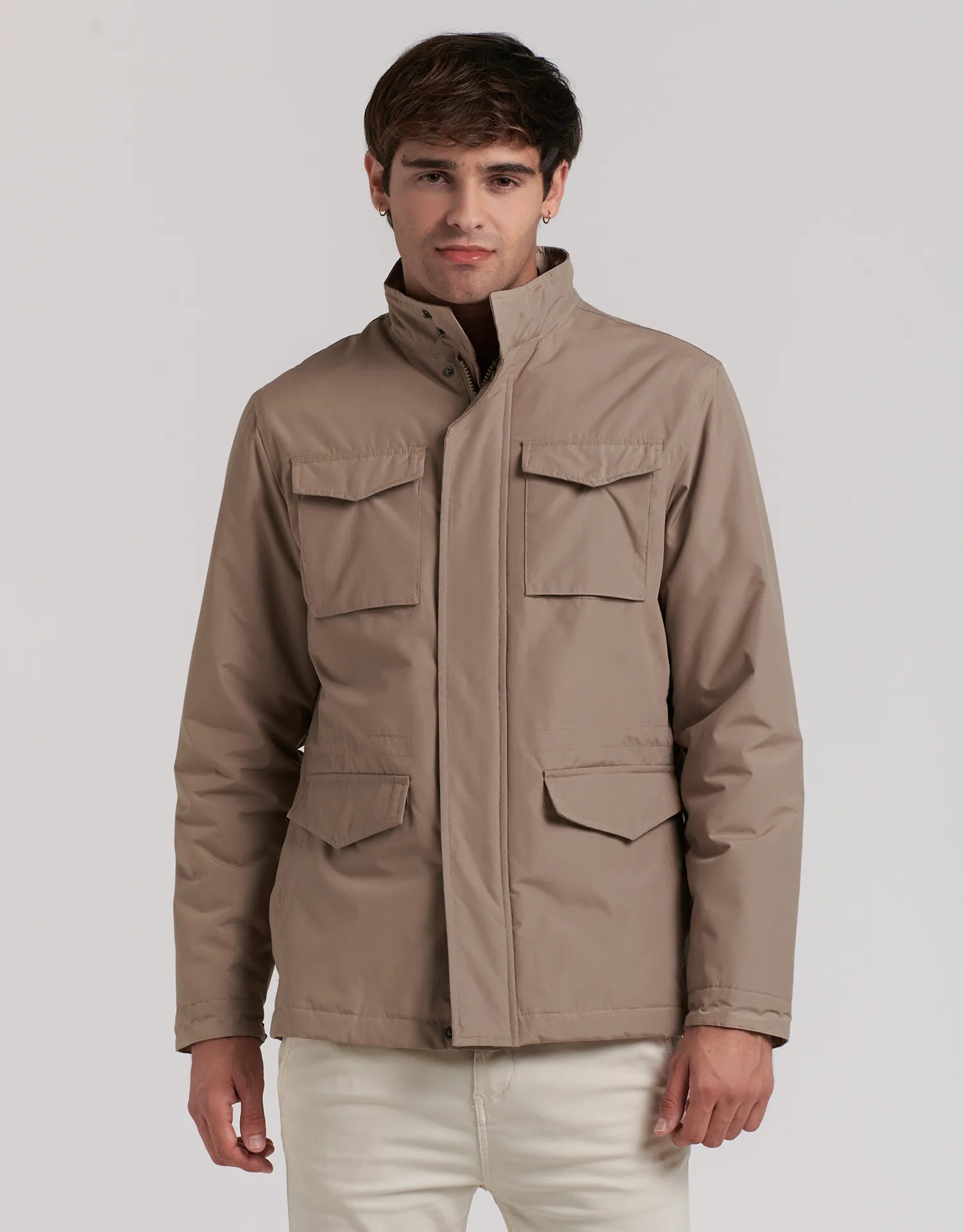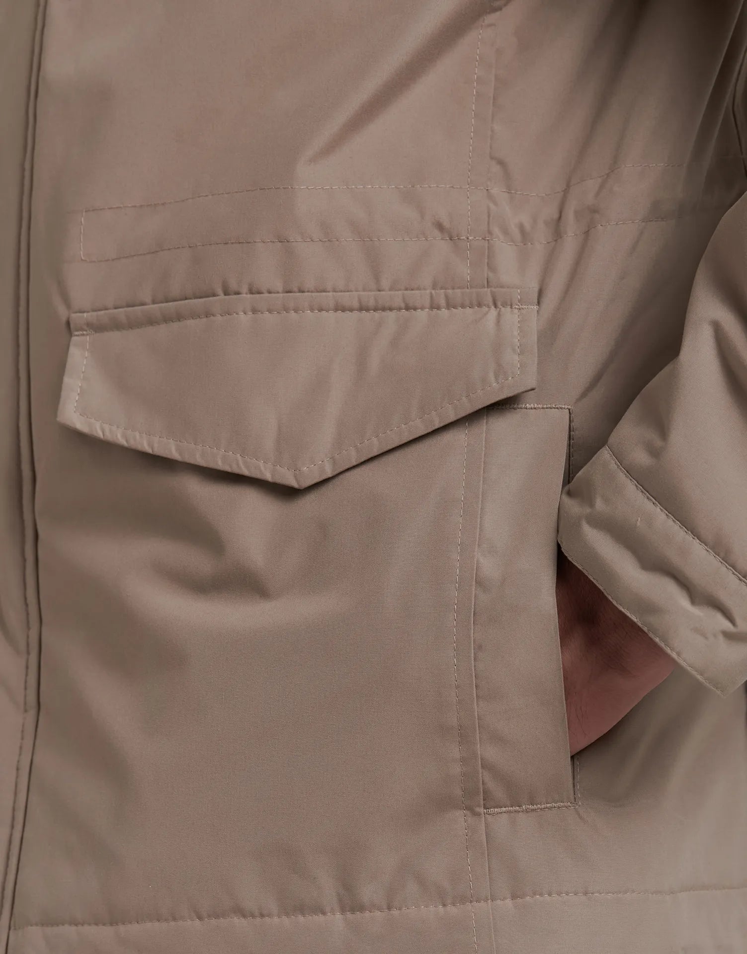 - Tejido exterior de acabado mate con tacto suave y estructura resistente al viento.