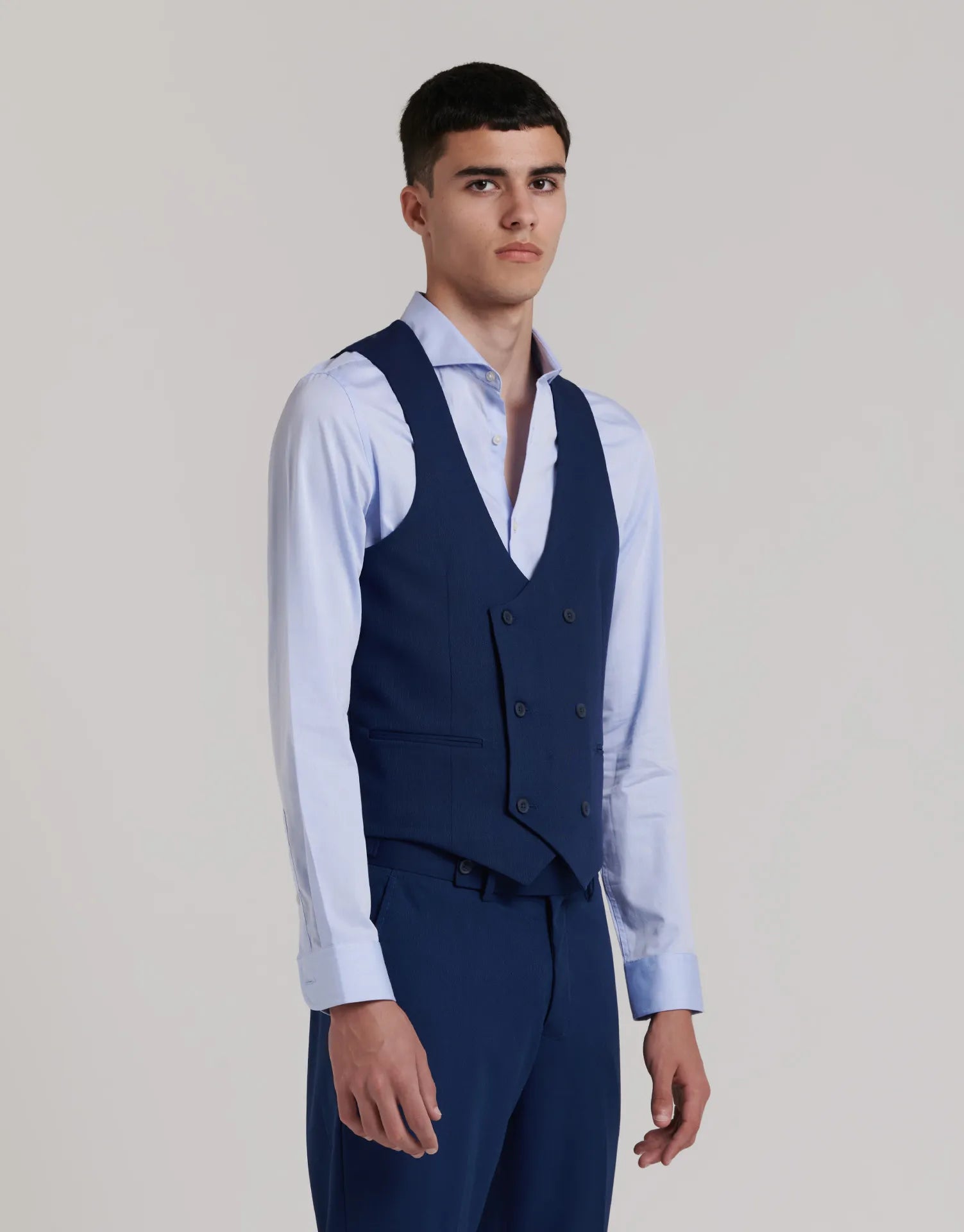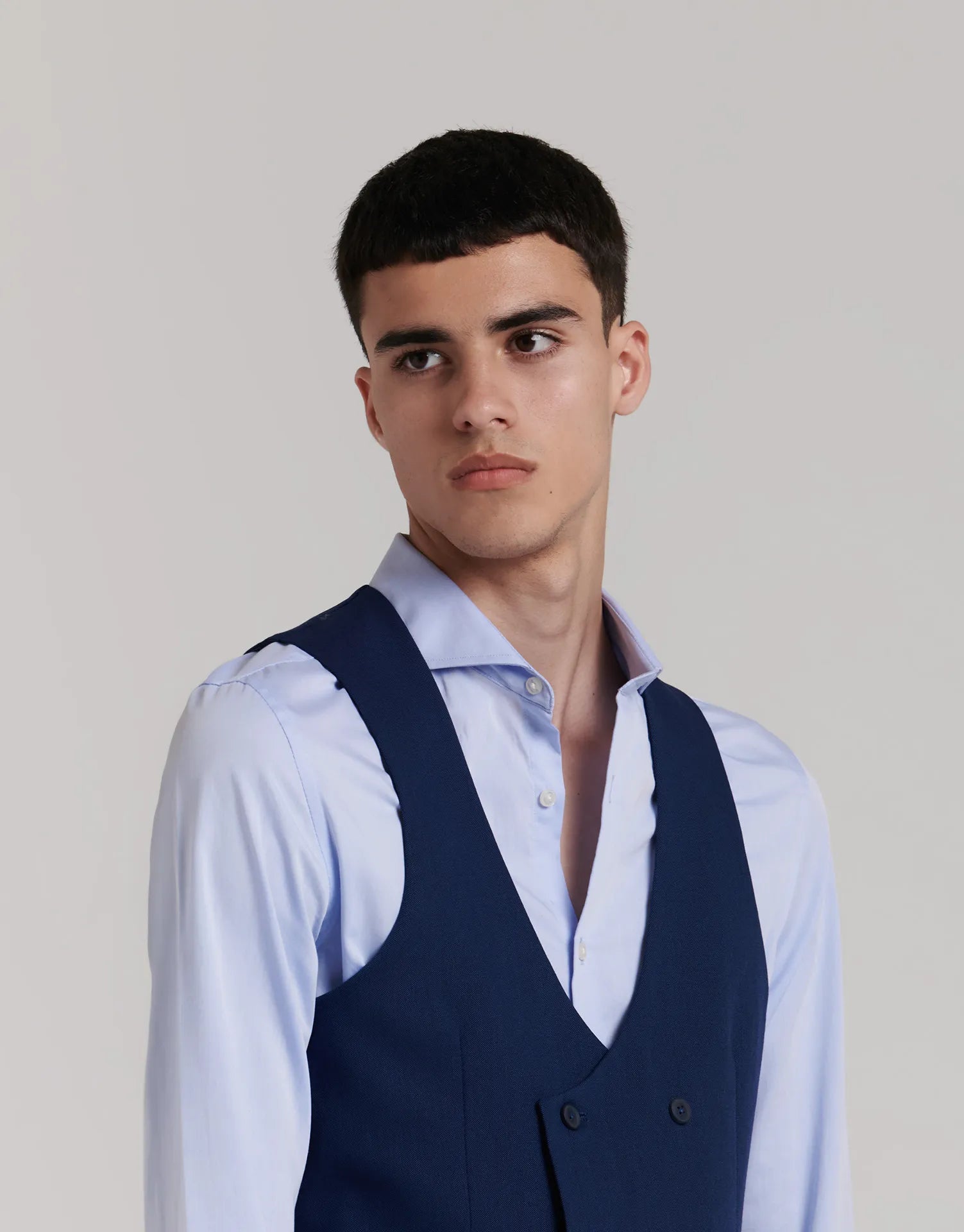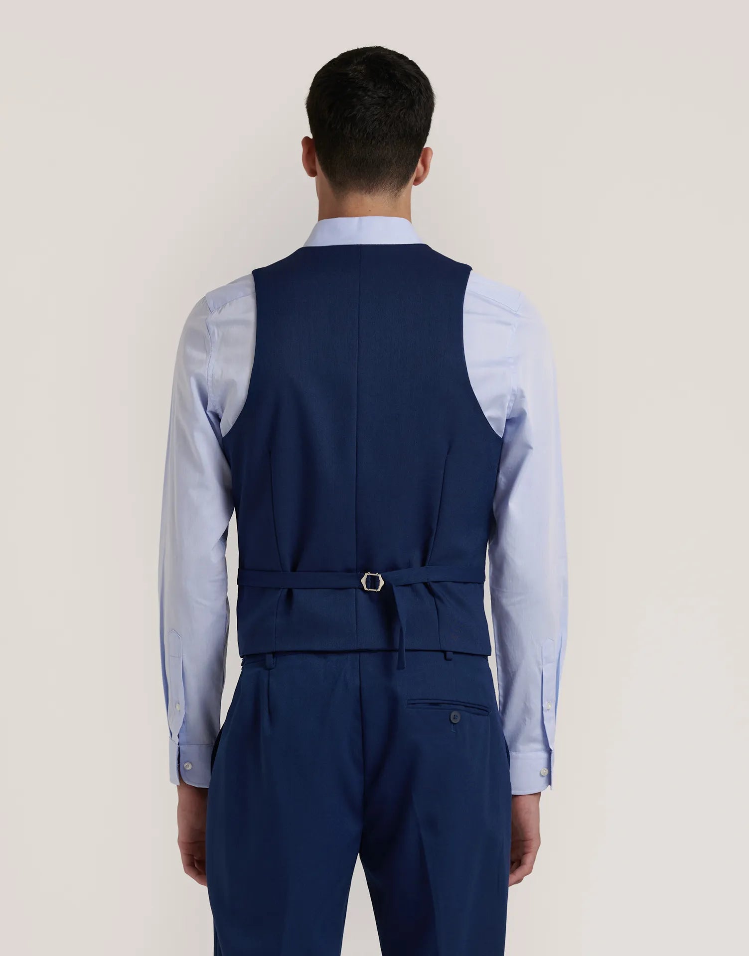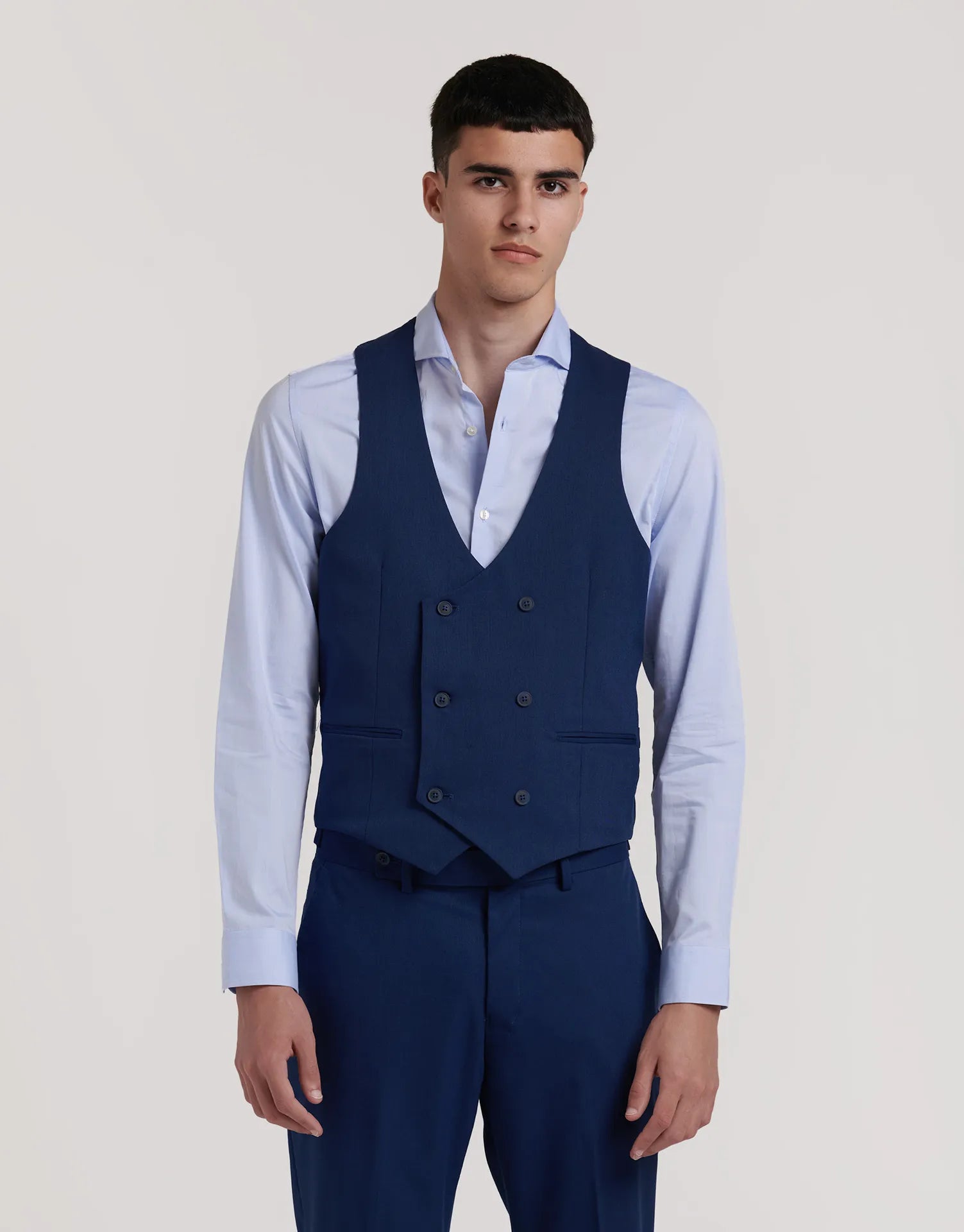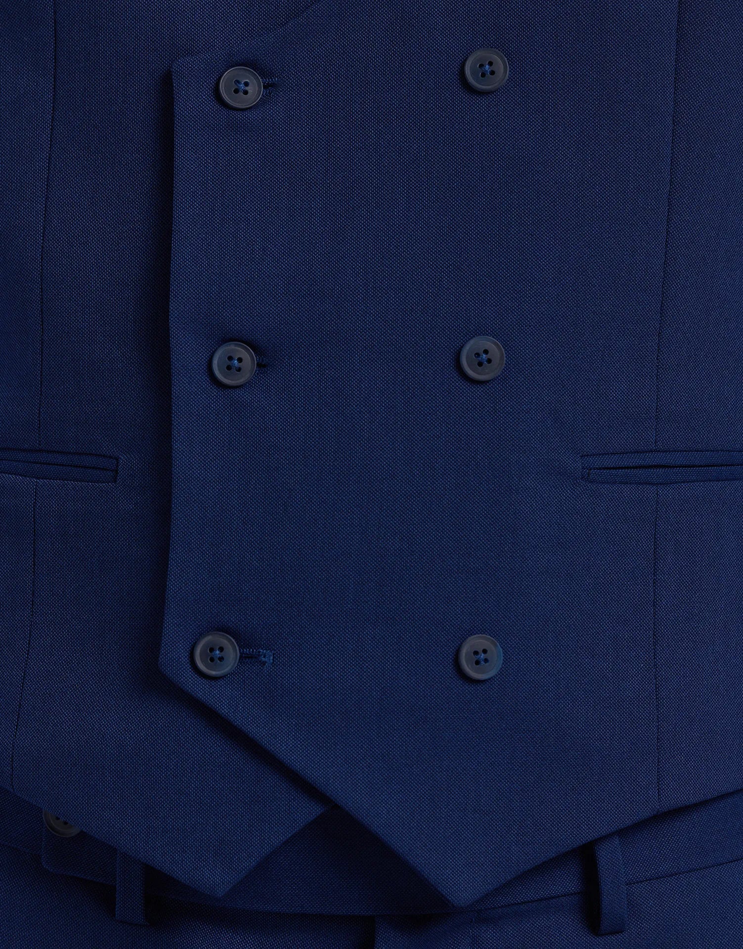 Chaleco de traje con corte cruzado confeccionado en mezcla de algodón y lino. Cierre mediante 6 botones y acabado en efecto pico. Dos falsos bolsillos en la cintura y trabilla trasera para ajustarlo. | Composición: 81% poliester, 17% viscosa, 2% elastano