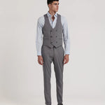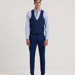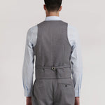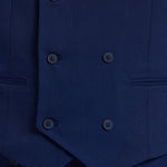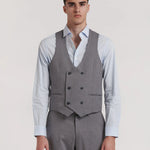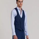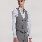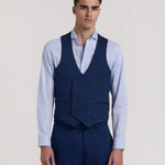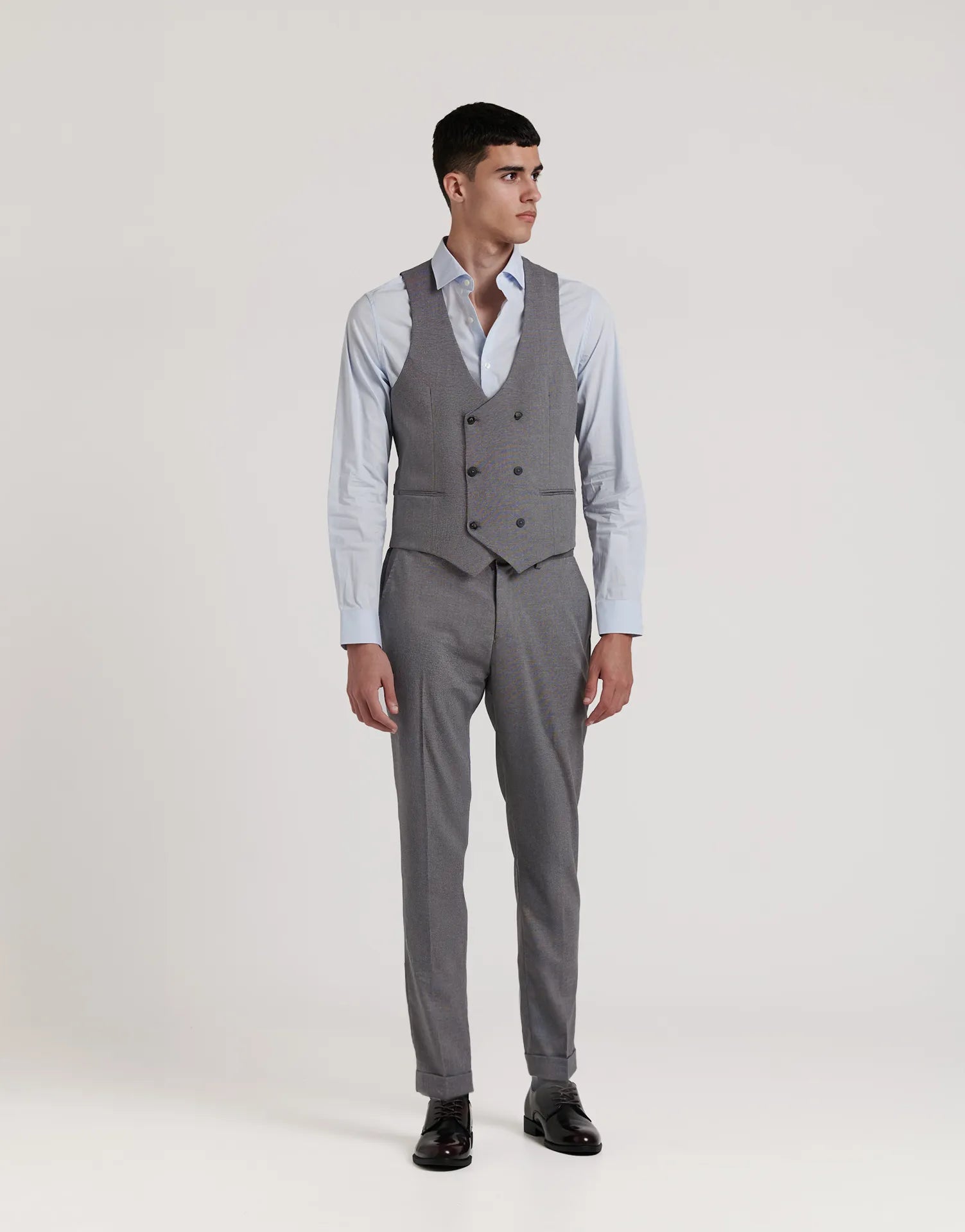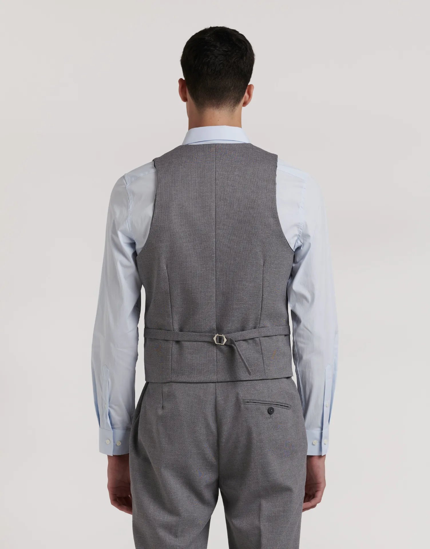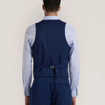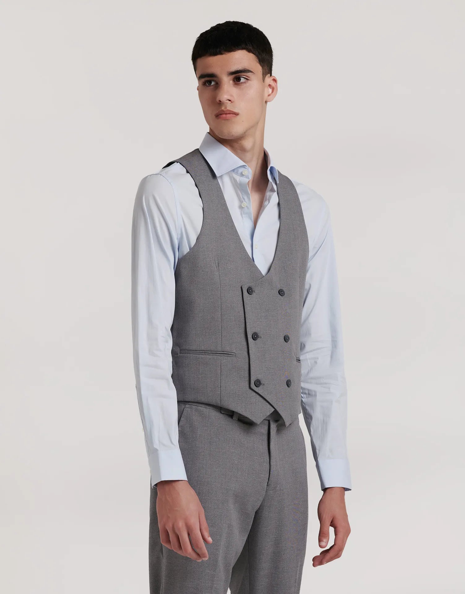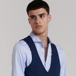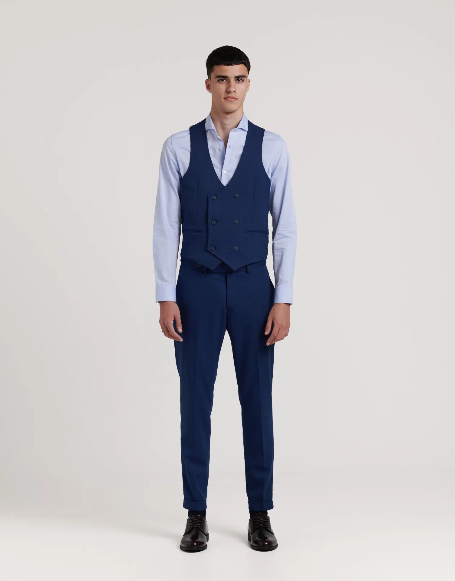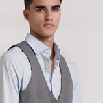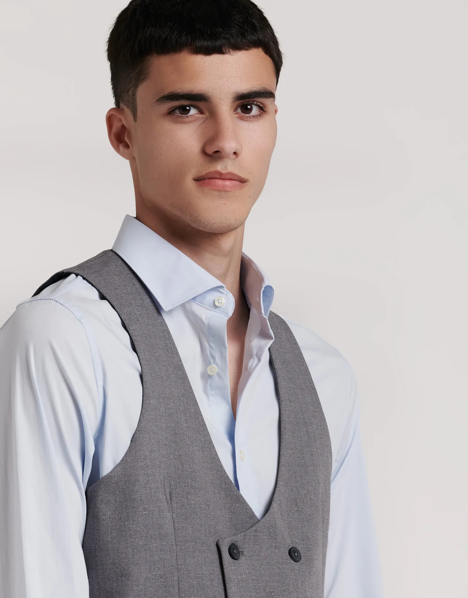 Chaleco de traje con corte cruzado confeccionado en mezcla de algodón y lino. Cierre mediante 6 botones y acabado en efecto pico. Dos falsos bolsillos en la cintura y trabilla trasera para ajustarlo. | Composición: 81% poliester, 17% viscosa, 2% elastano