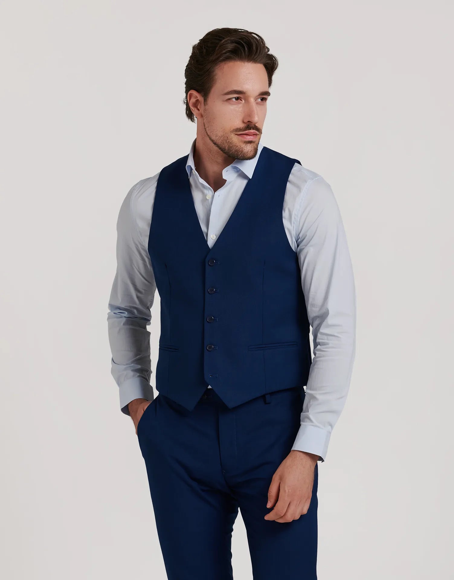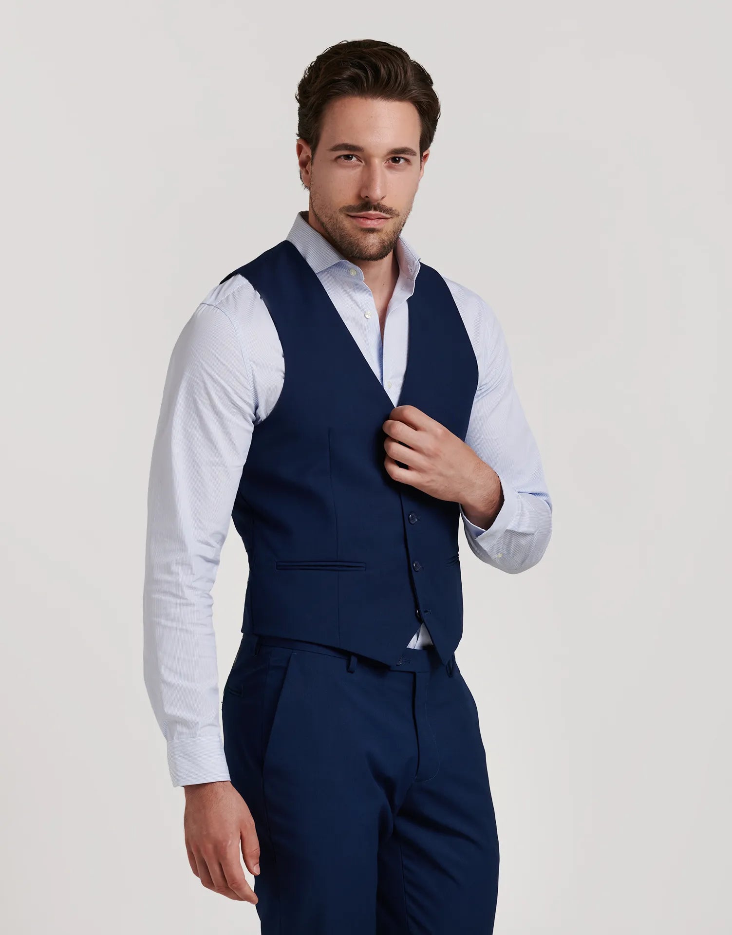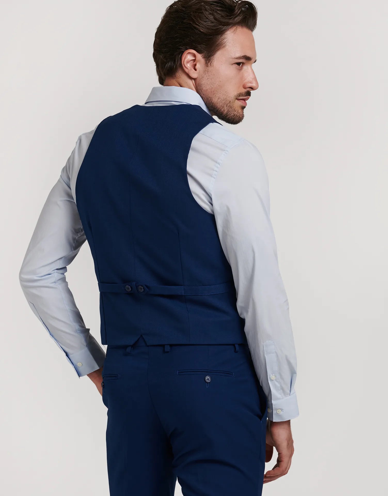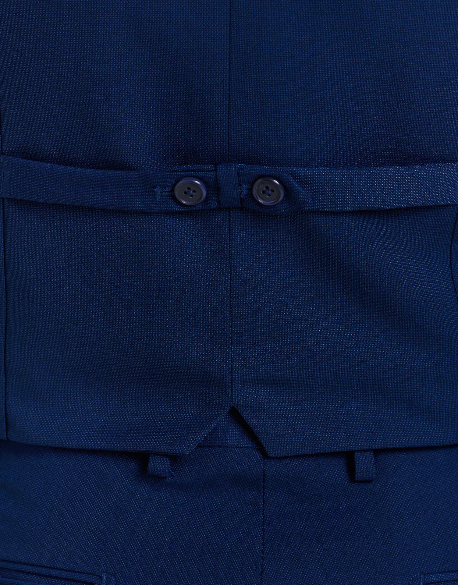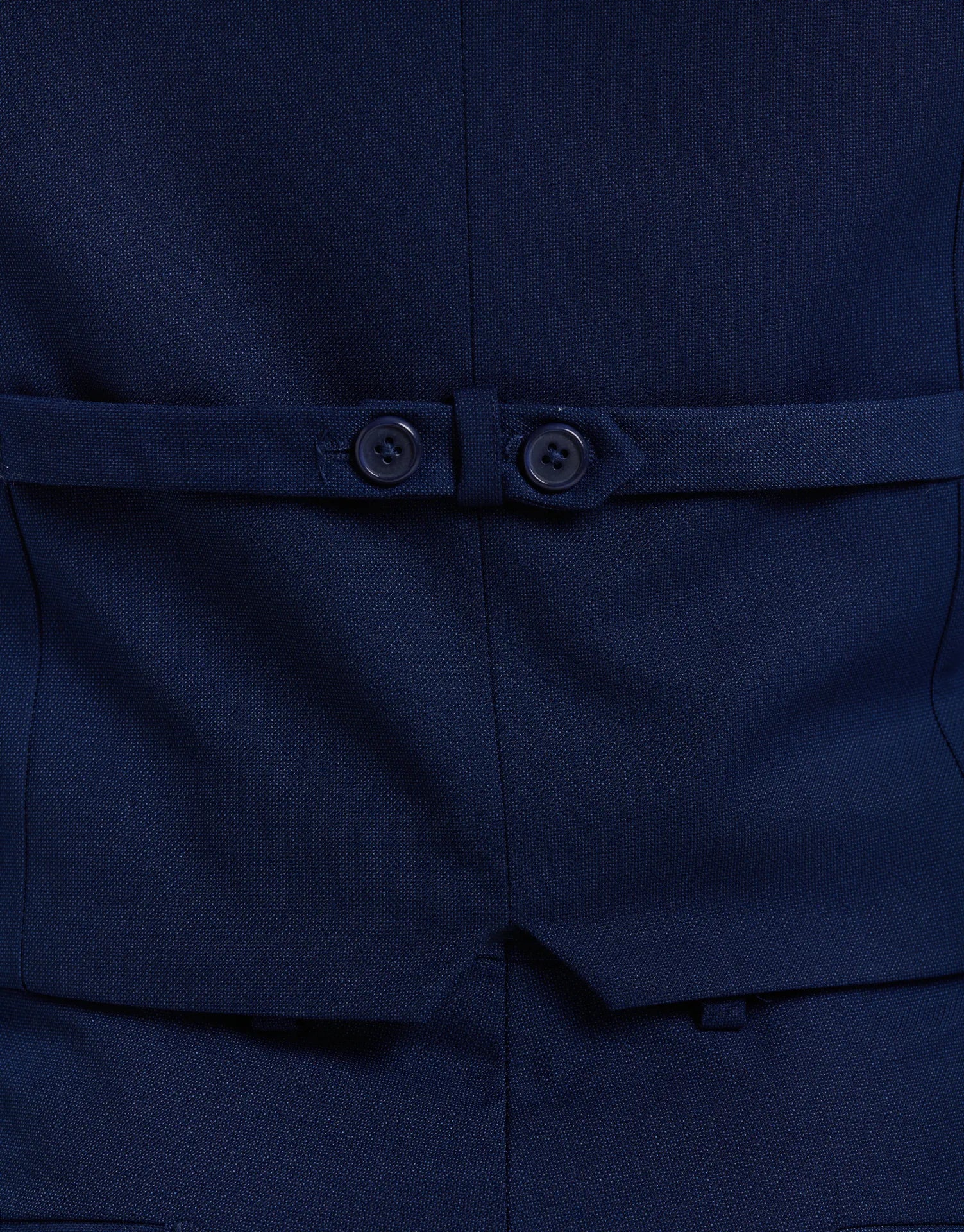 Chaleco de traje entallado confeccionado en tejido ojo de perdiz, ideal para aportar un toque extra de elegancia al conjunto. Con cierre de cinco botones, bolsillos discretos en los laterales y ajuste trasero, está diseñado para mantener una silueta limpia y estructurada sin perder comodidad.