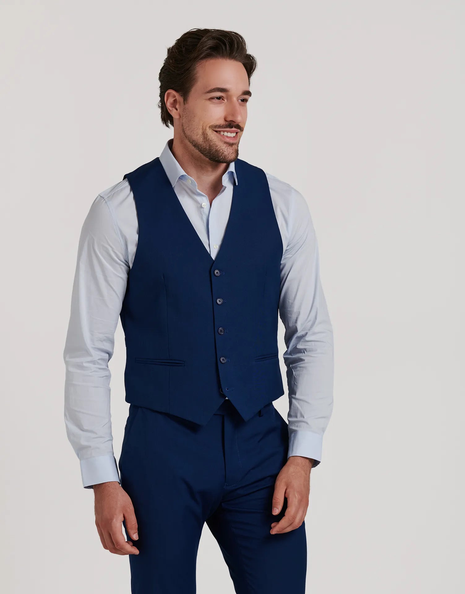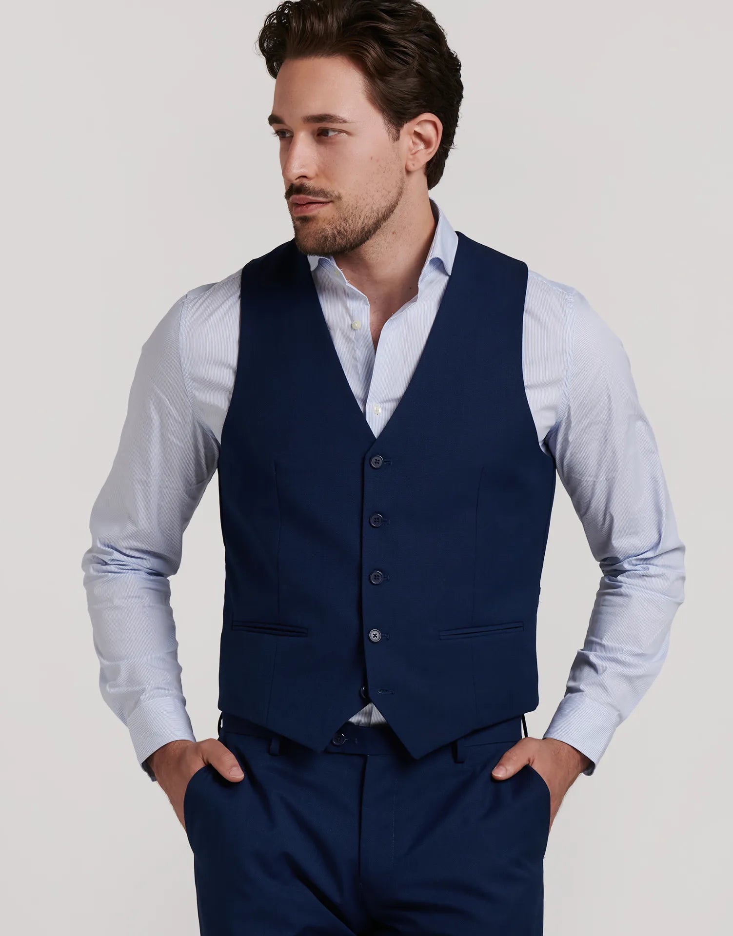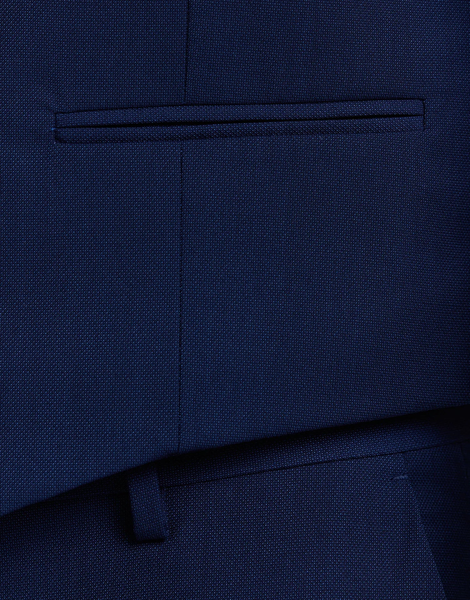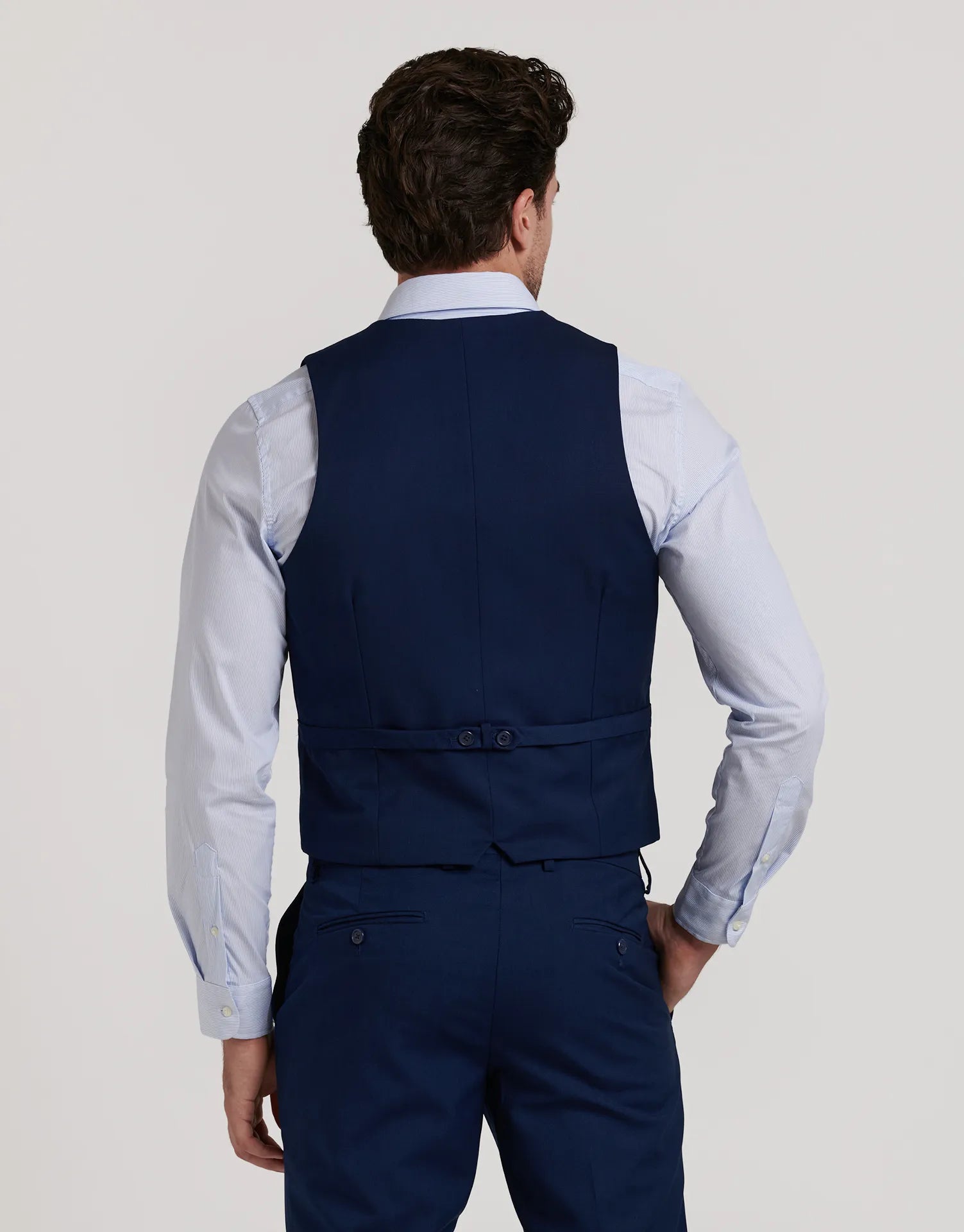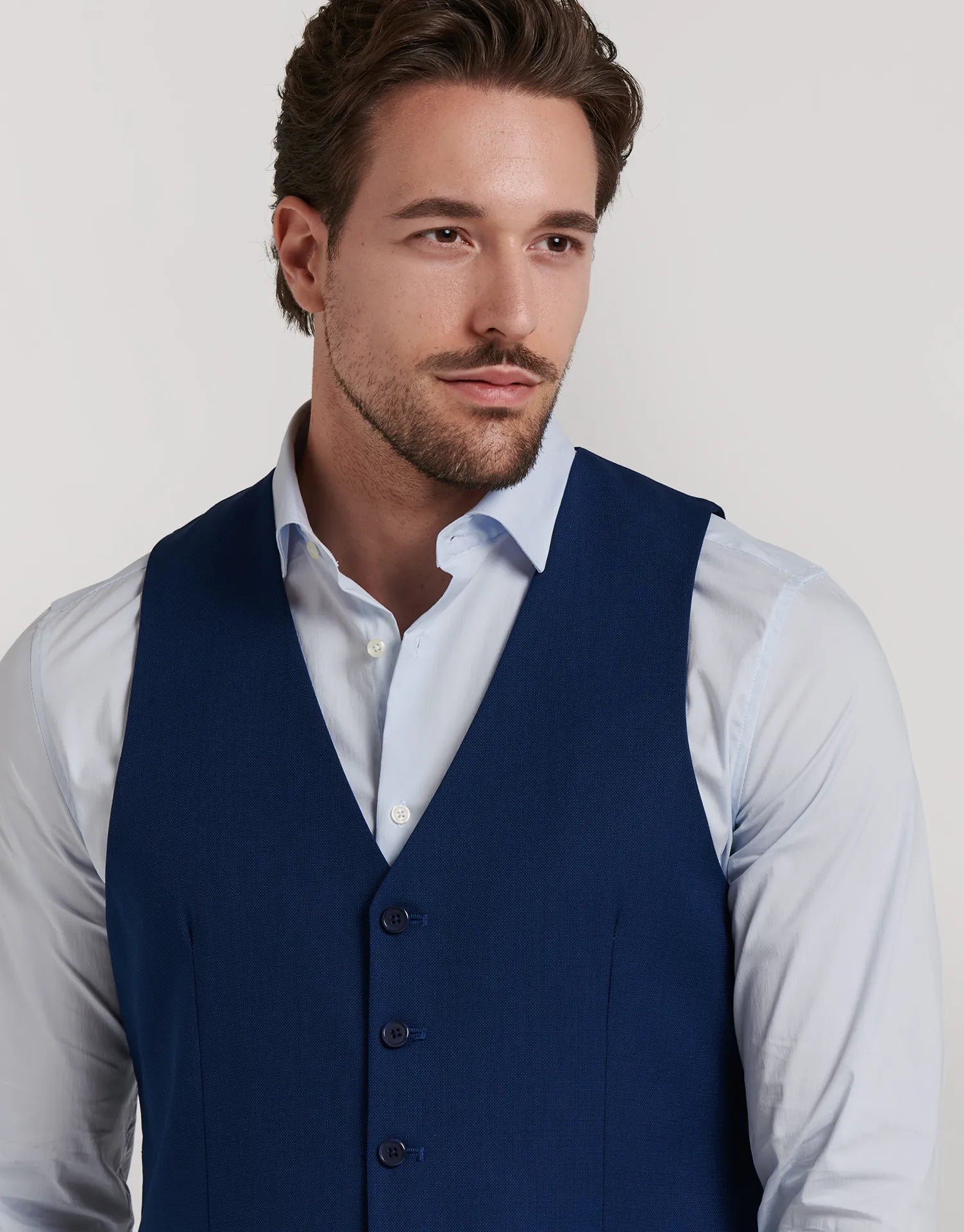 Chaleco de traje entallado confeccionado en tejido ojo de perdiz, ideal para aportar un toque extra de elegancia al conjunto. Con cierre de cinco botones, bolsillos discretos en los laterales y ajuste trasero, está diseñado para mantener una silueta limpia y estructurada sin perder comodidad.