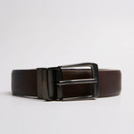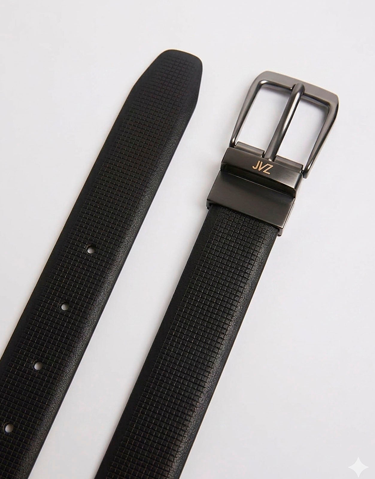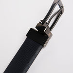Cinturón de vestir para hombre con acabado texturizado, diseño reversible y hebilla metálica. Un complemento elegante y versátil para combinar con trajes, pantalones de vestir y looks formales con un estilo sofisticado.