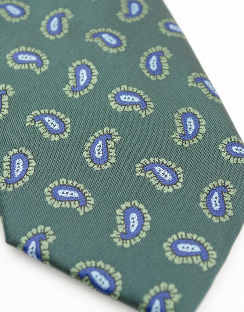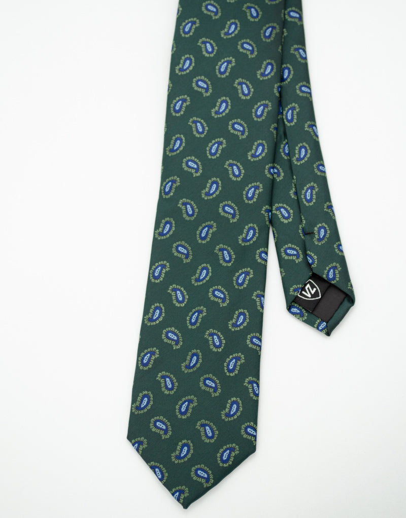 Corbata con diseño estampado tipo paisley, confeccionada en 100% poliéster. Medidas: 8 cm ancho de la pala y 150 cm de largo.