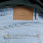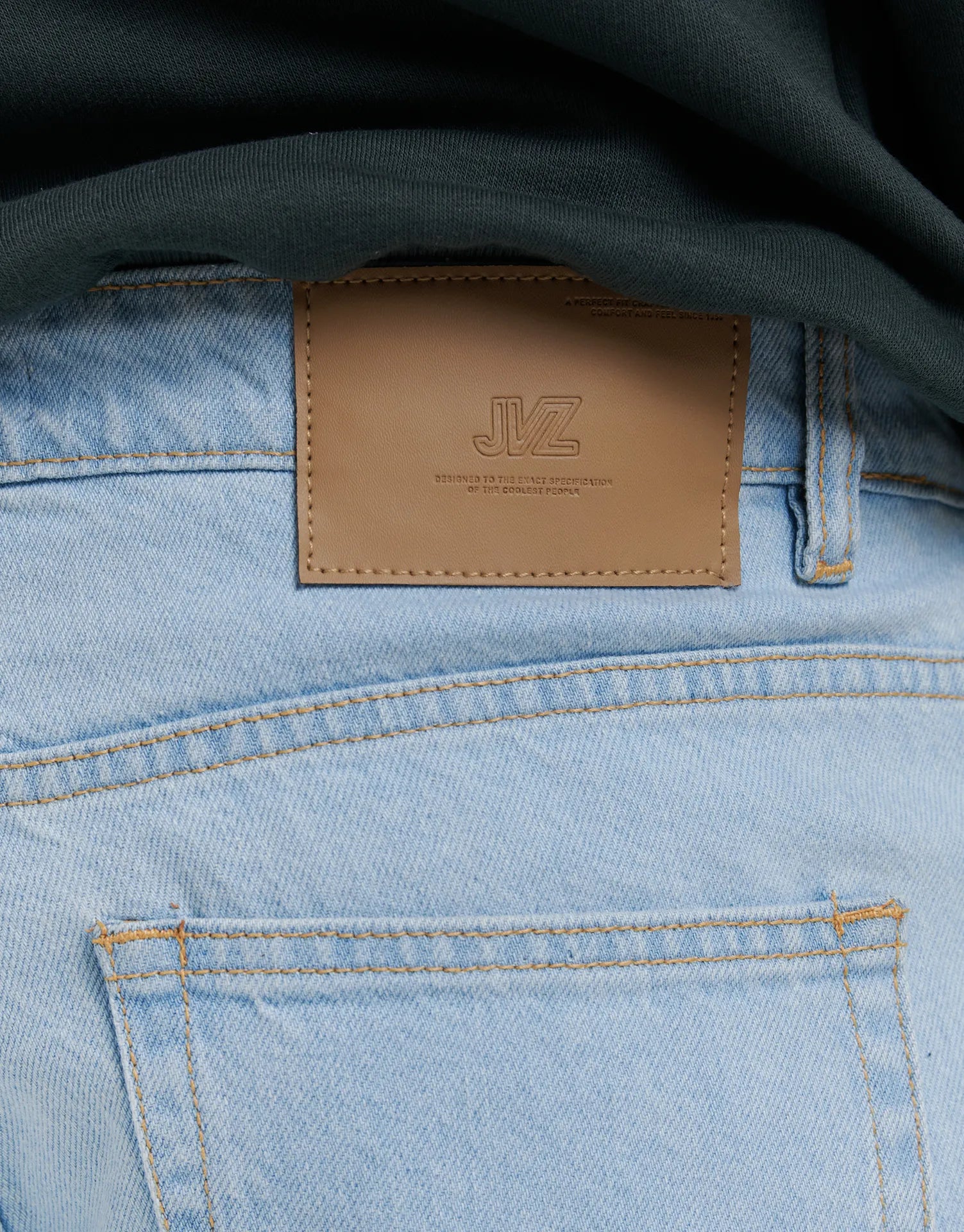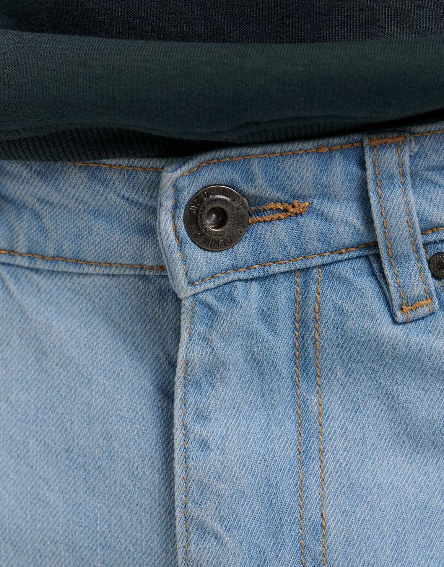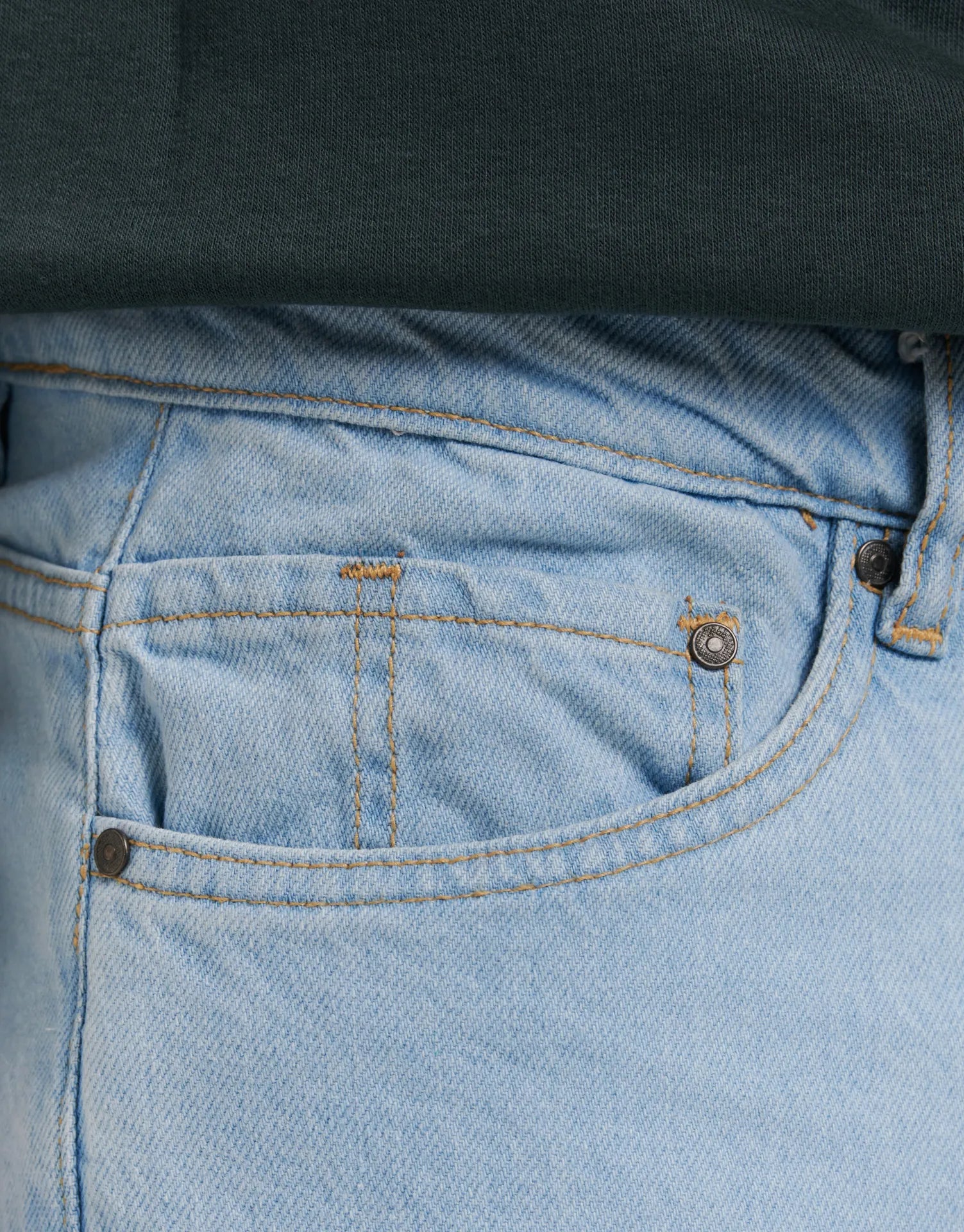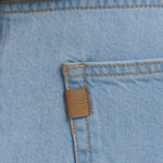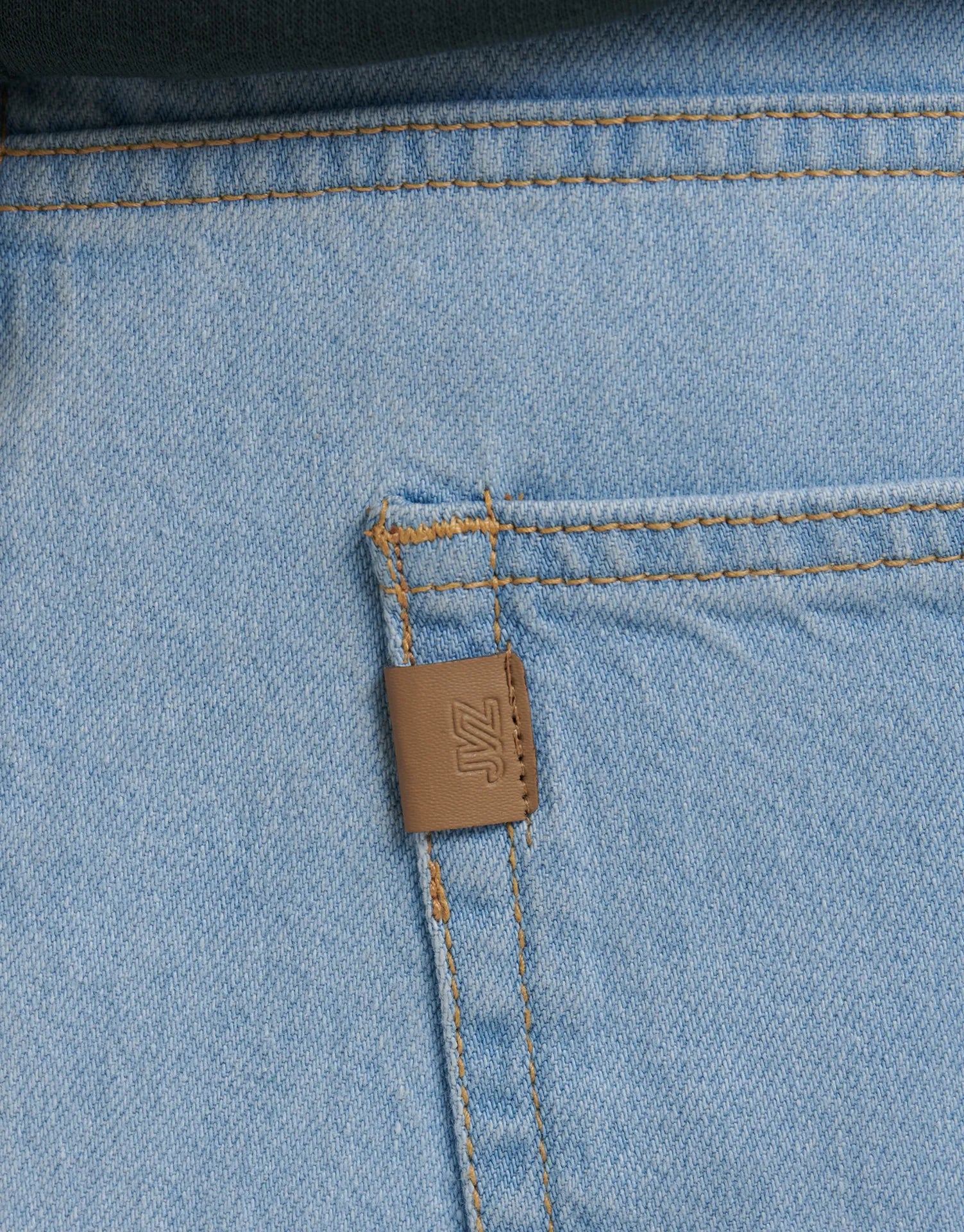 - Denim resistente en tono claro para un aire fresco y moderno.