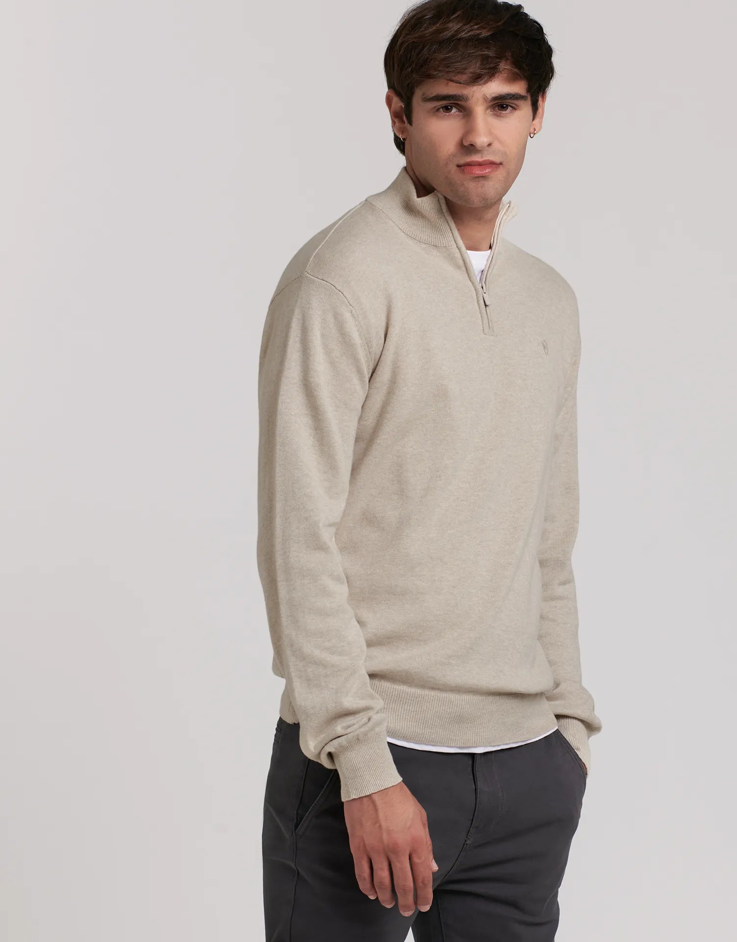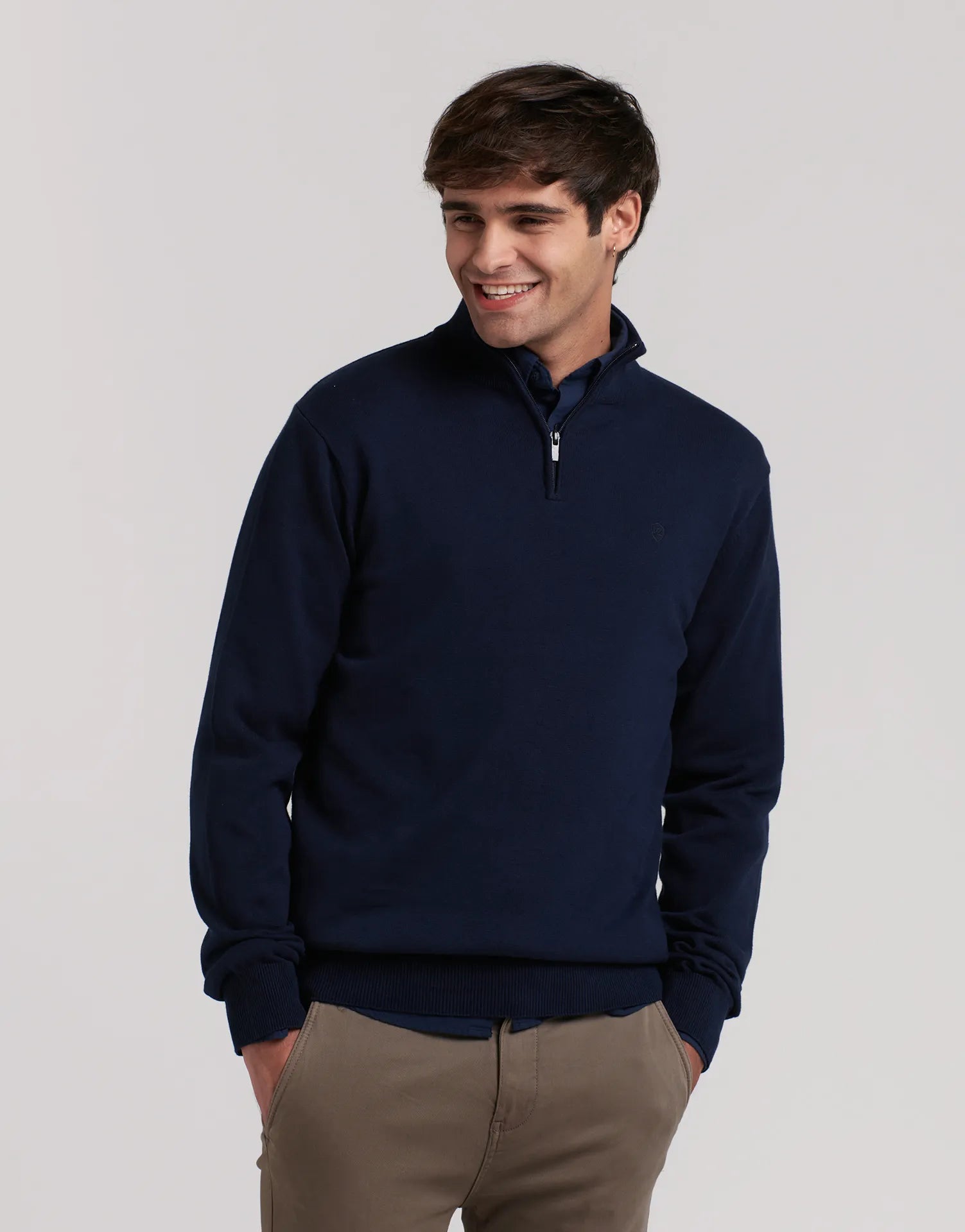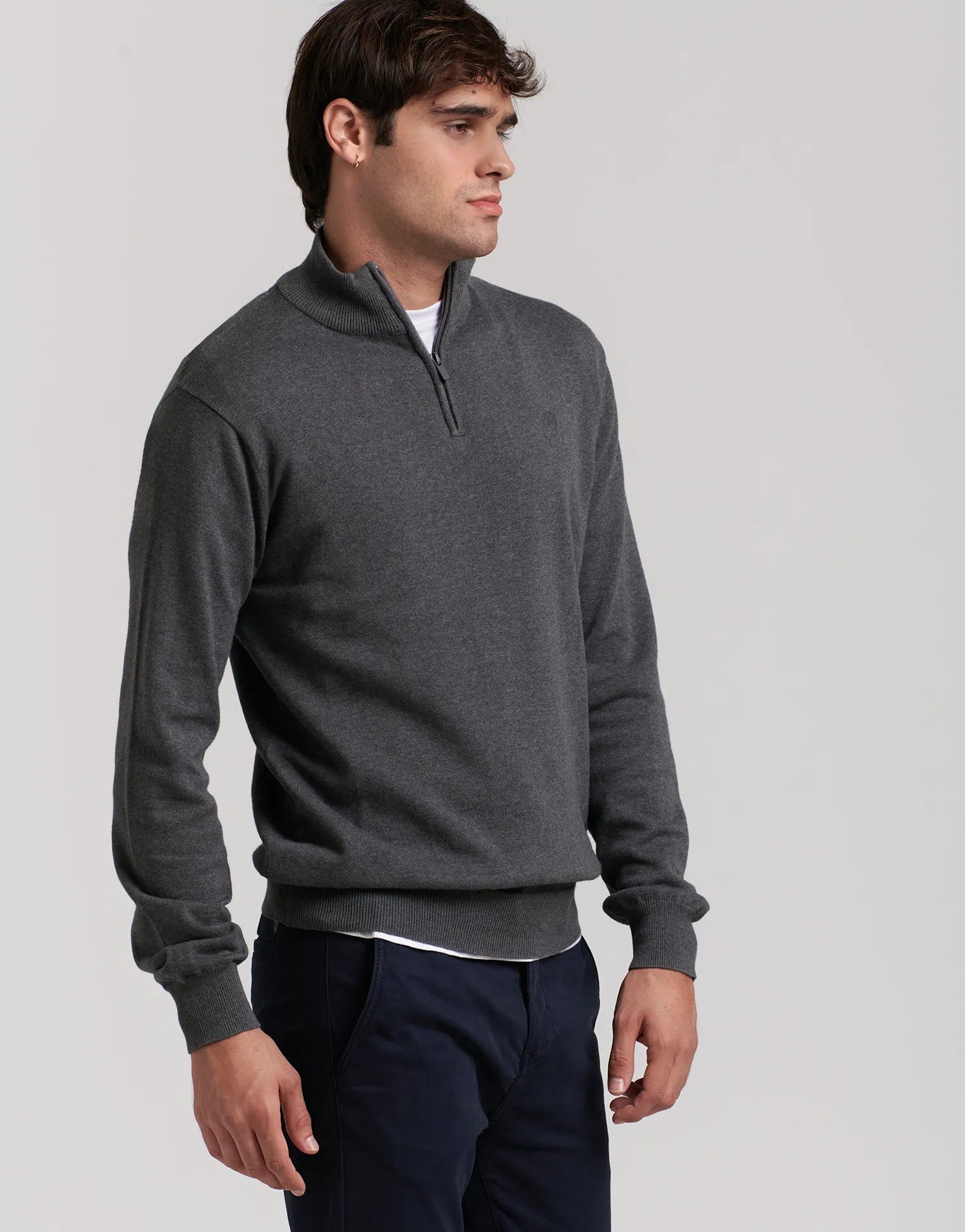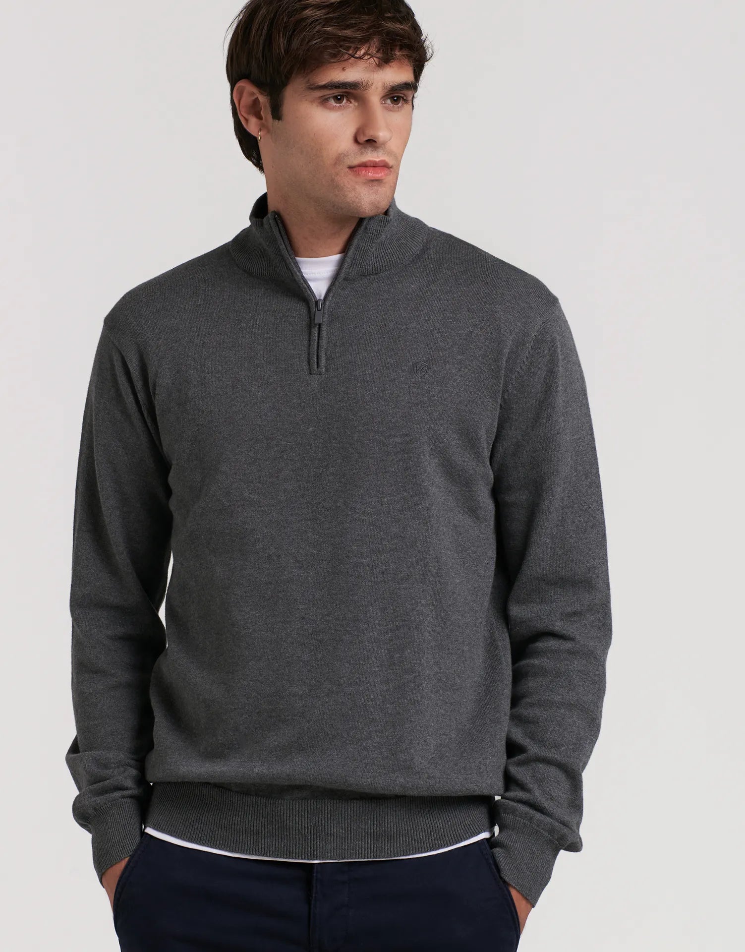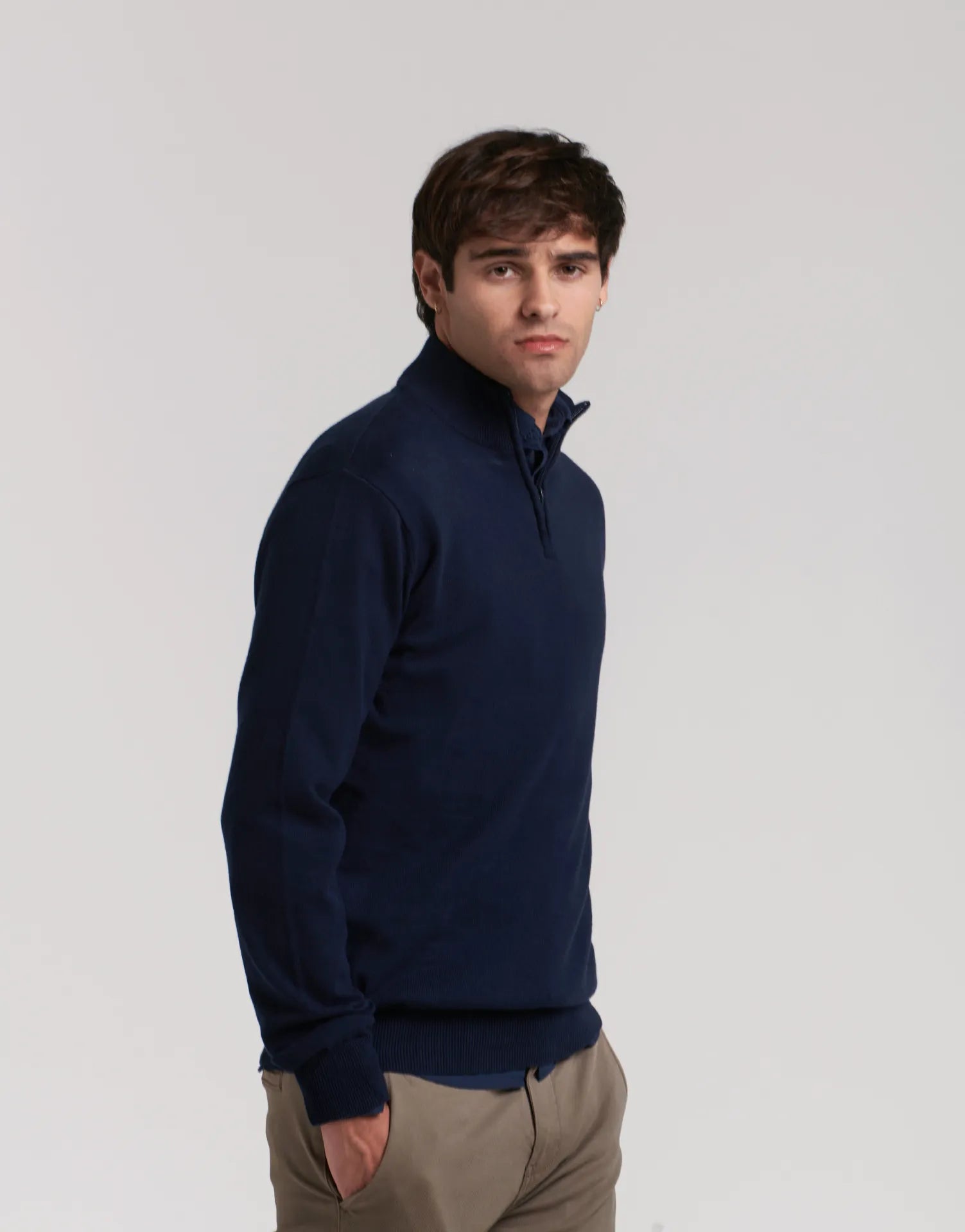 Este jersey de punto con media cremallera es una prenda esencial para el hombre que busca equilibrio entre confort y estilo. Su diseño versátil y su tejido suave lo convierten en una opción ideal para combinar con camisas o camisetas en looks casuales o más cuidados.