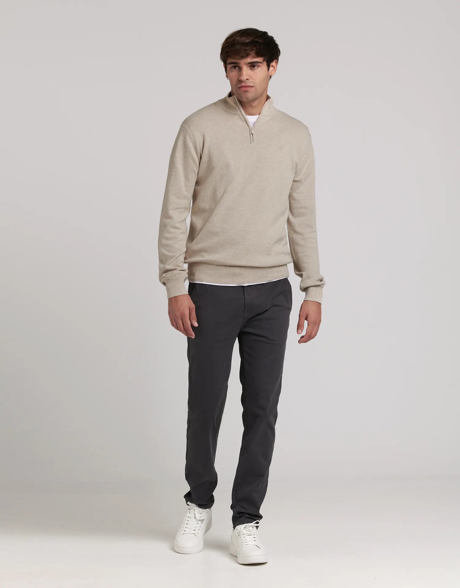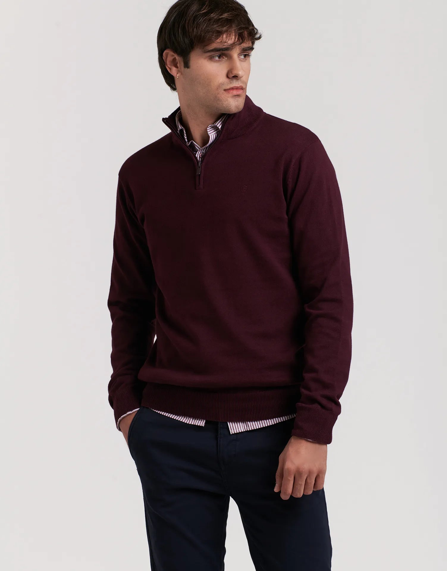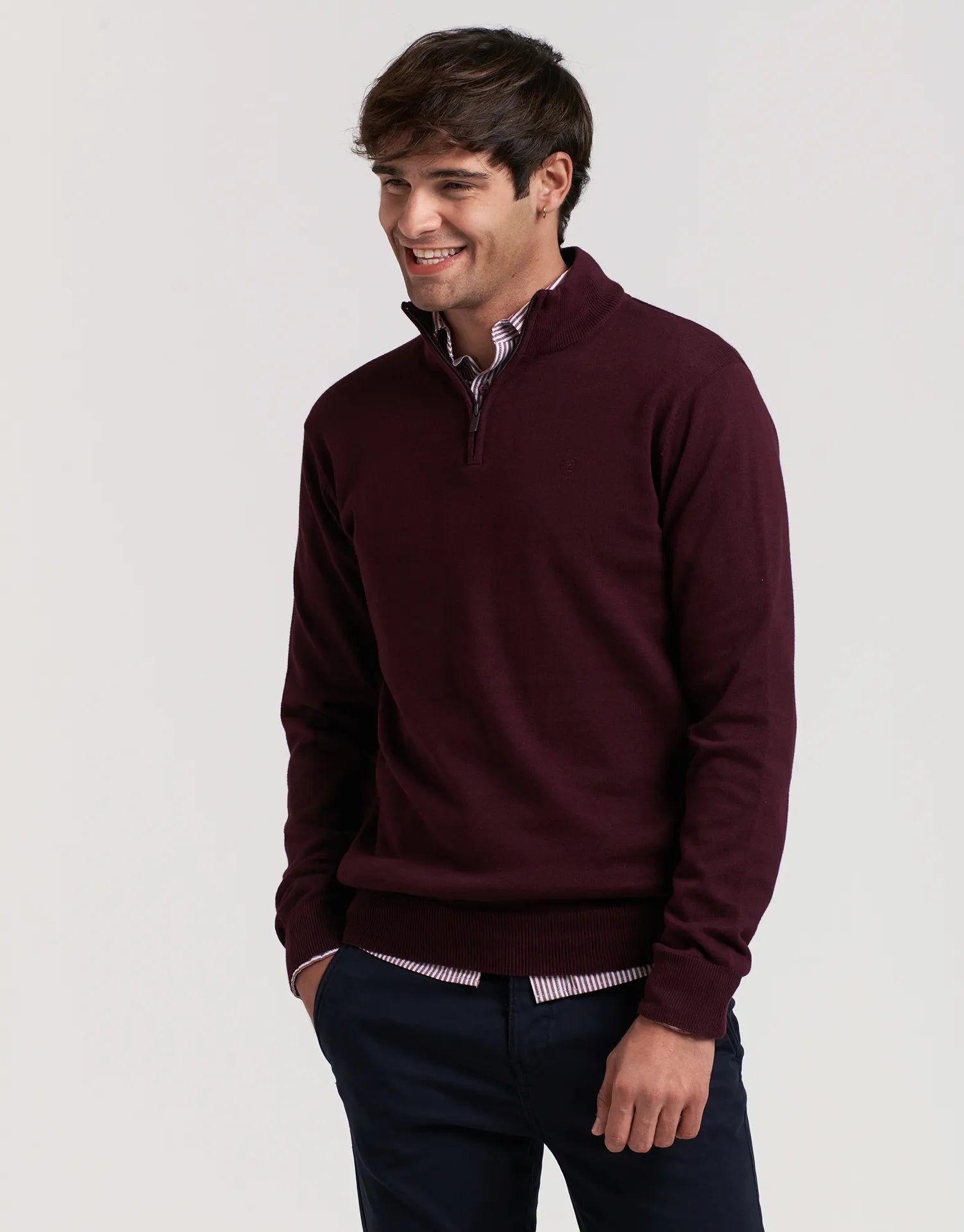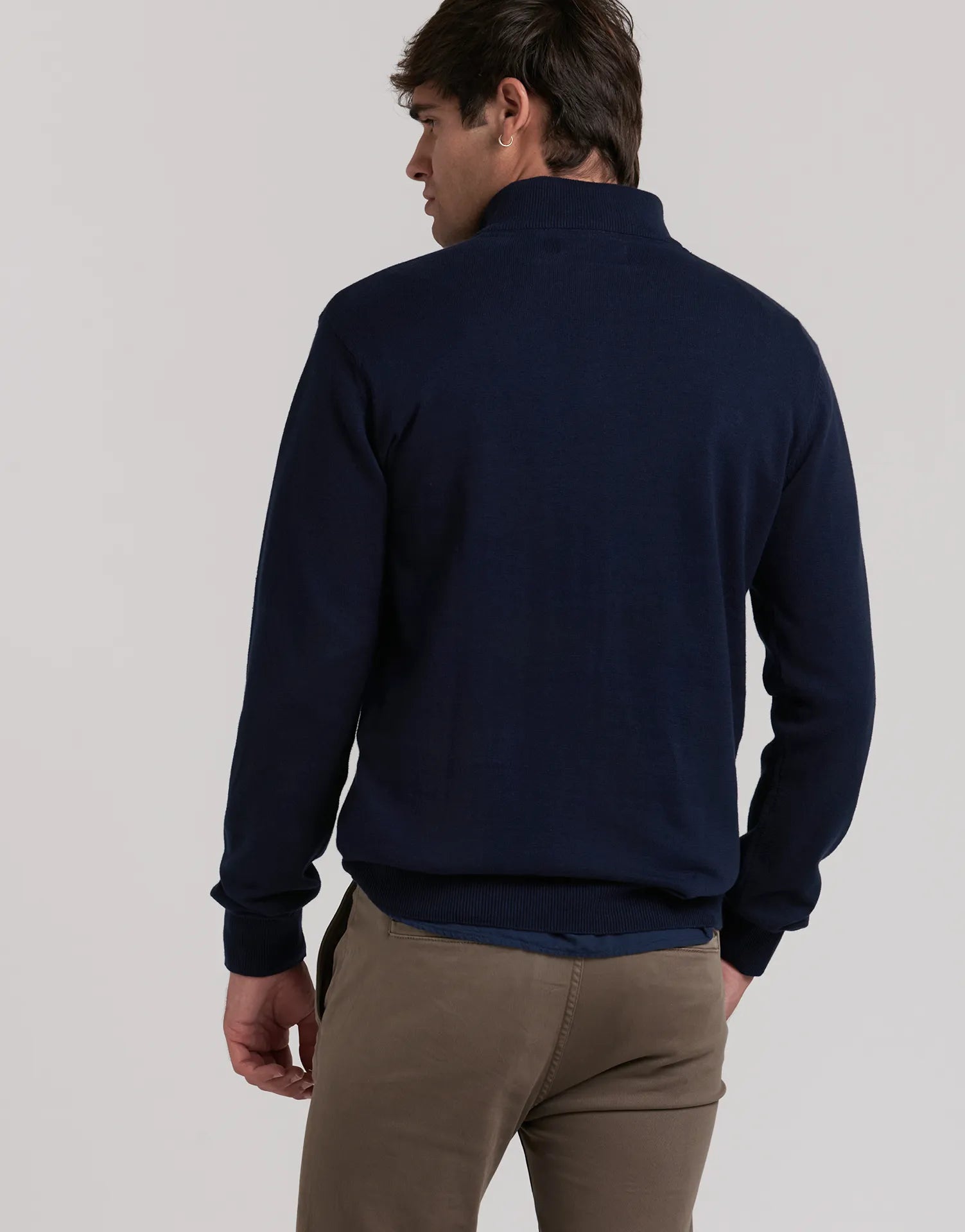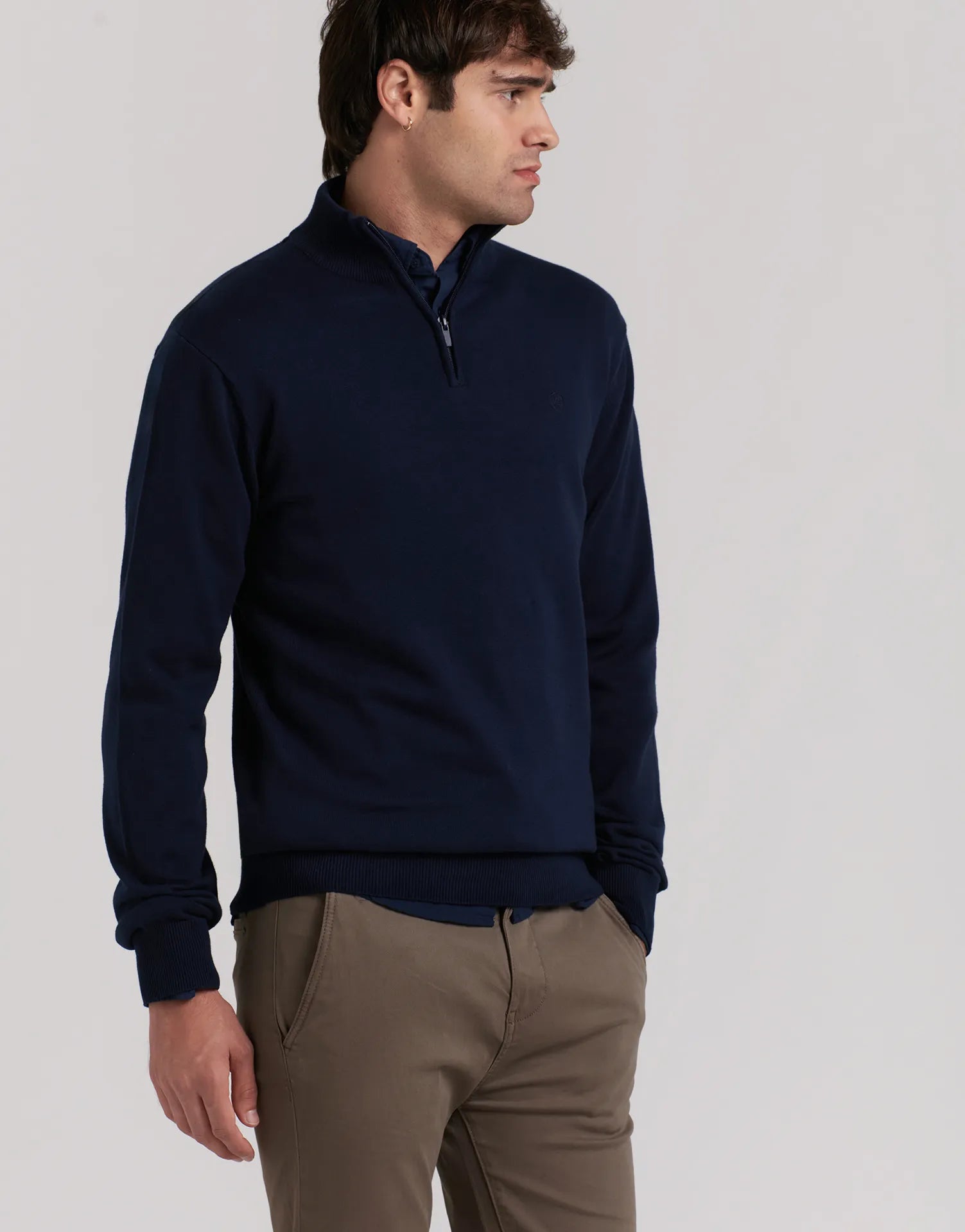Este jersey de punto con media cremallera es una prenda esencial para el hombre que busca equilibrio entre confort y estilo. Su diseño versátil y su tejido suave lo convierten en una opción ideal para combinar con camisas o camisetas en looks casuales o más cuidados.