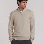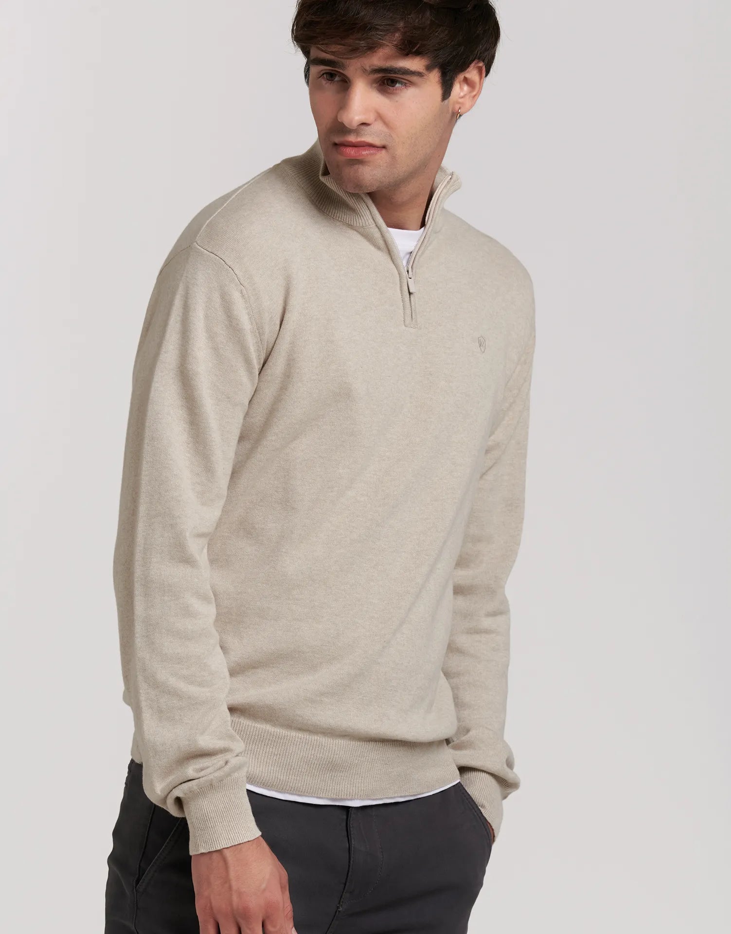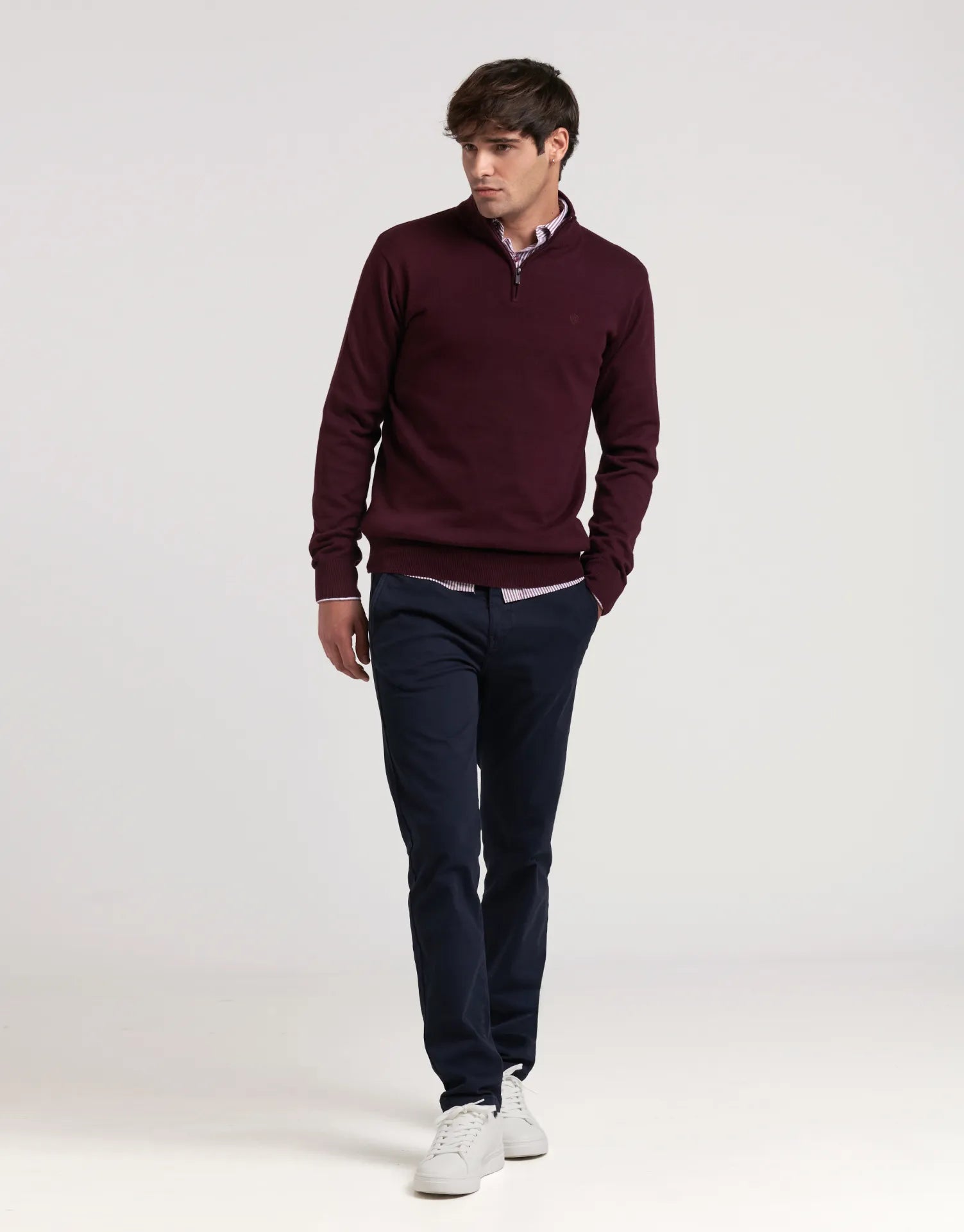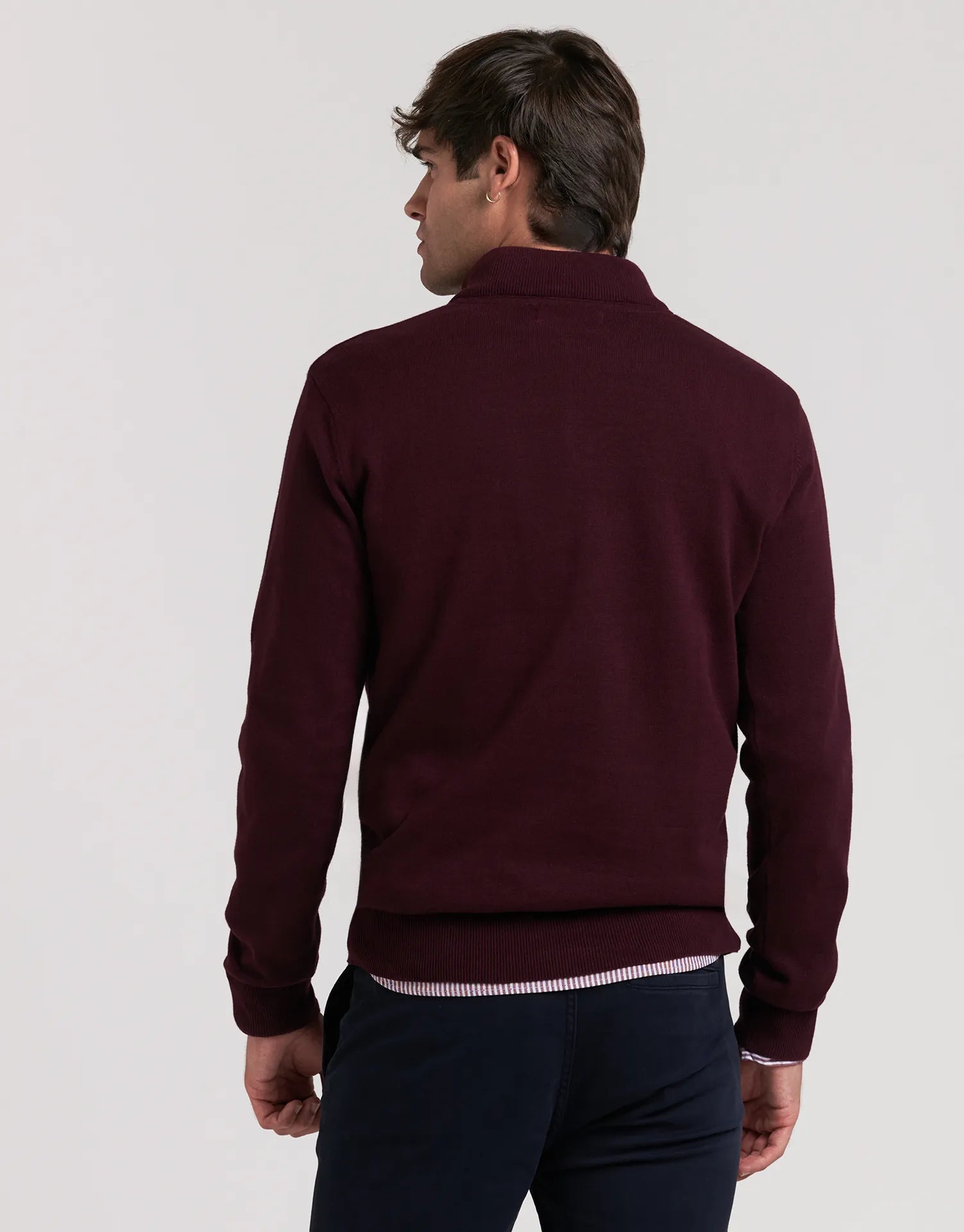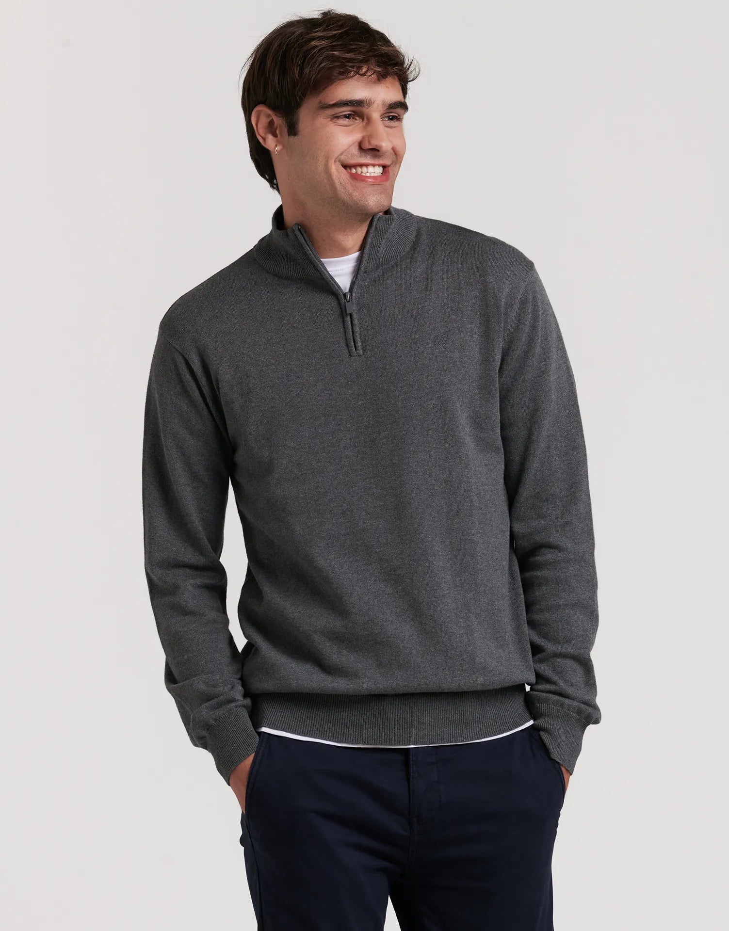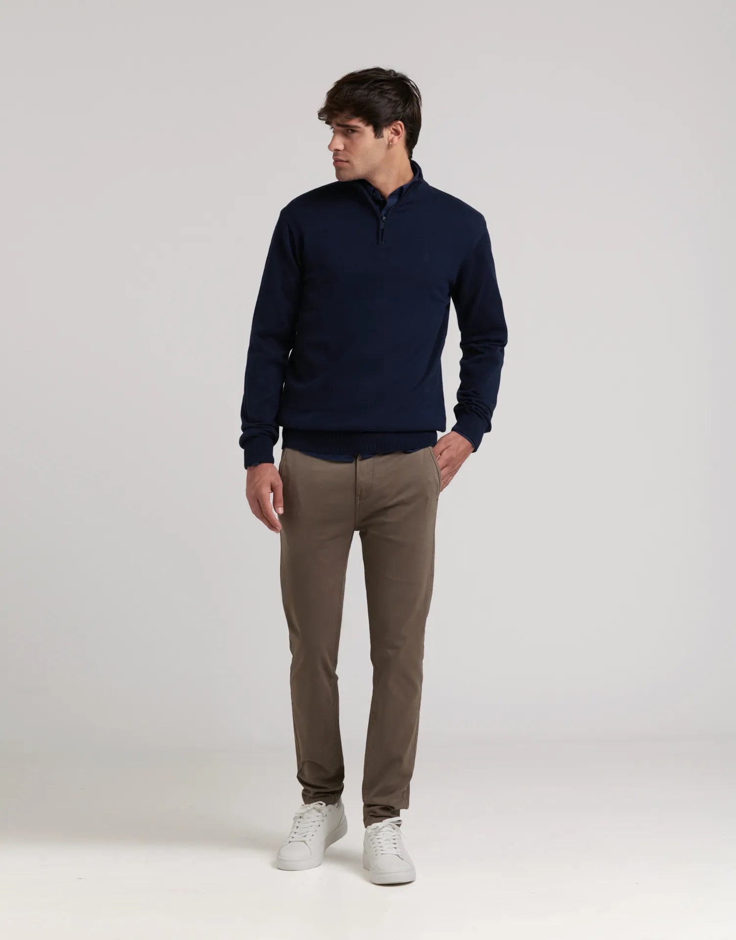 Este jersey de punto con media cremallera es una prenda esencial para el hombre que busca equilibrio entre confort y estilo. Su diseño versátil y su tejido suave lo convierten en una opción ideal para combinar con camisas o camisetas en looks casuales o más cuidados.