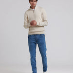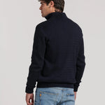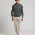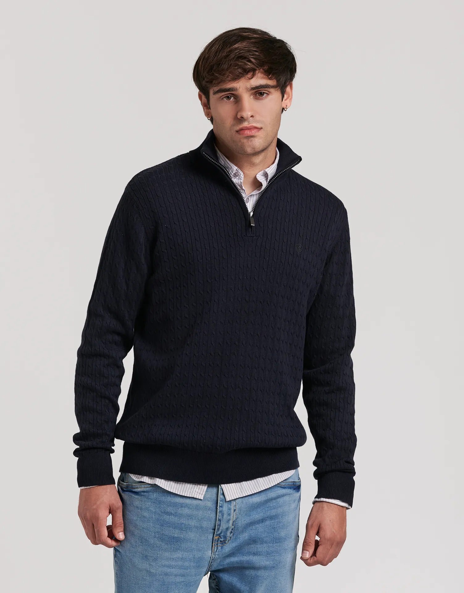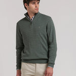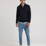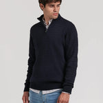 Un jersey de hombre con media cremallera que combina tradición y modernidad, perfecto para llevar con camisas, chinos o vaqueros en tus looks de otoño e invierno.