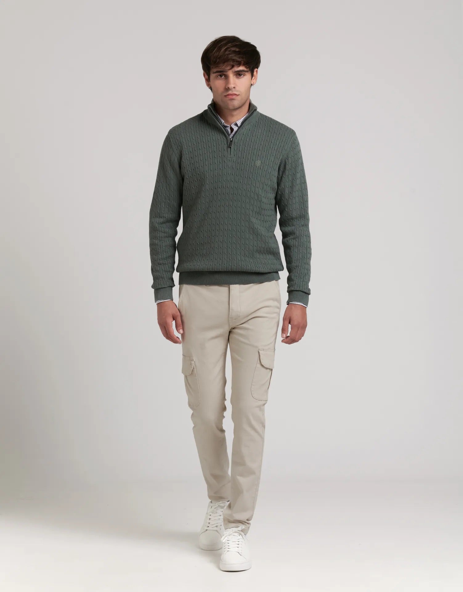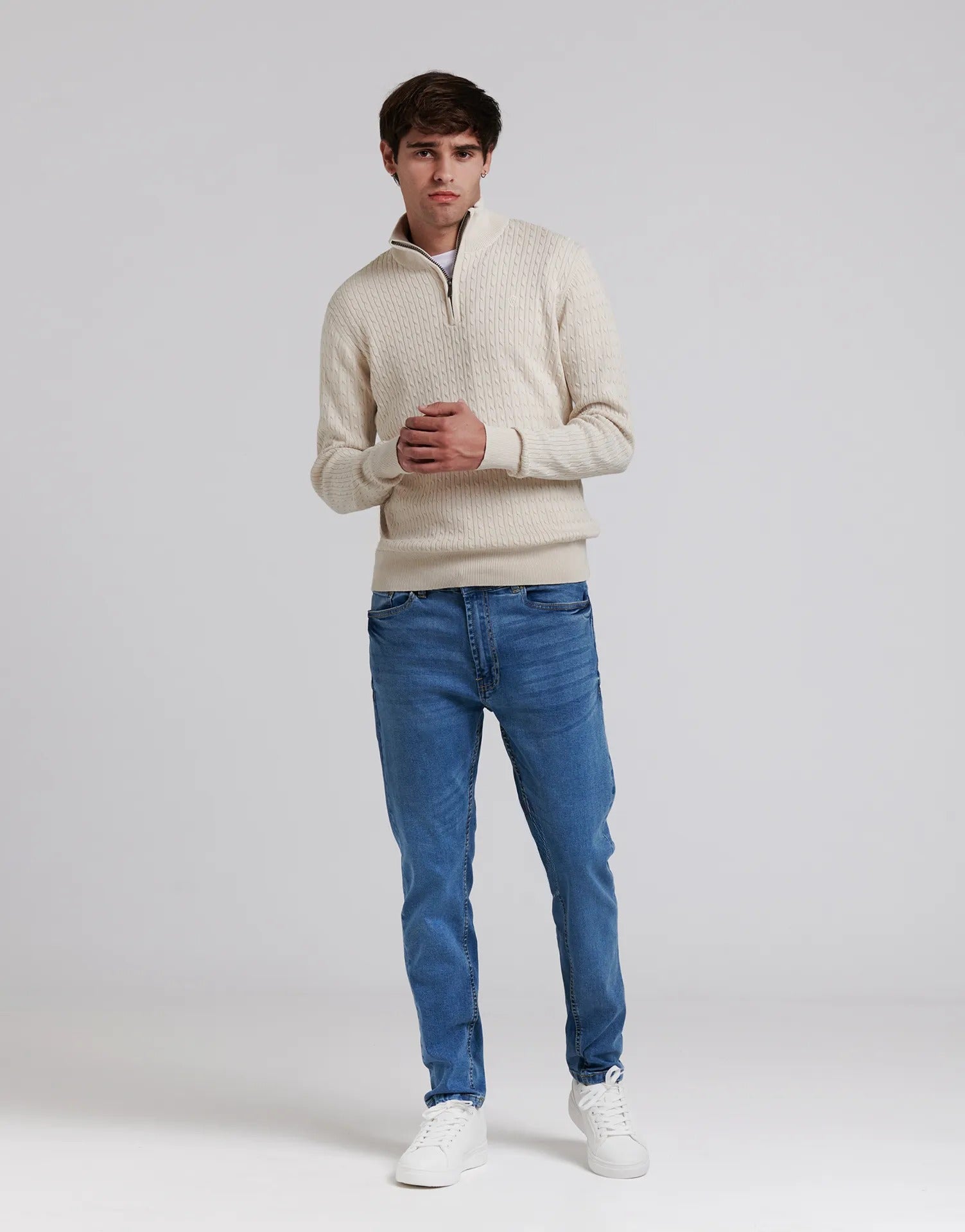 El jersey trenzado con media cremallera es un básico de invierno que aporta calidez, estilo y comodidad. Con su diseño de punto trenzado y cuello alto con media cremallera, es perfecto para crear looks casuales y elegantes al mismo tiempo.