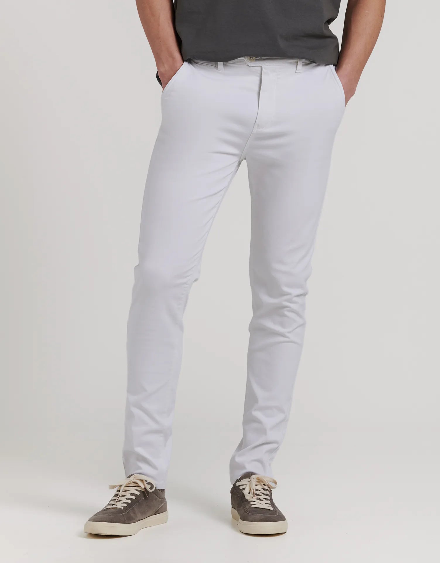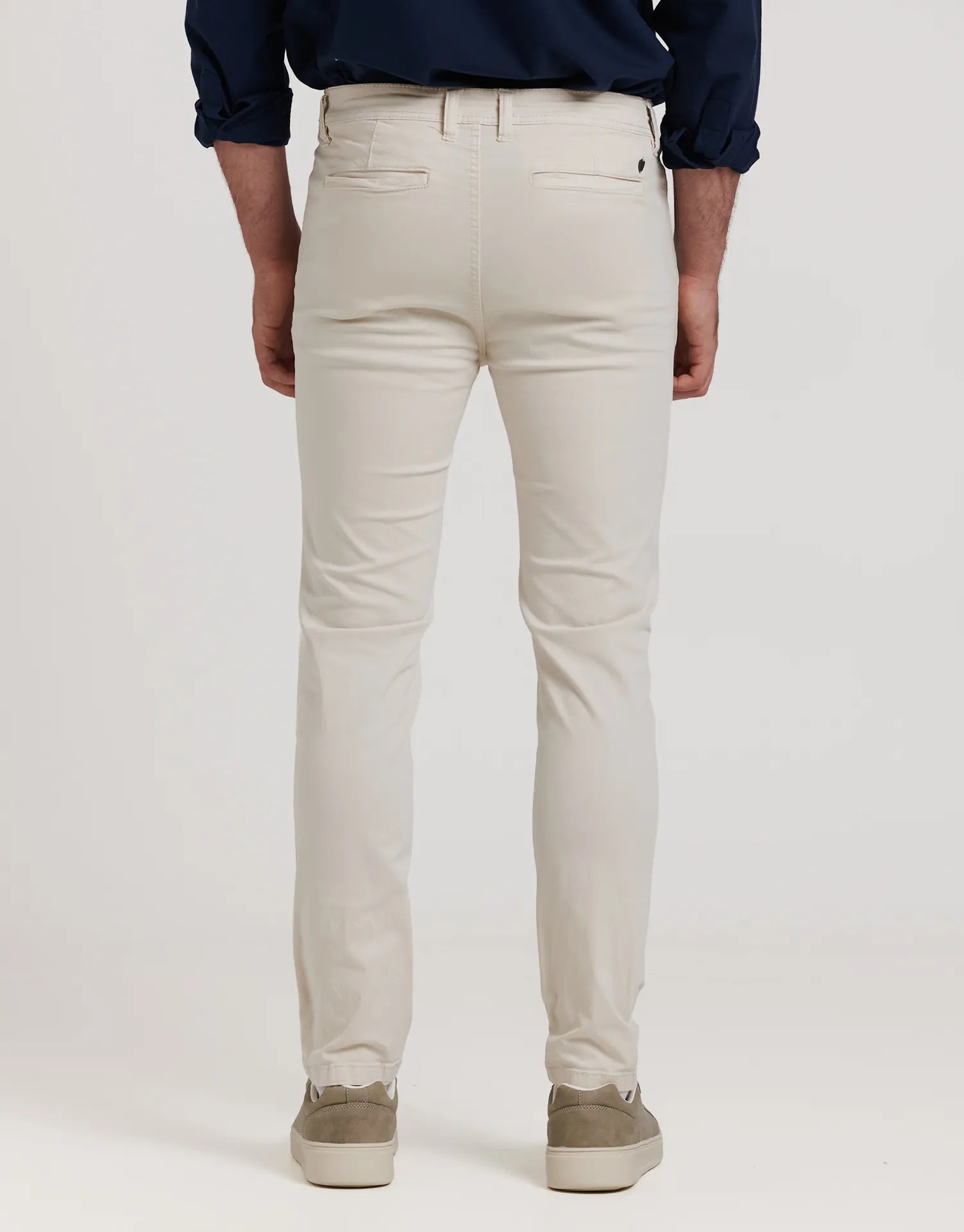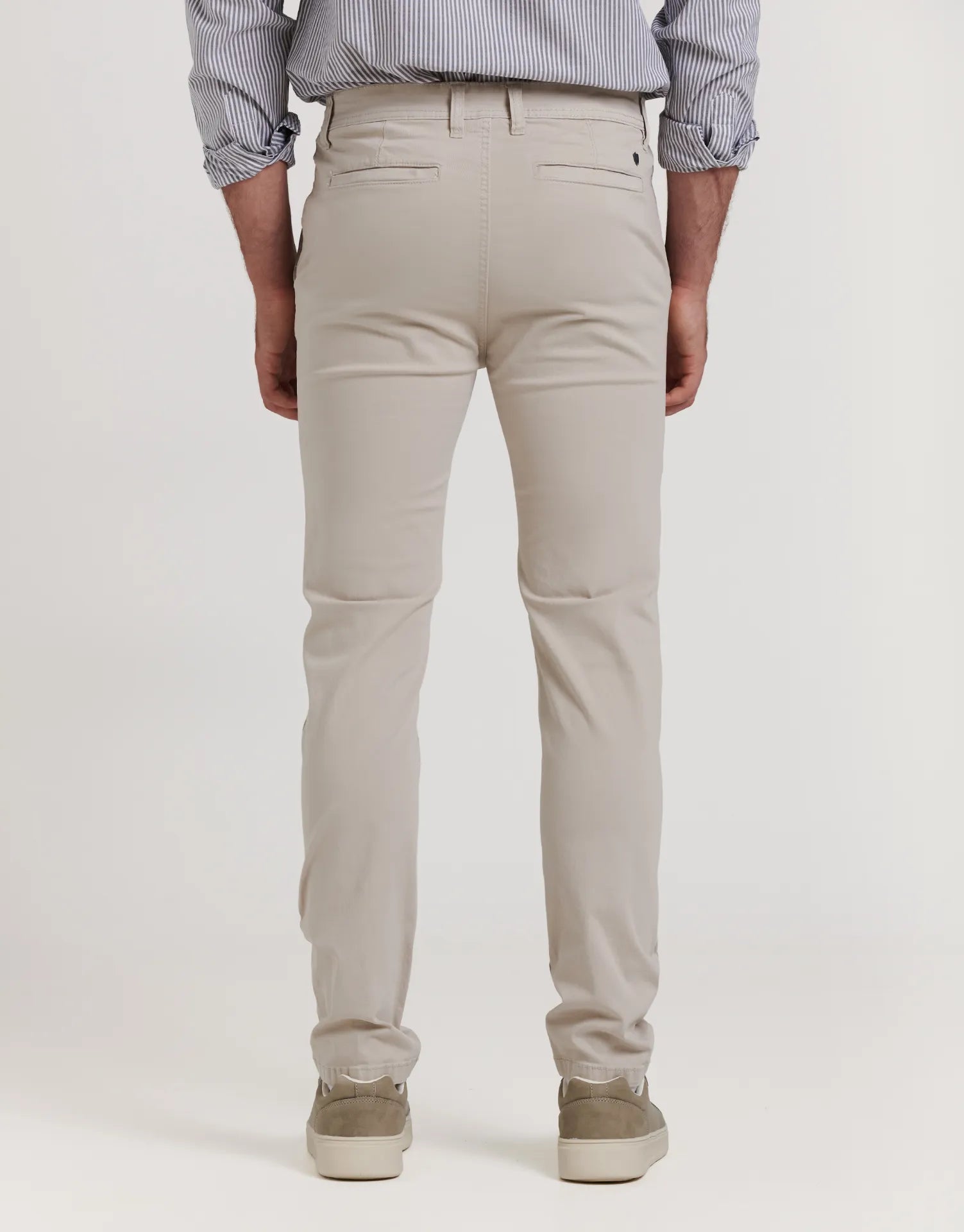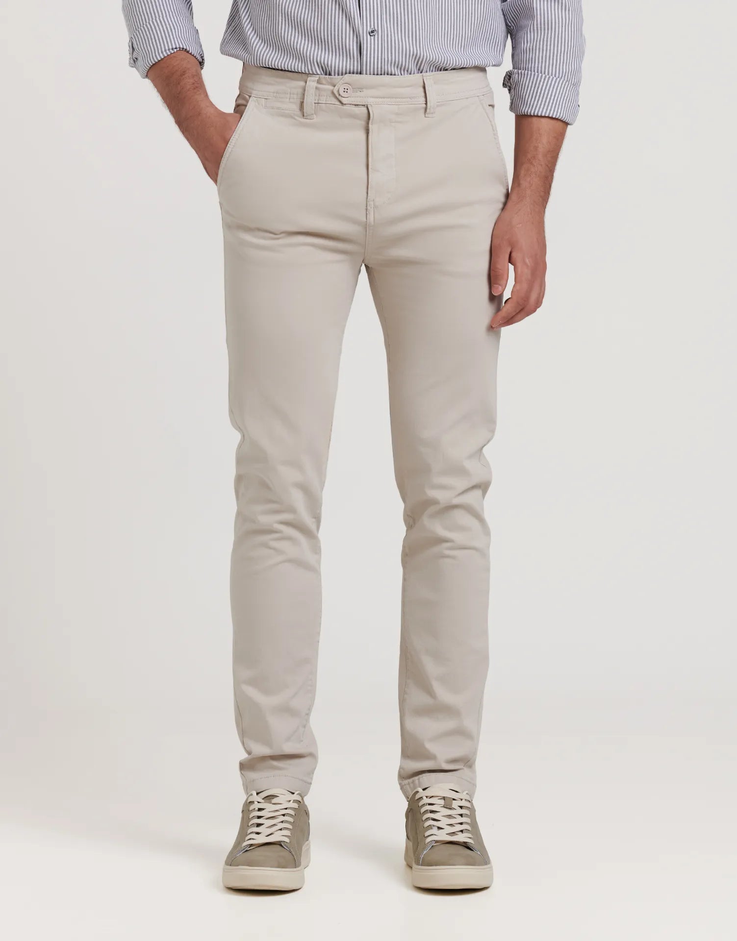 Este pantalón chino es un básico imprescindible en el armario masculino. Con un corte slim que se ajusta al cuerpo sin perder libertad de movimiento, ofrece un equilibrio perfecto entre elegancia y comodidad. Está confeccionado en tejido elástico, lo que garantiza un ajuste cómodo durante todo el día.